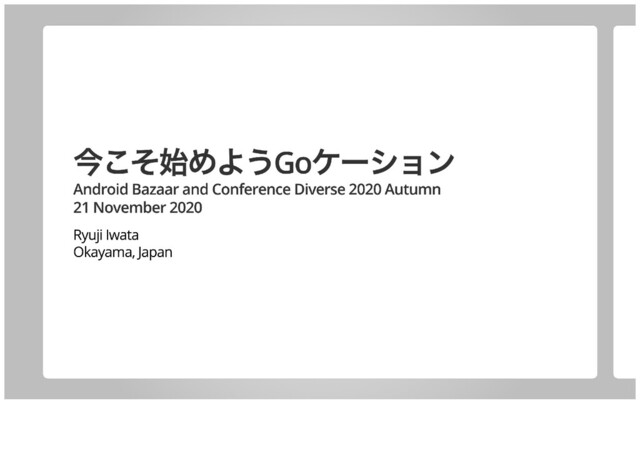 2020年11月21日に香川県&オンラインで開催された「Android Bazaar and Conference Diverse 2020 Autumn」での私の発表資料「今こそ始めようGoケーション」です。プログラミング言語「Go」についてと始め方を紹介しています。オリジナル版:https://talks.godoc.org/github.com/qt-luigi/talks/2020/abcd2020a.slide#1