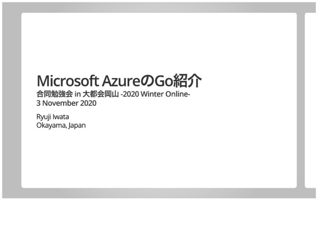 2020年11月3日にオンラインで開催された「合同勉強会 in 大都会岡山 -2020 Winter Online-」での私の発表資料「Microsoft AzureのGo紹介」です。最新に近い日本のMicrosoftとAzureの情報(と少しGo)を紹介しています。オリジナル版:https://talks.godoc.org/github.com/qt-luigi/talks/2020/gbdaitokai2020winter.slide#1