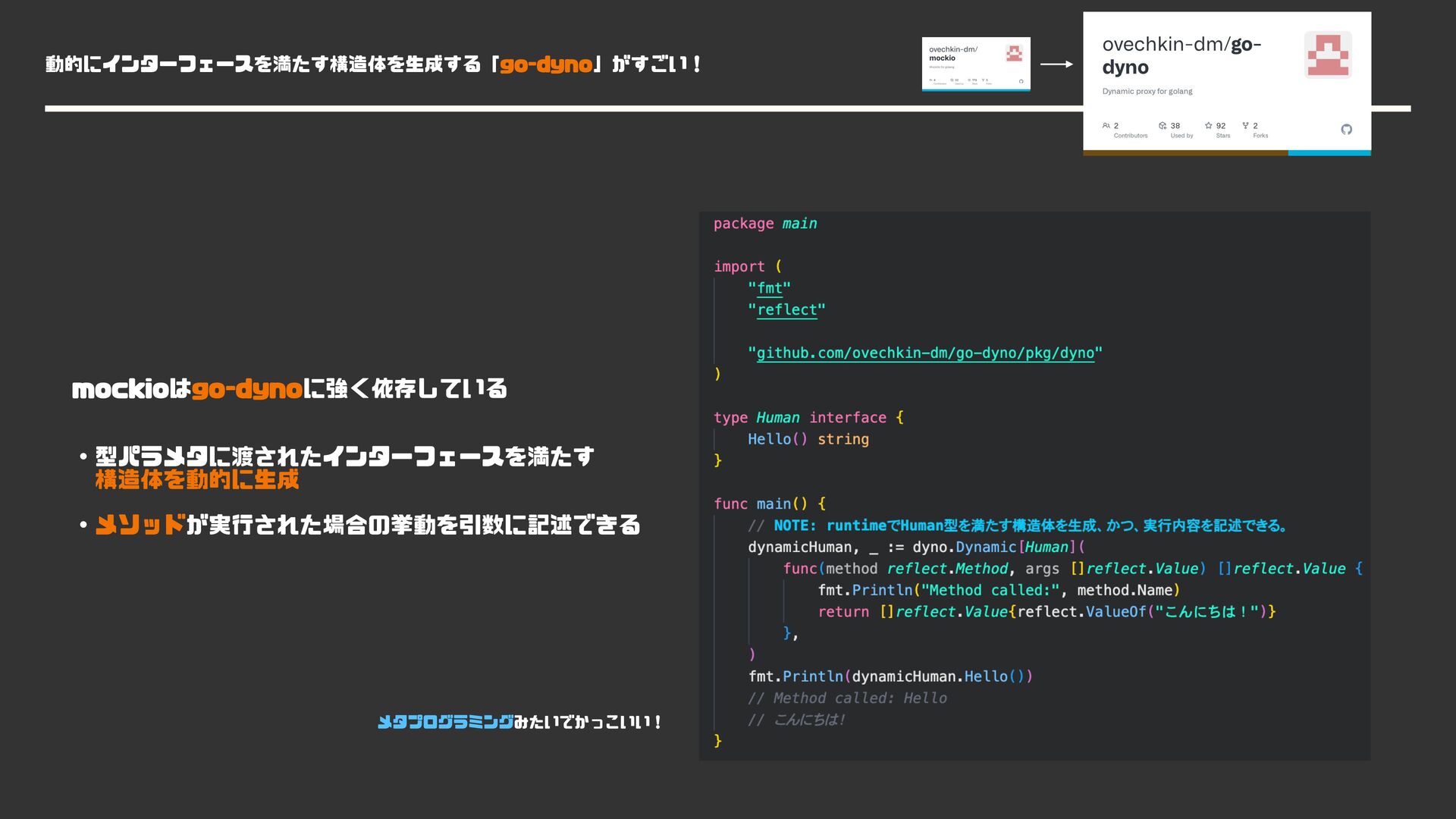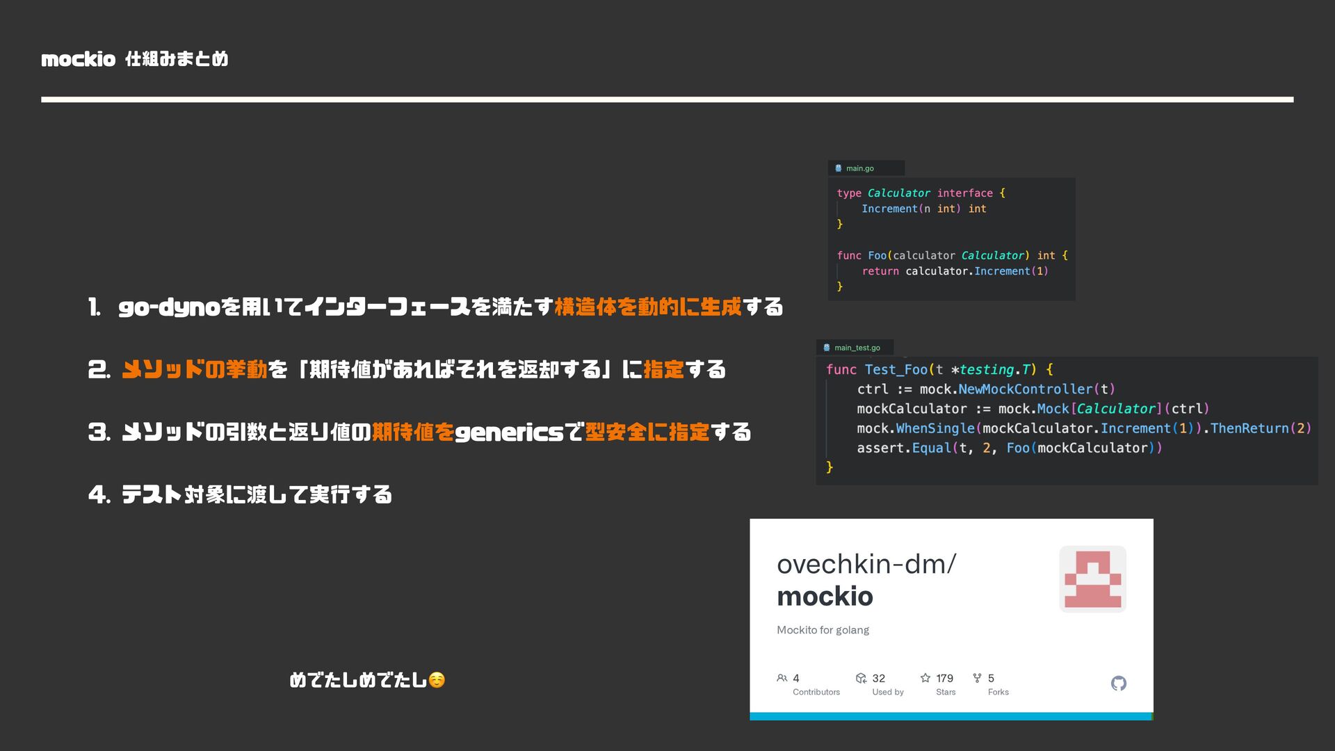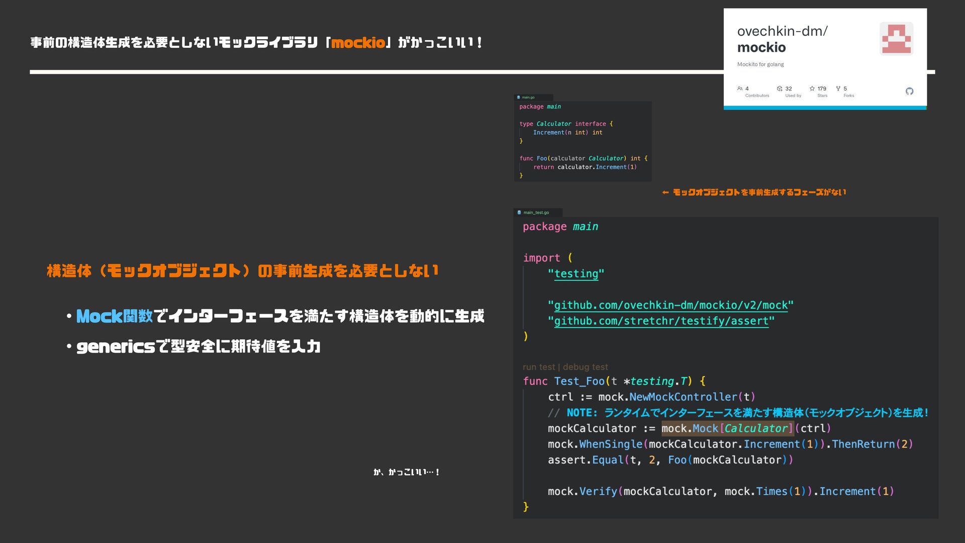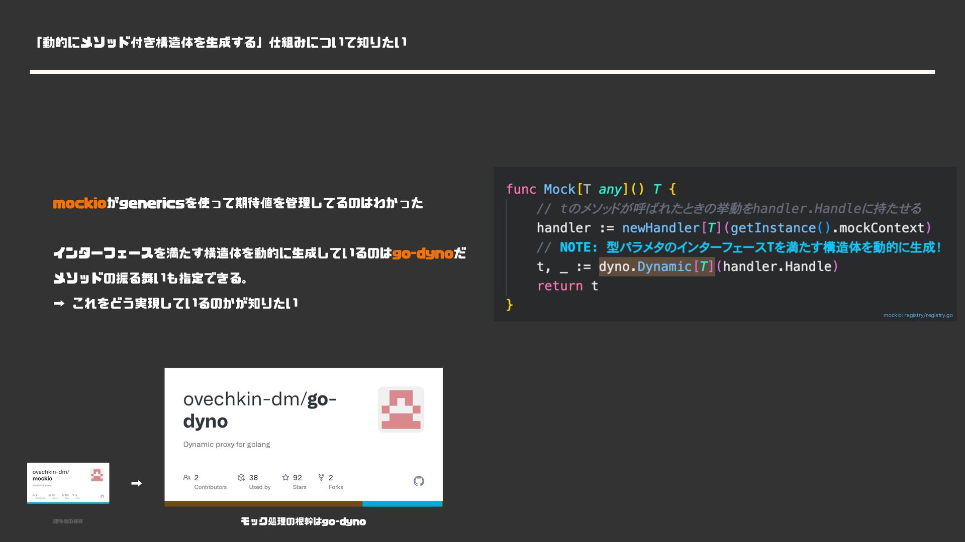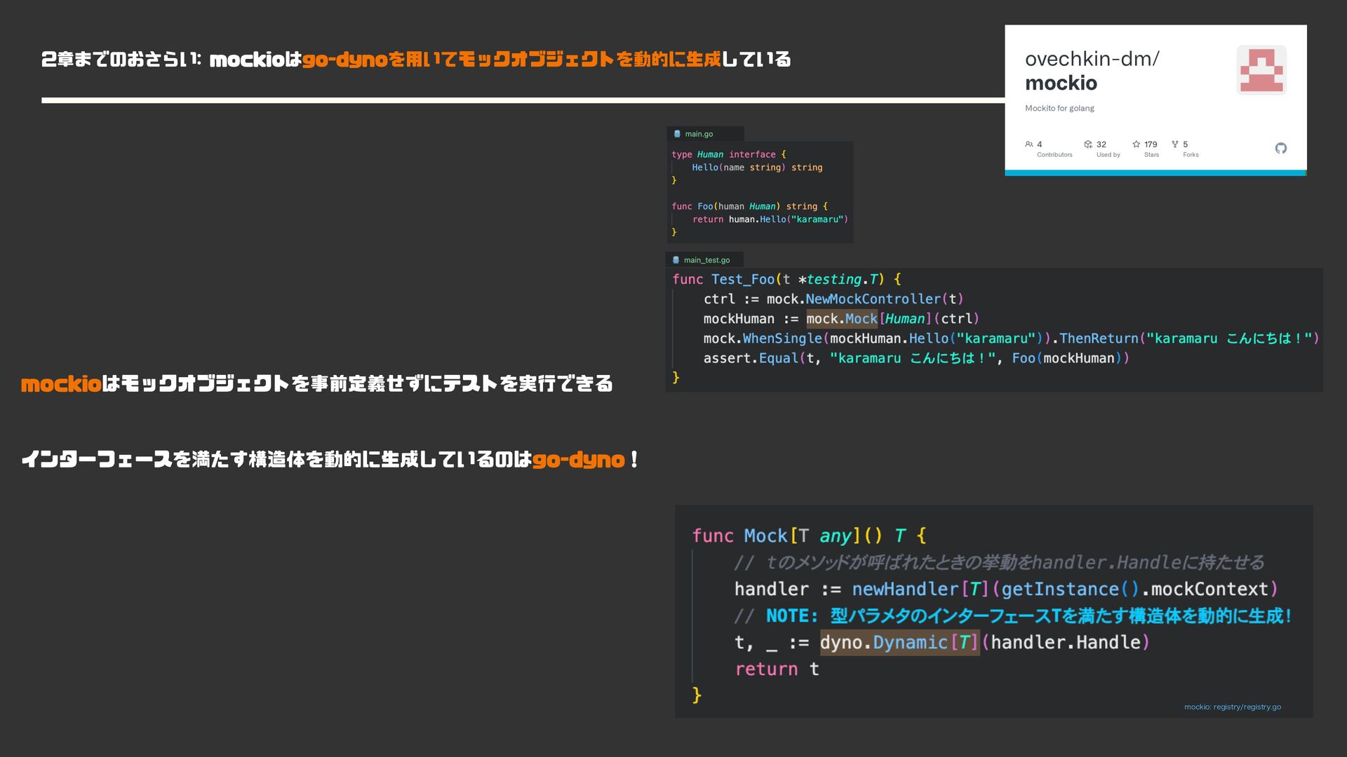 本セッションでは、コード生成を必要とせずランタイムでモック処理を実現するovechkin-dm/mockio[1]というライブラリを取り上げ、Go言語におけるメタプログラミングの手法について解説します。