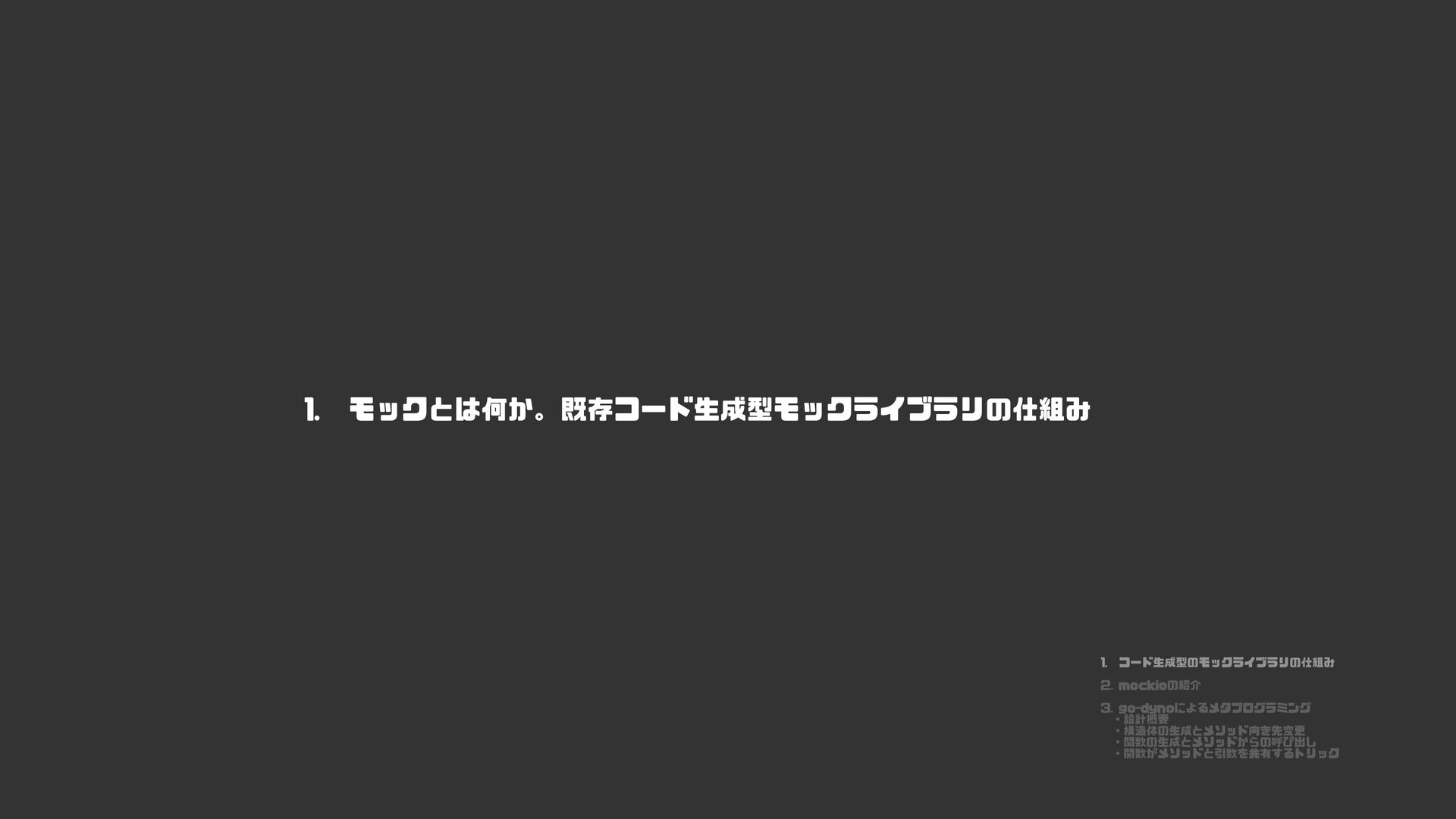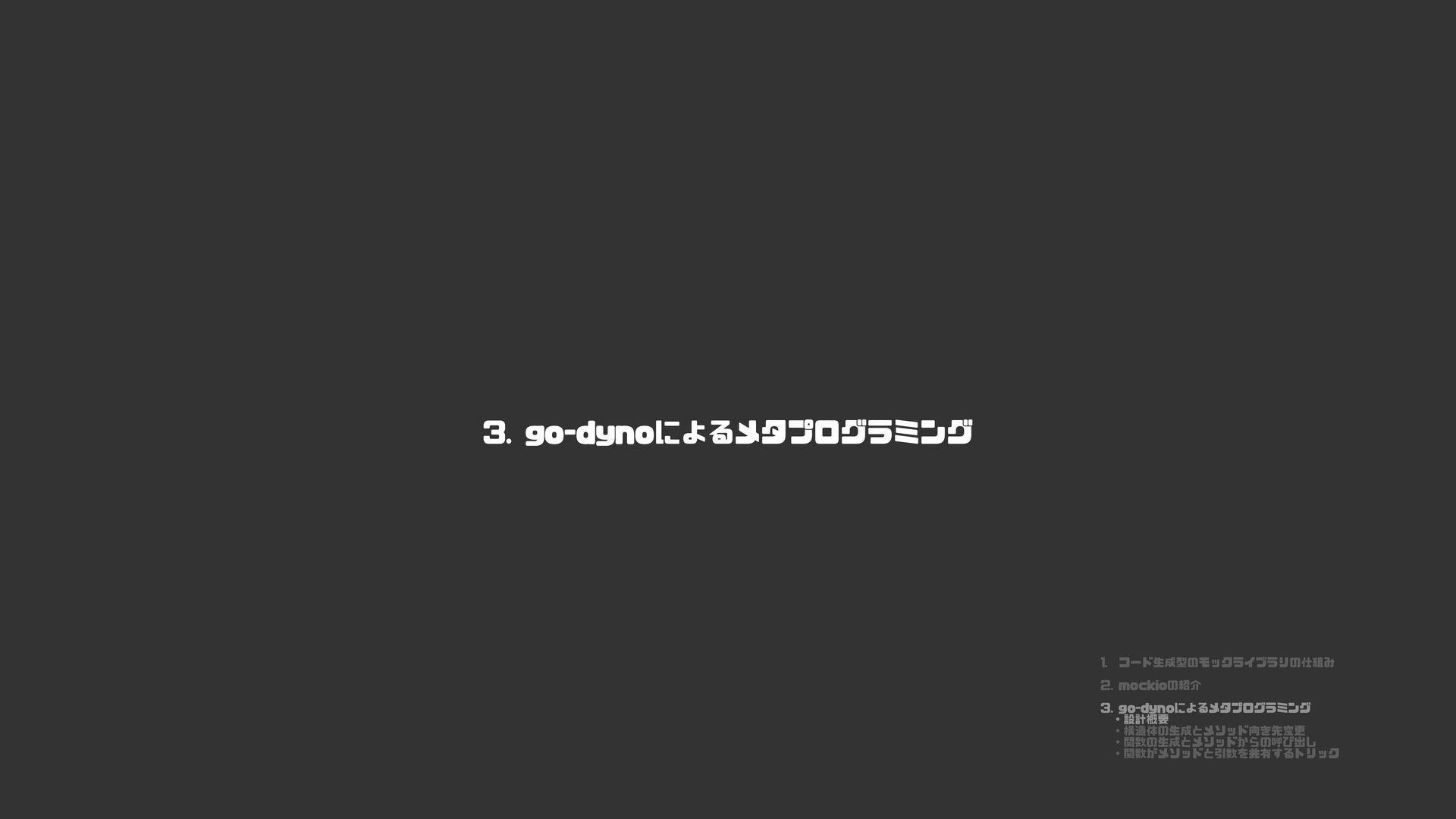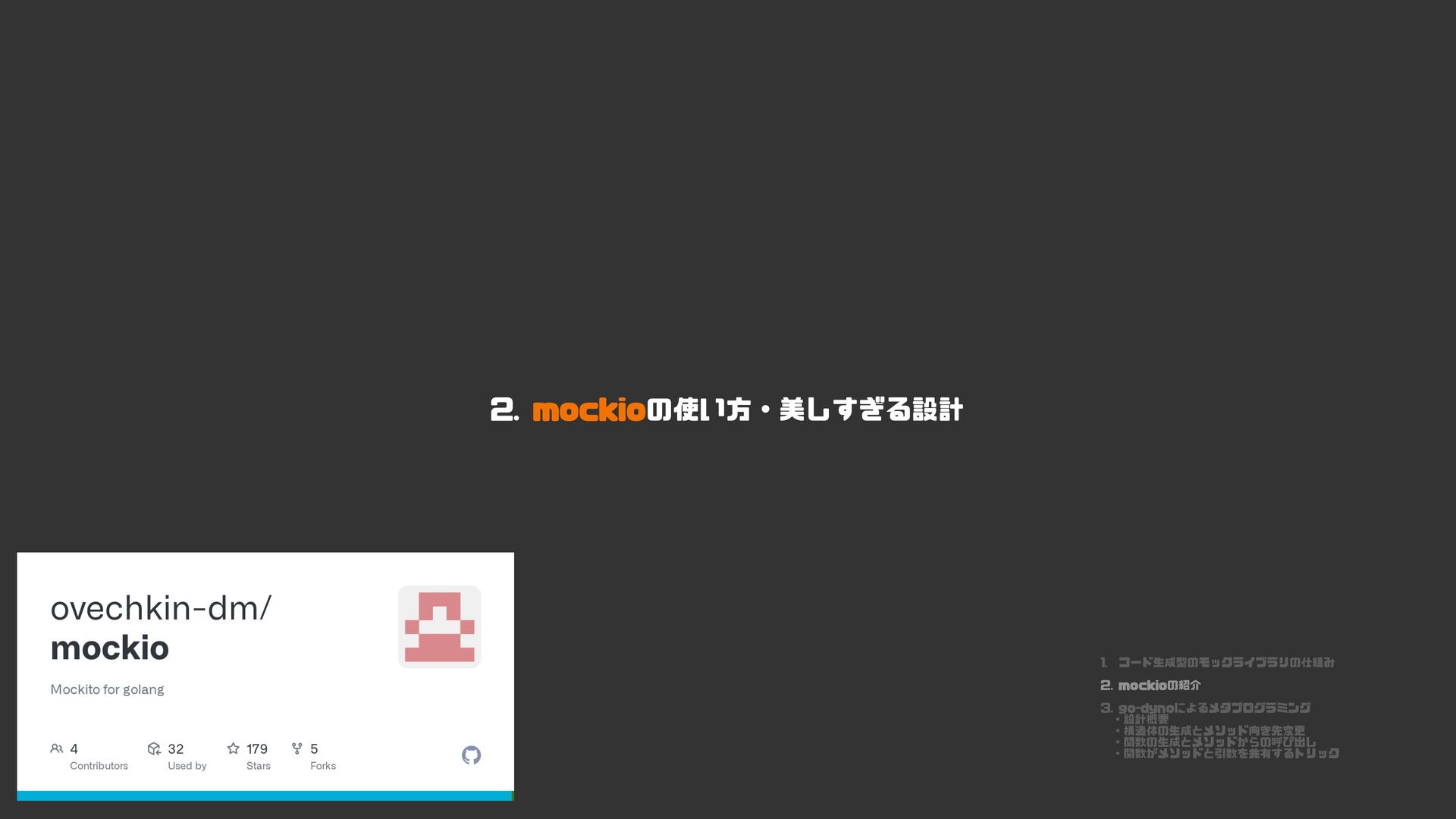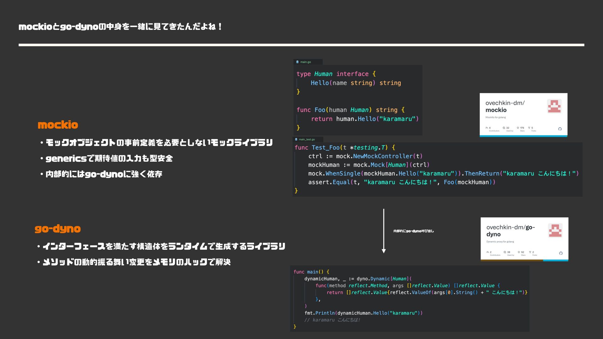 本セッションでは、コード生成を必要とせずランタイムでモック処理を実現するovechkin-dm/mockio[1]というライブラリを取り上げ、Go言語におけるメタプログラミングの手法について解説します。