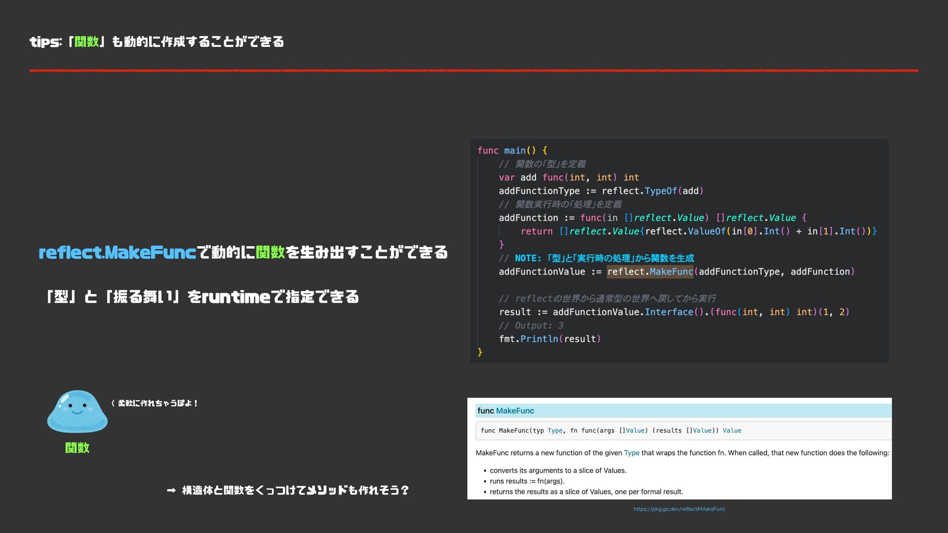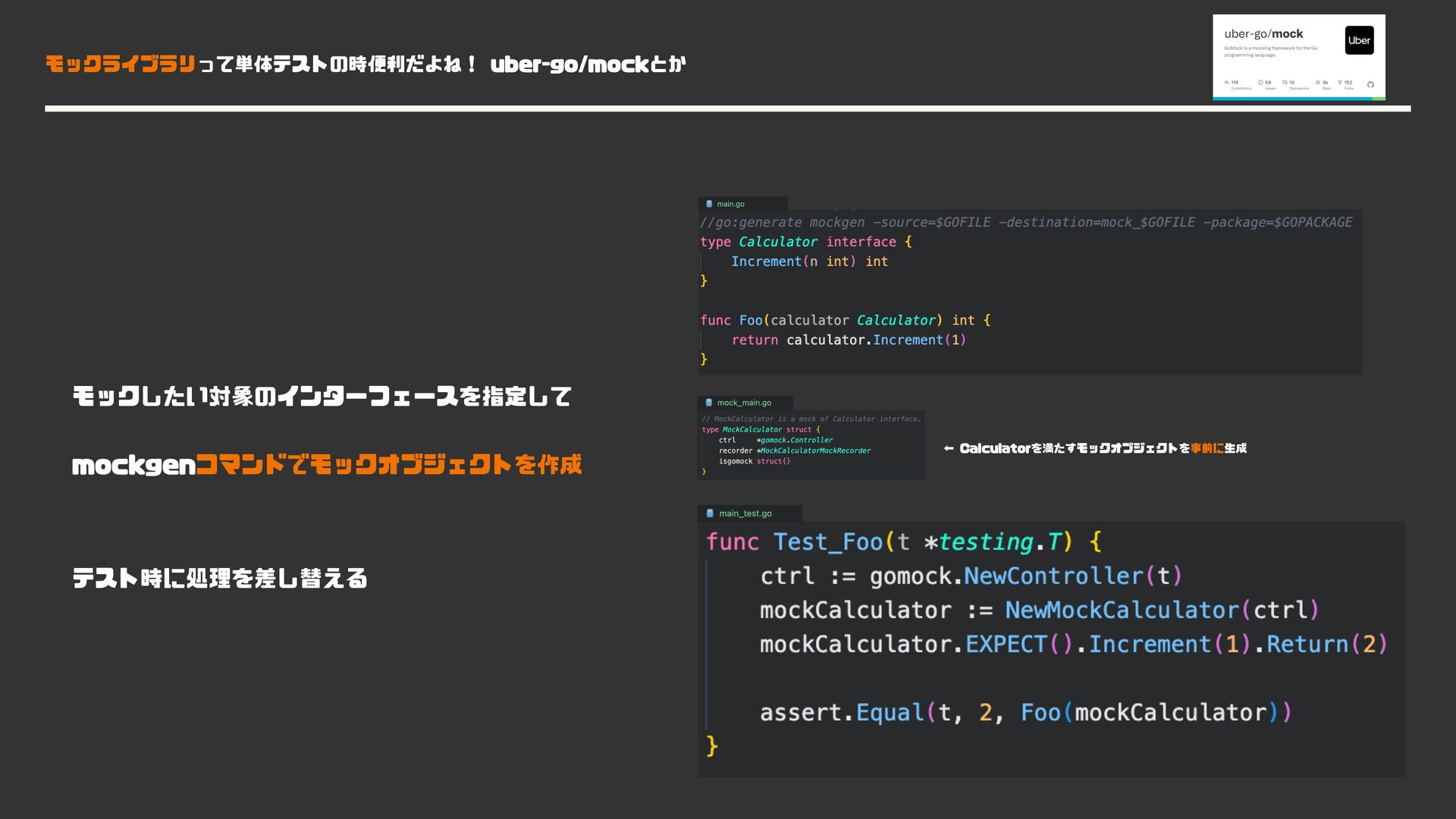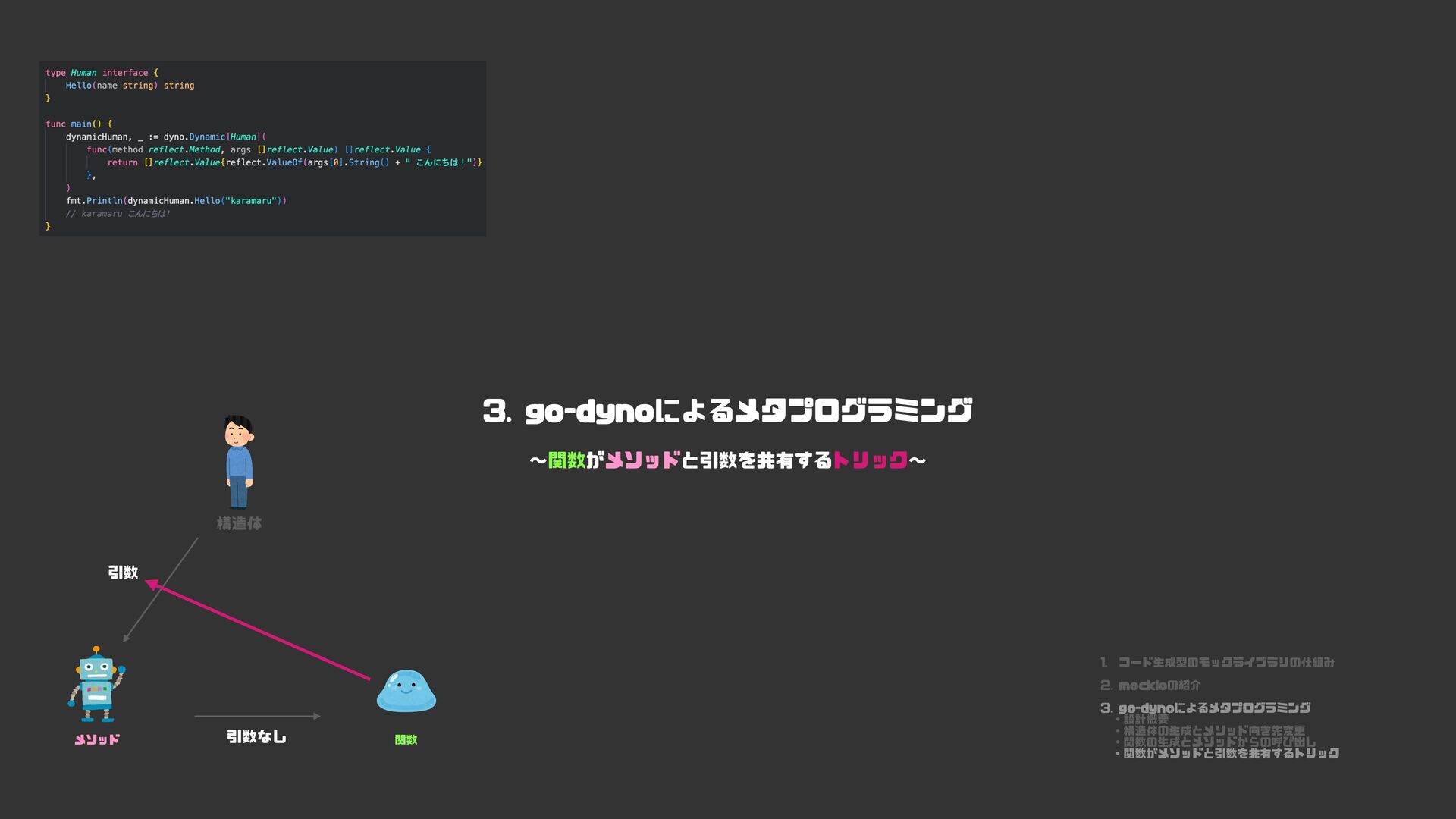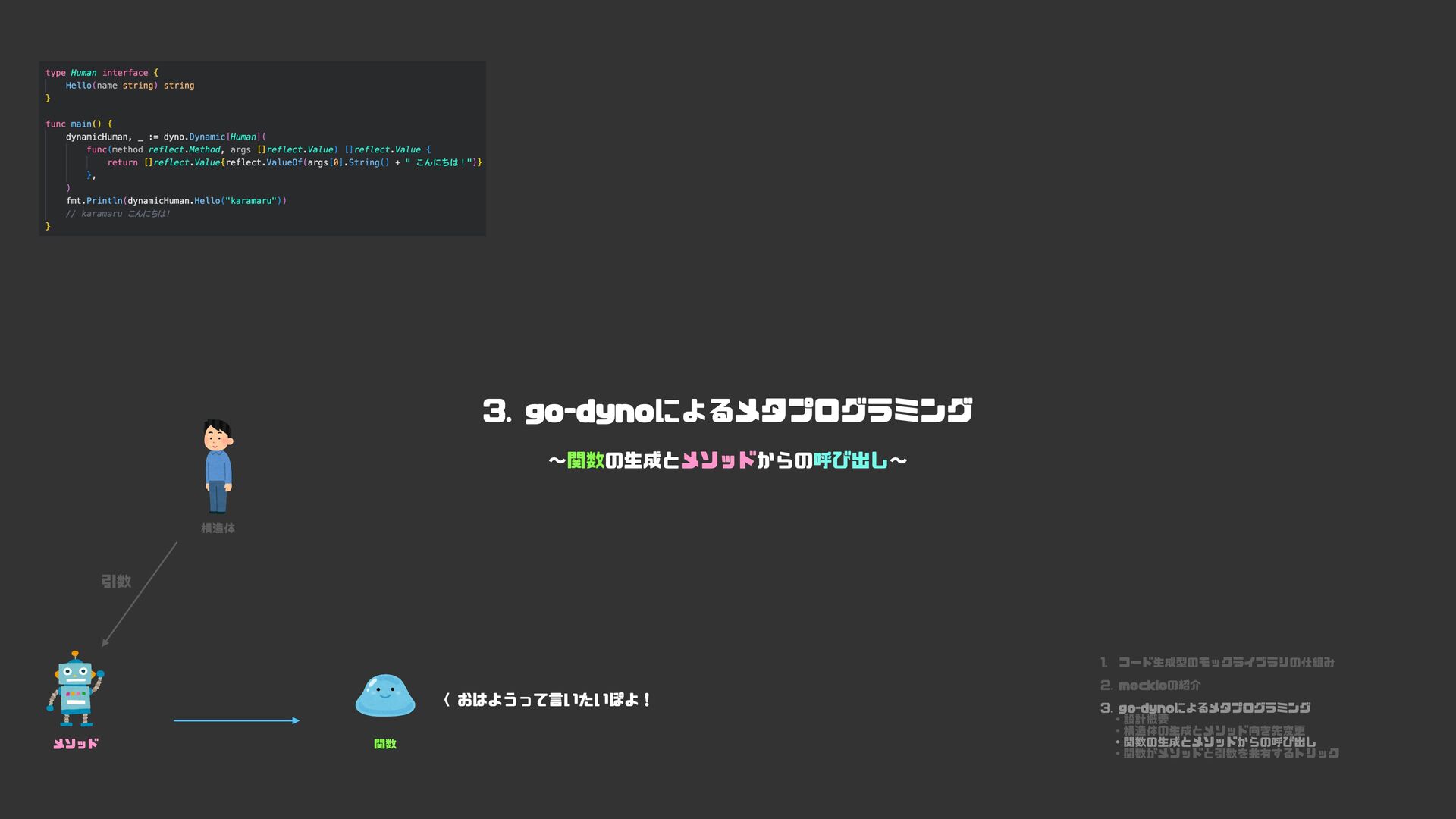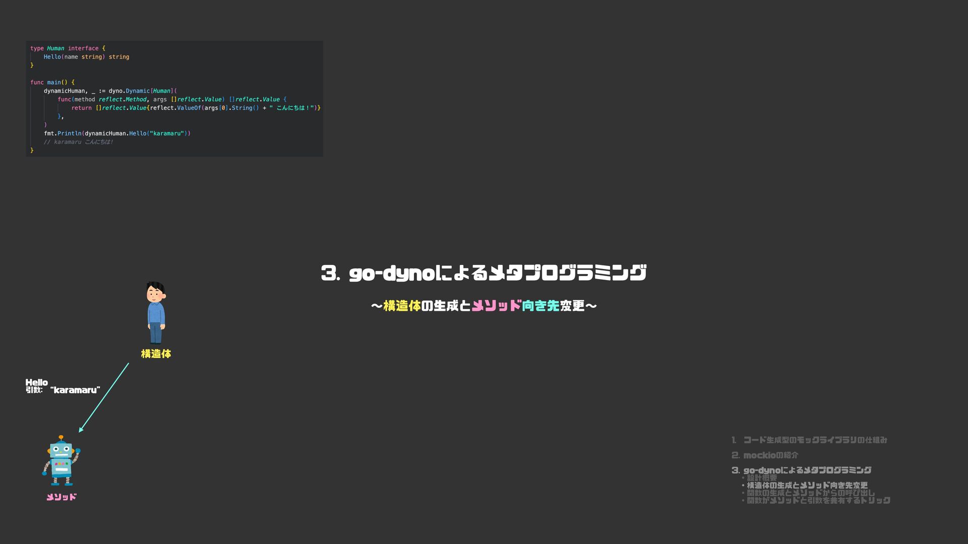 本セッションでは、コード生成を必要とせずランタイムでモック処理を実現するovechkin-dm/mockio[1]というライブラリを取り上げ、Go言語におけるメタプログラミングの手法について解説します。