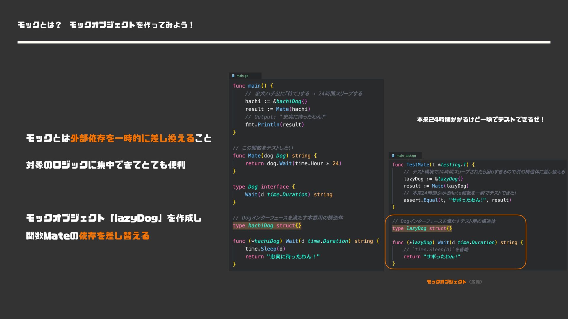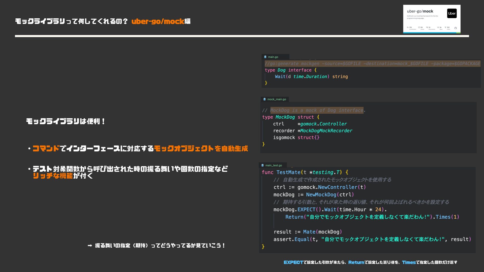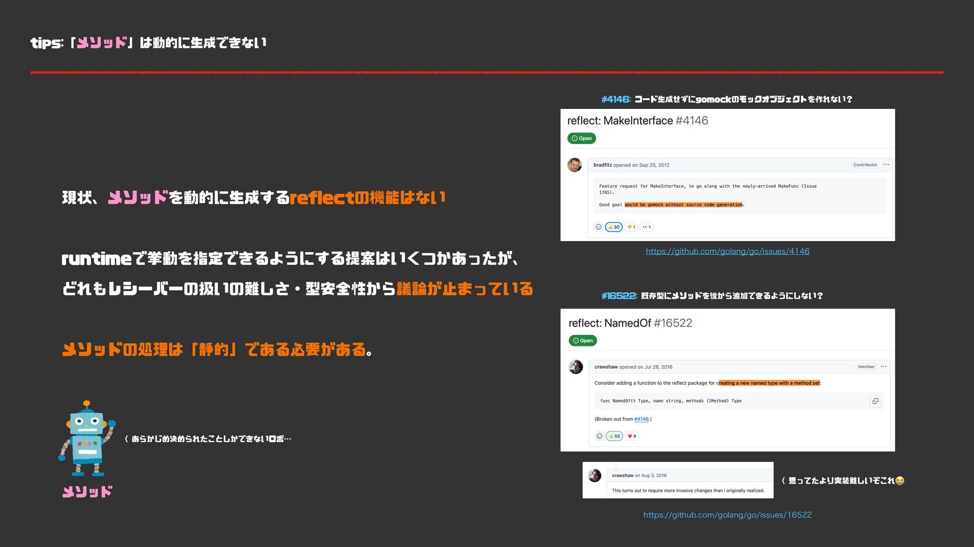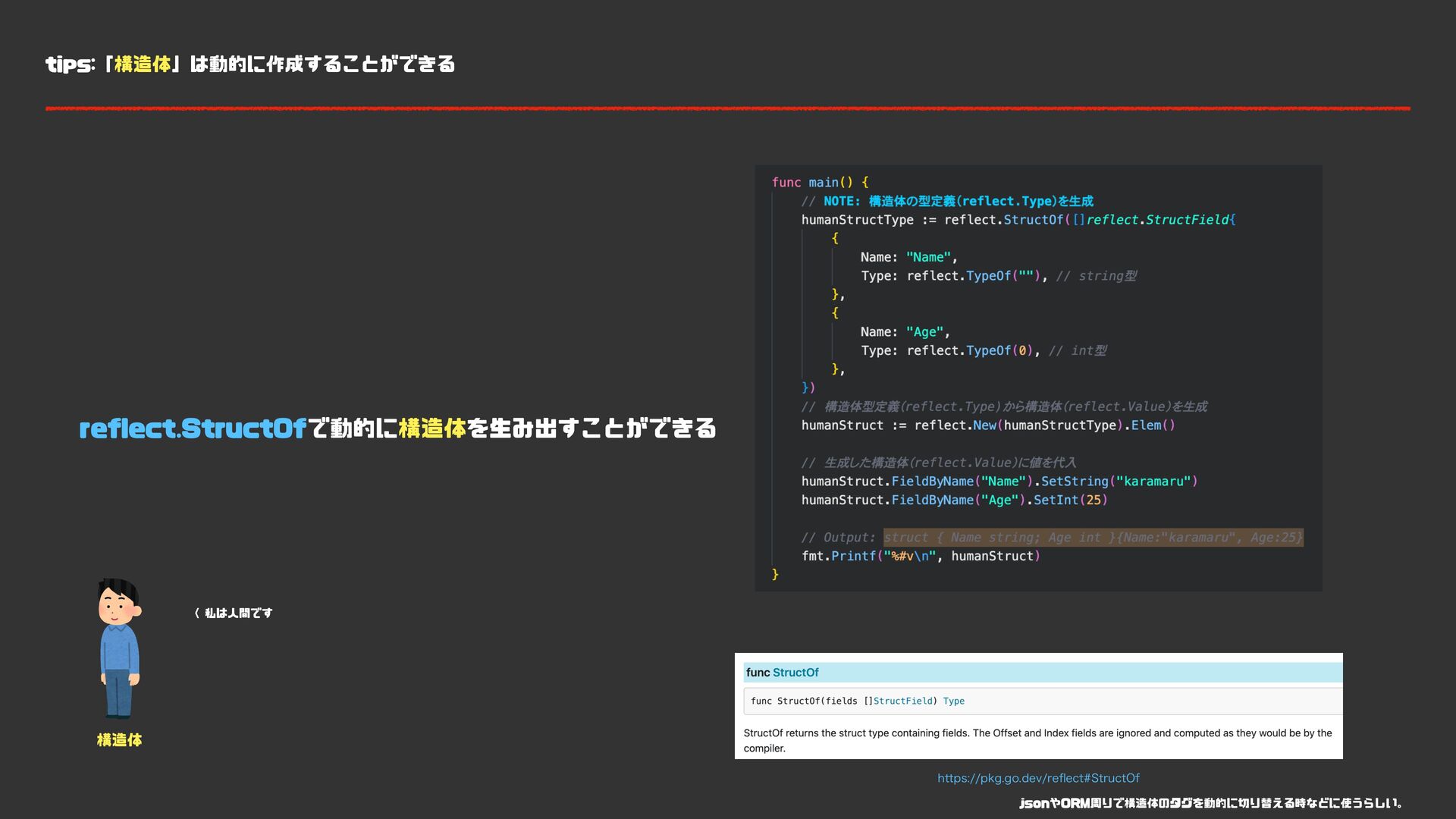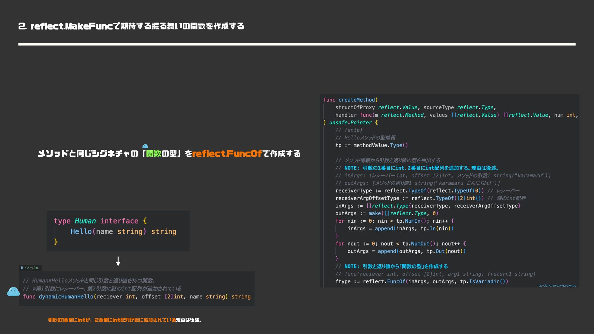 本セッションでは、コード生成を必要とせずランタイムでモック処理を実現するovechkin-dm/mockio[1]というライブラリを取り上げ、Go言語におけるメタプログラミングの手法について解説します。