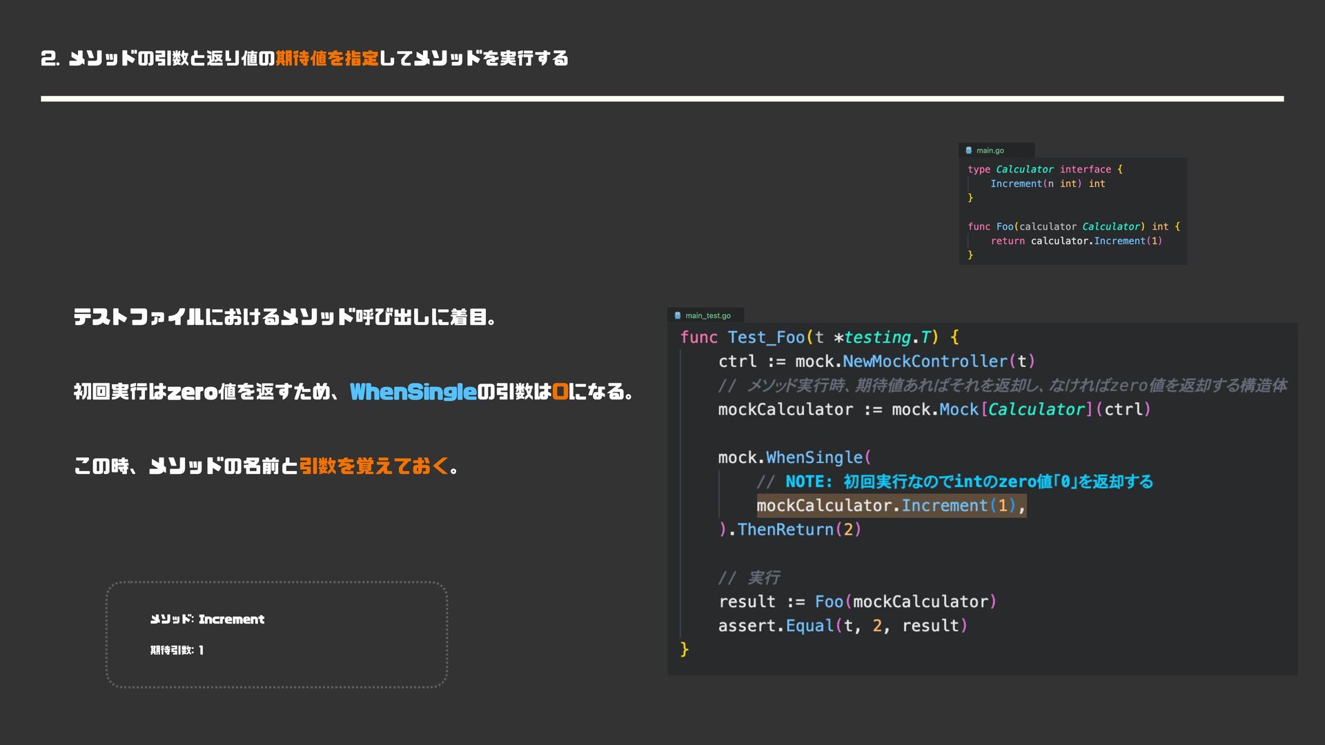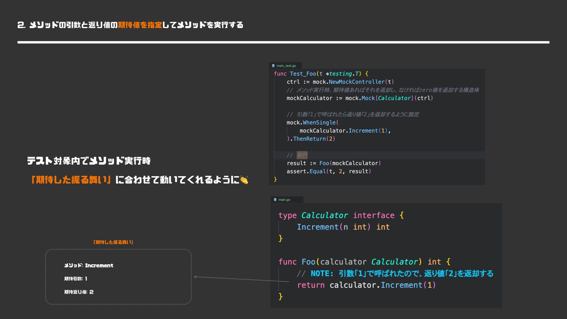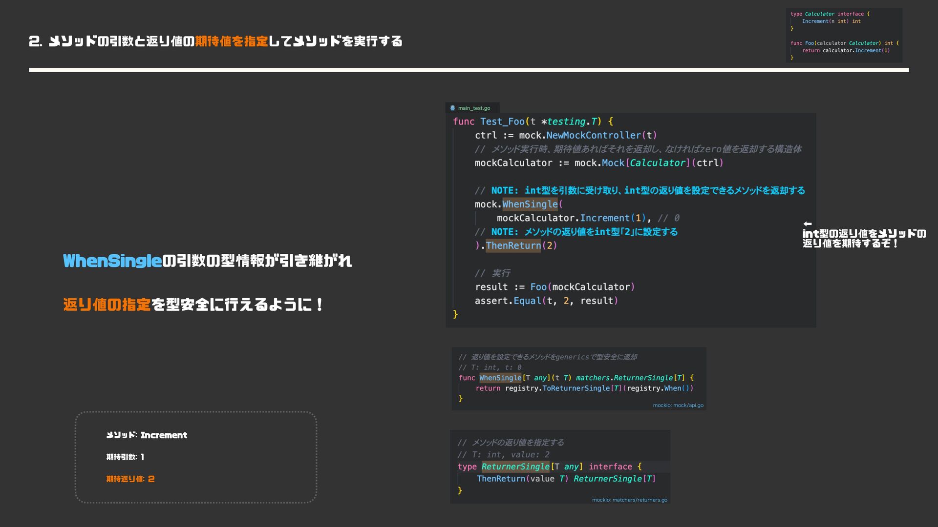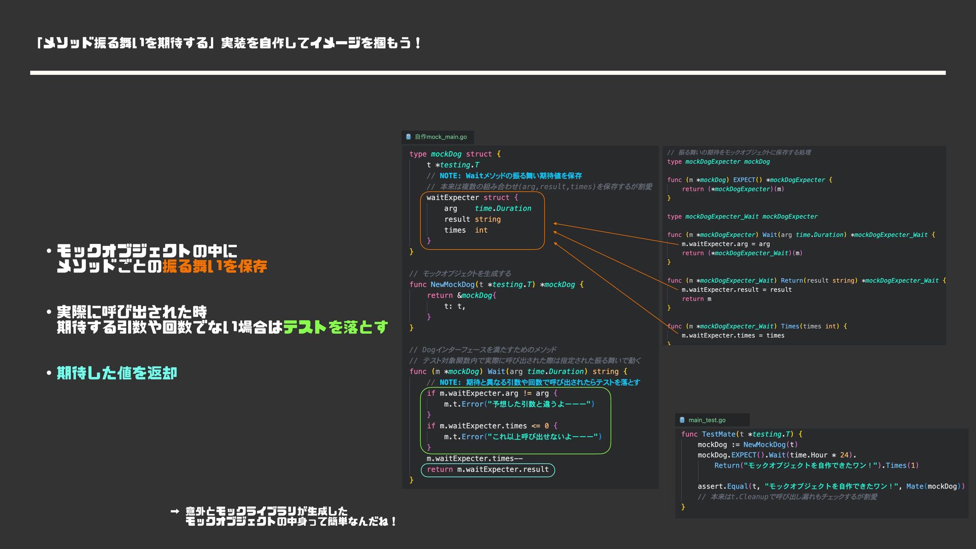 さらに、生成された構造体のメソッド呼び出し時に任意の処理を発火させるプロキシ関数(code2のCalculatorHandler参照)を渡すことが可能で、これがモック処理の肝になります。