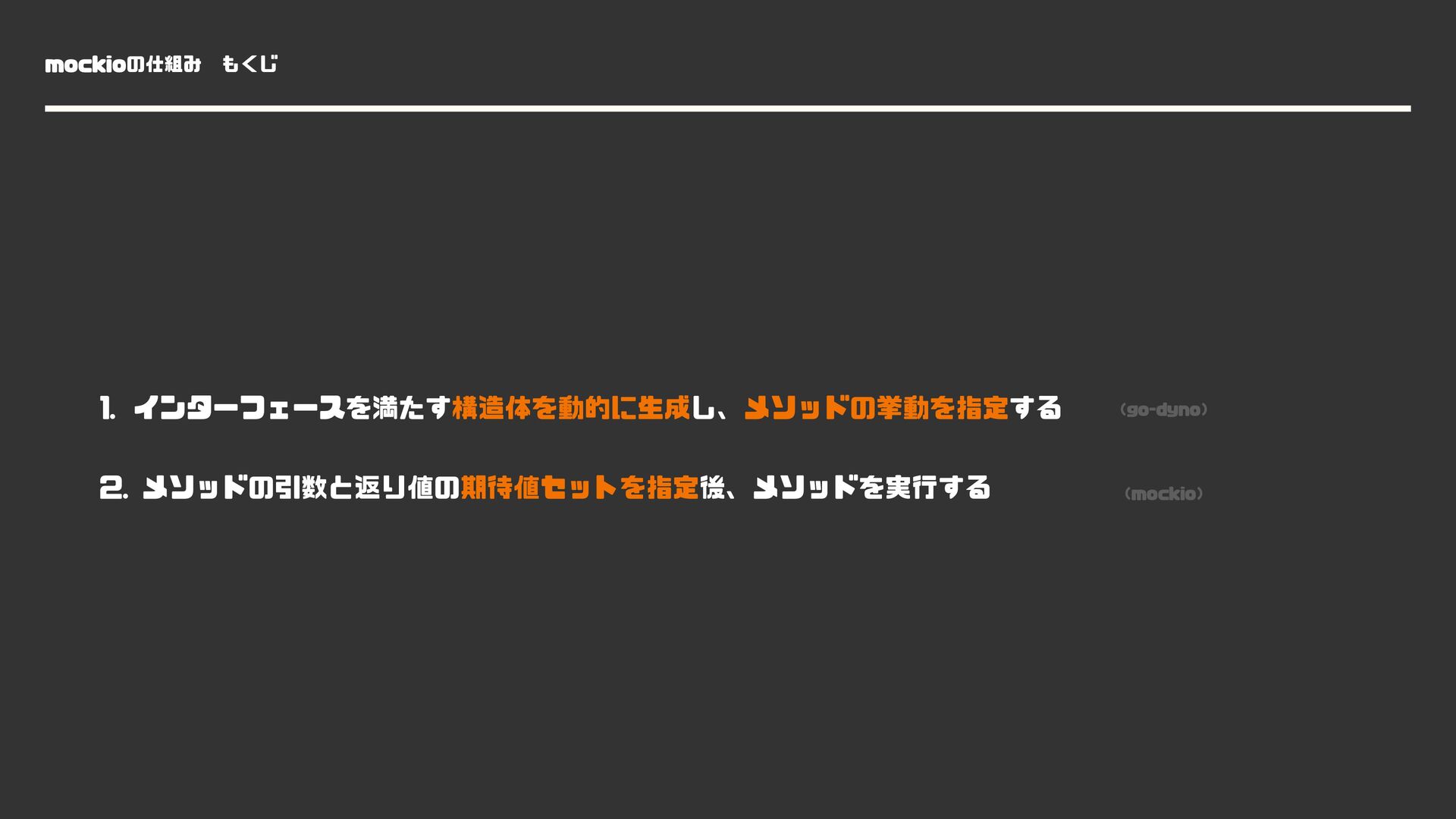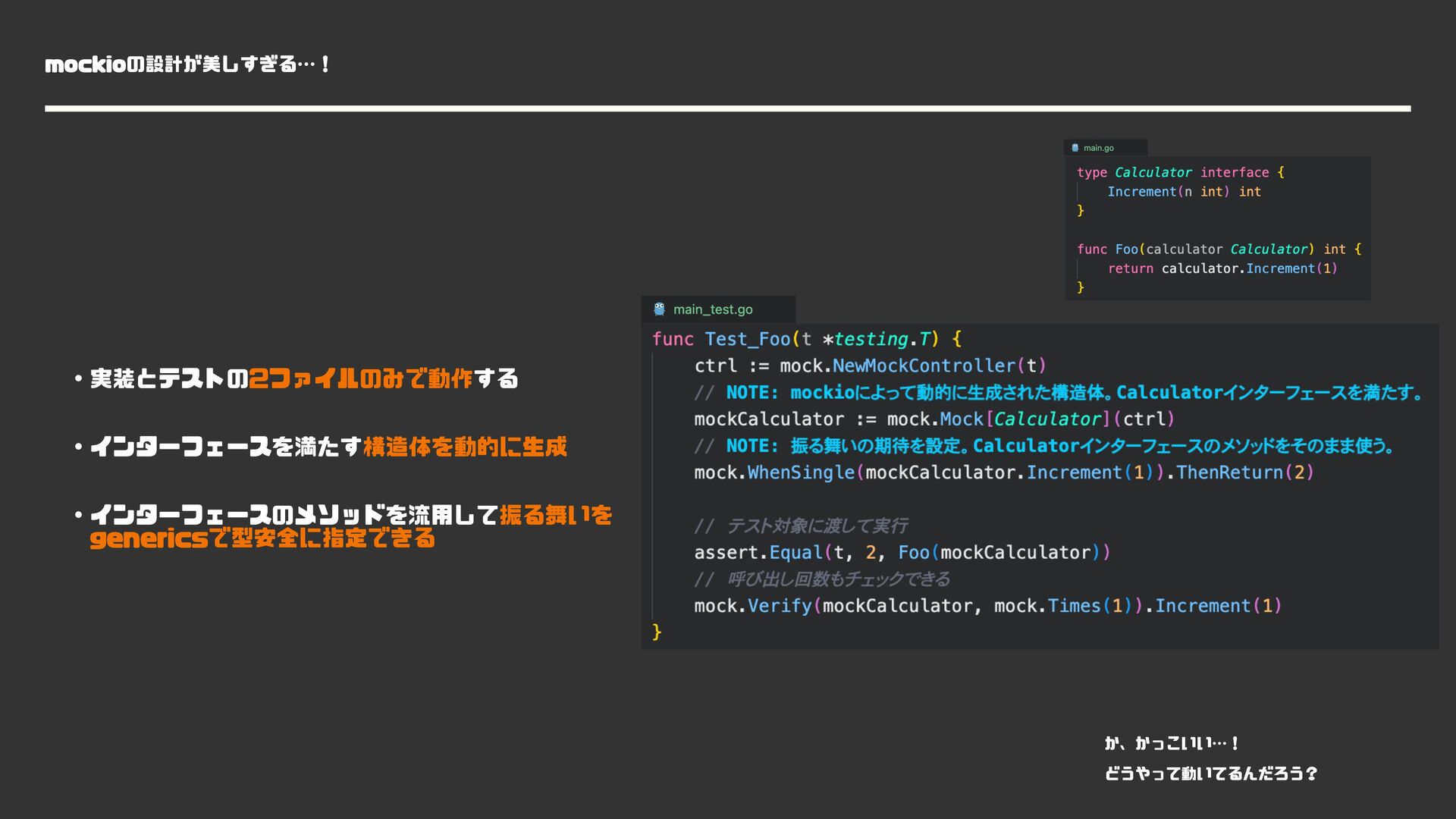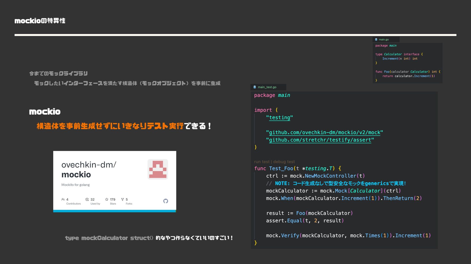 一方、本セッションで取り扱うmockioは、code1に示す通り、コード生成を一切必要とせずに型安全なモック処理を実現する革新的な手法を採用しています。
