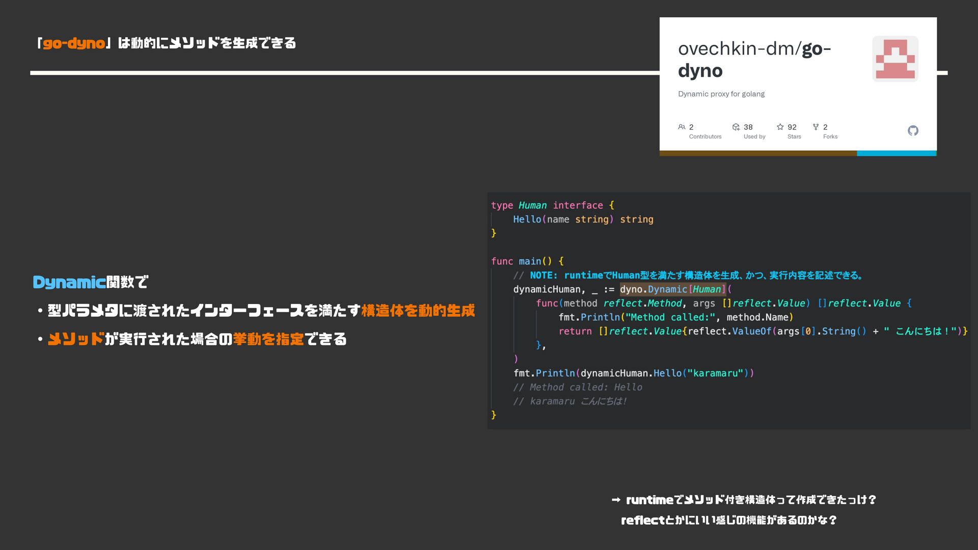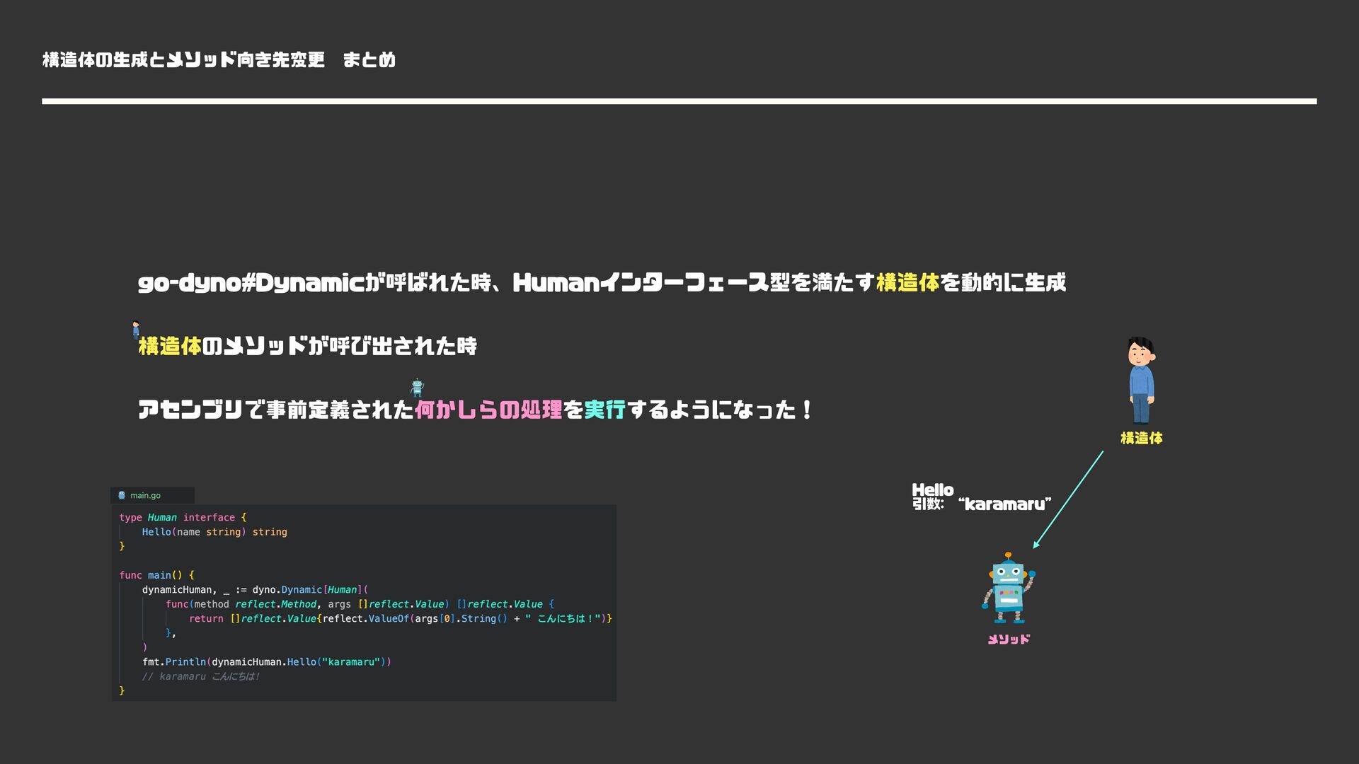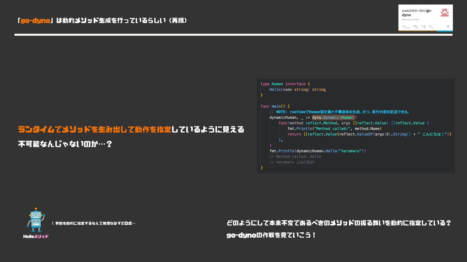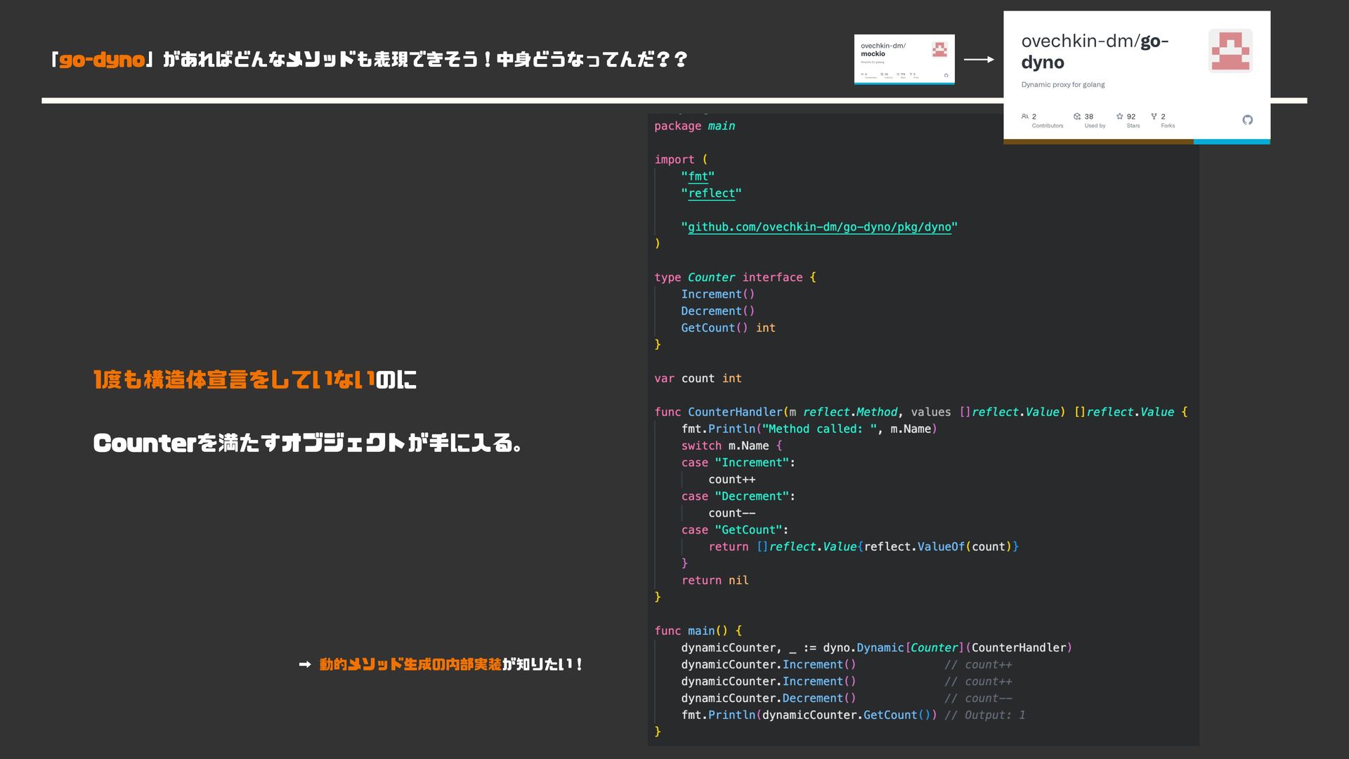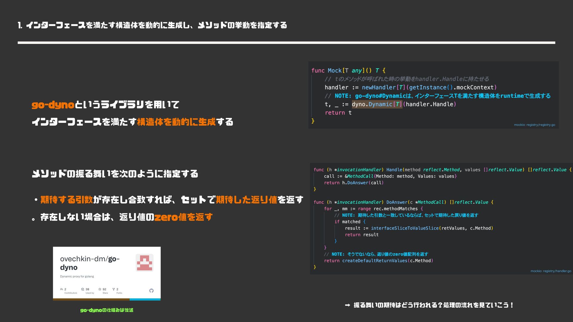 本セッションでは、go-dynoがどのようにしてインターフェースの型情報から、それを満たす構造体を動的に生成しているのか、メソッドの中身を自由に定義することができるのかを深く掘り下げます。