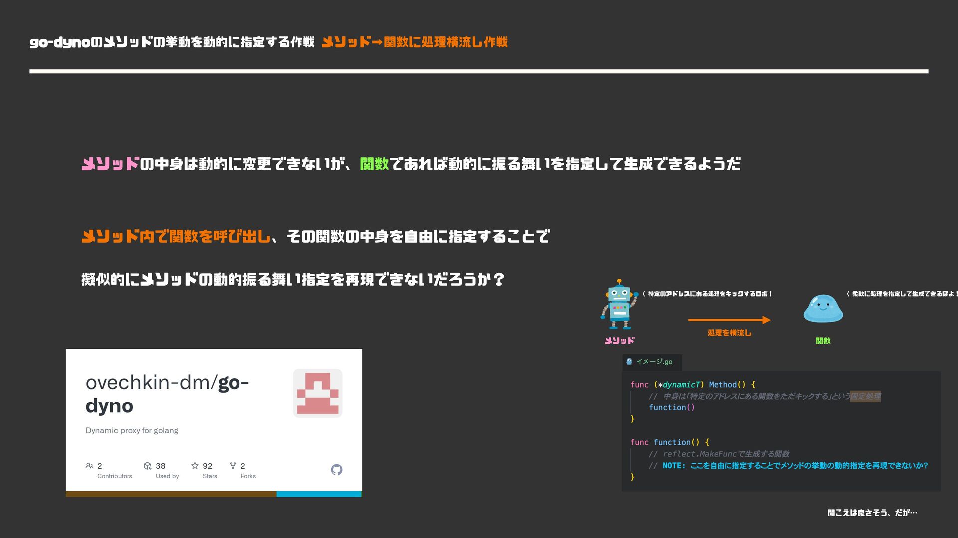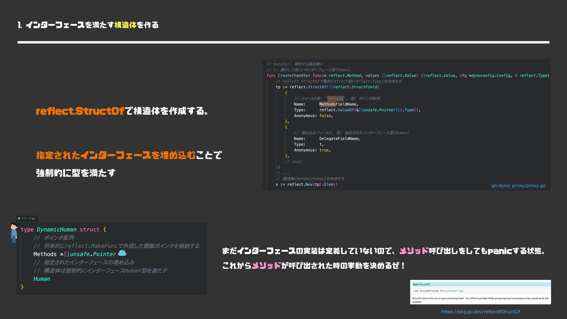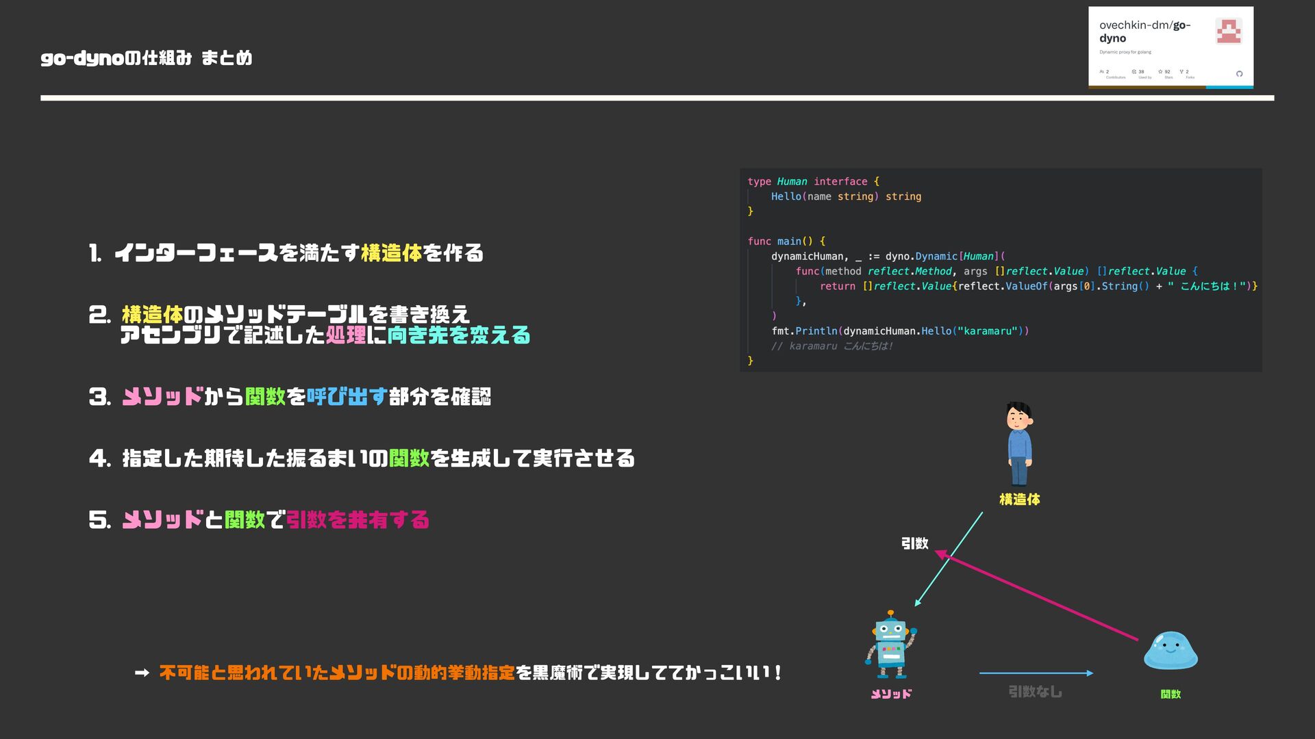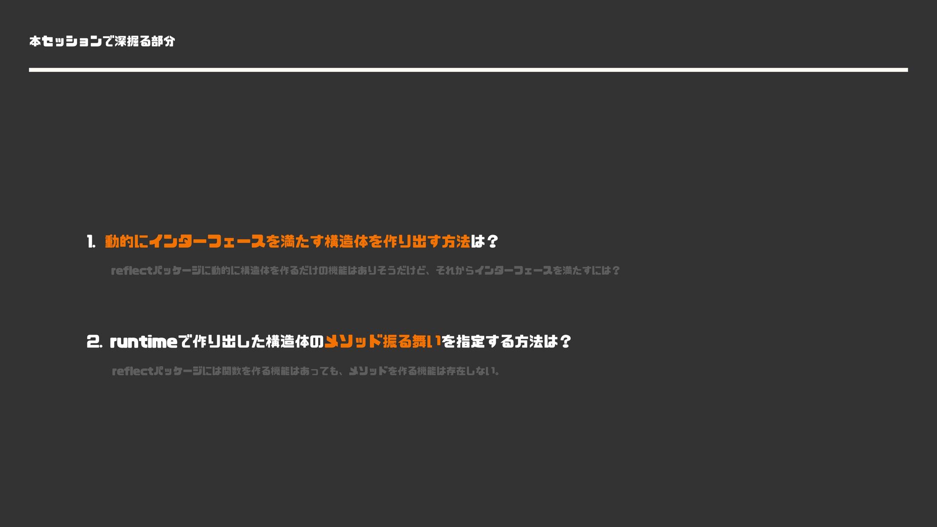 本セッションでは、go-dynoがどのようにしてインターフェースの型情報から、それを満たす構造体を動的に生成しているのか、メソッドの中身を自由に定義することができるのかを深く掘り下げます。
