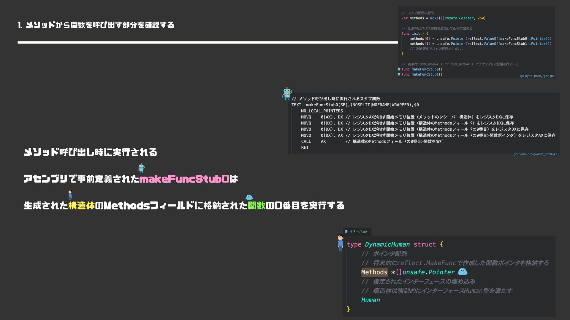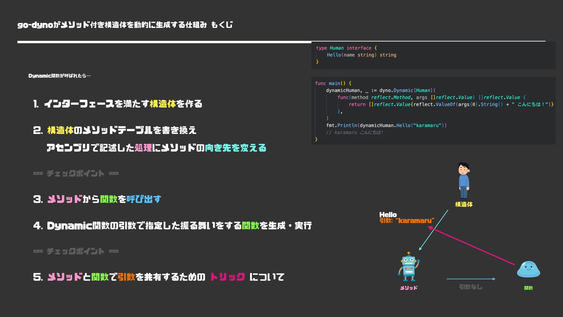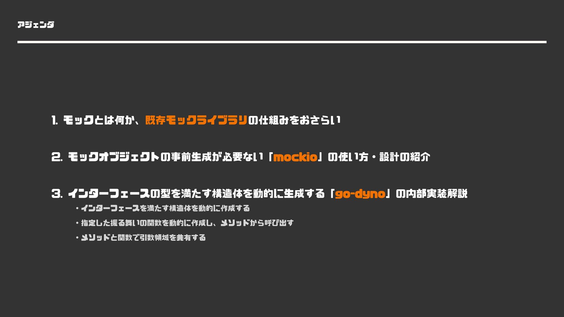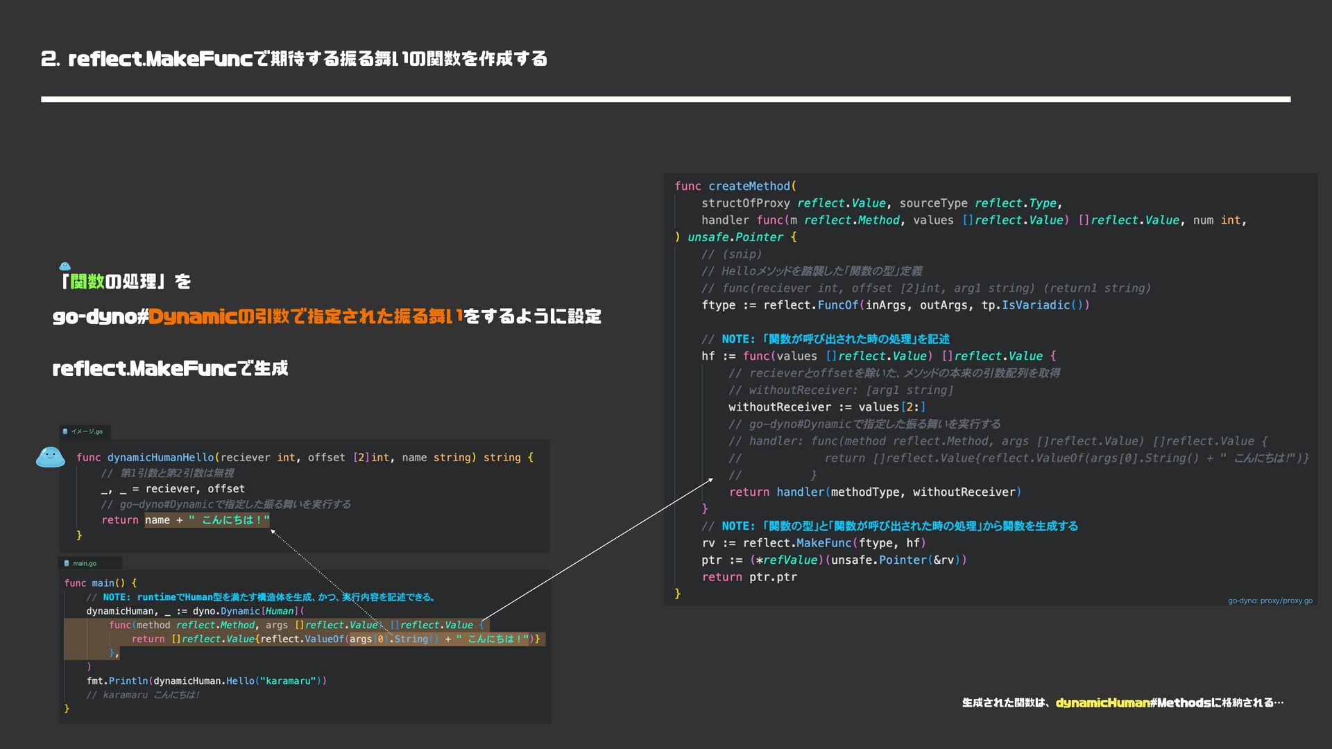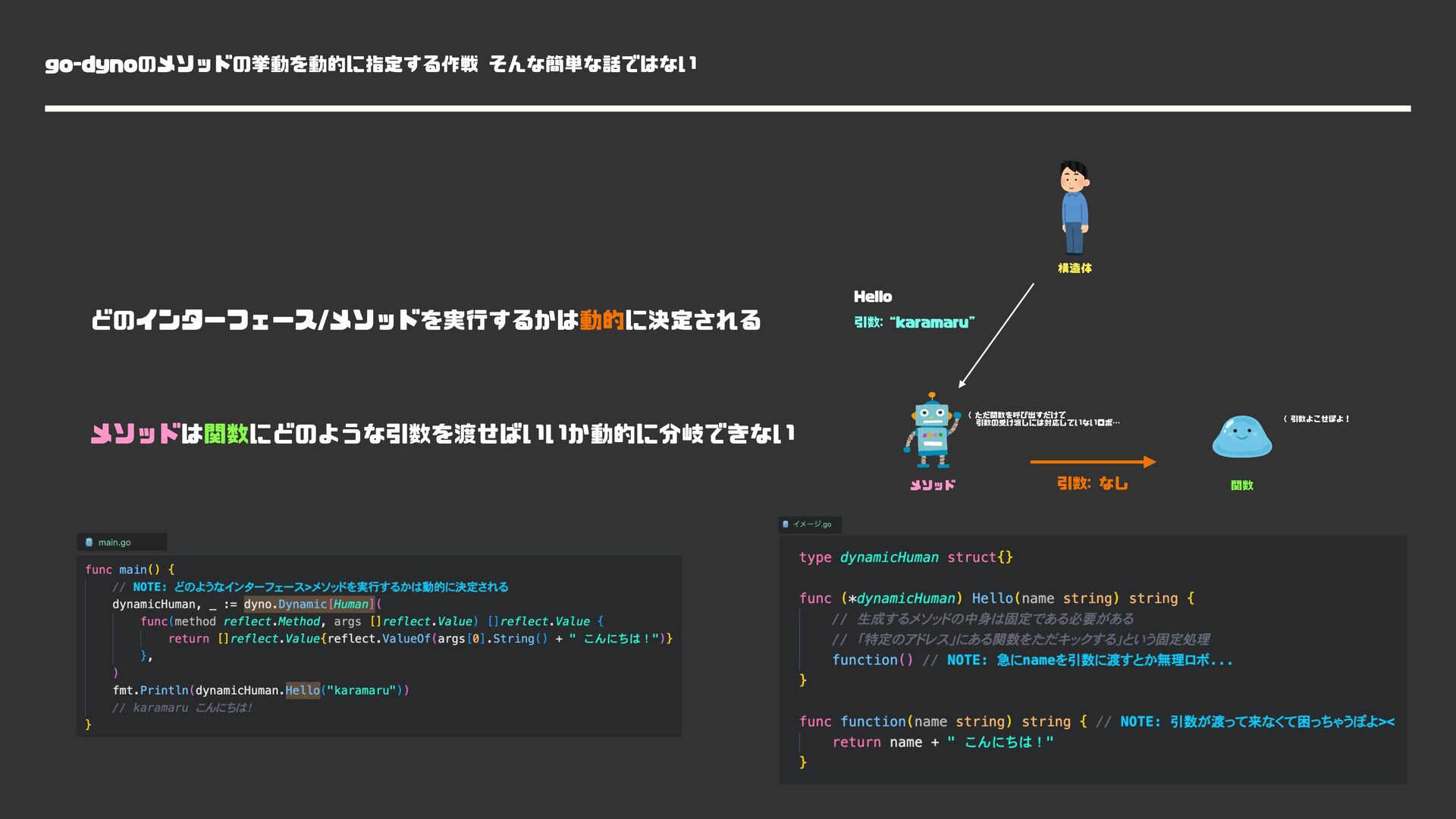 本セッションでは、go-dynoがどのようにしてインターフェースの型情報から、それを満たす構造体を動的に生成しているのか、メソッドの中身を自由に定義することができるのかを深く掘り下げます。