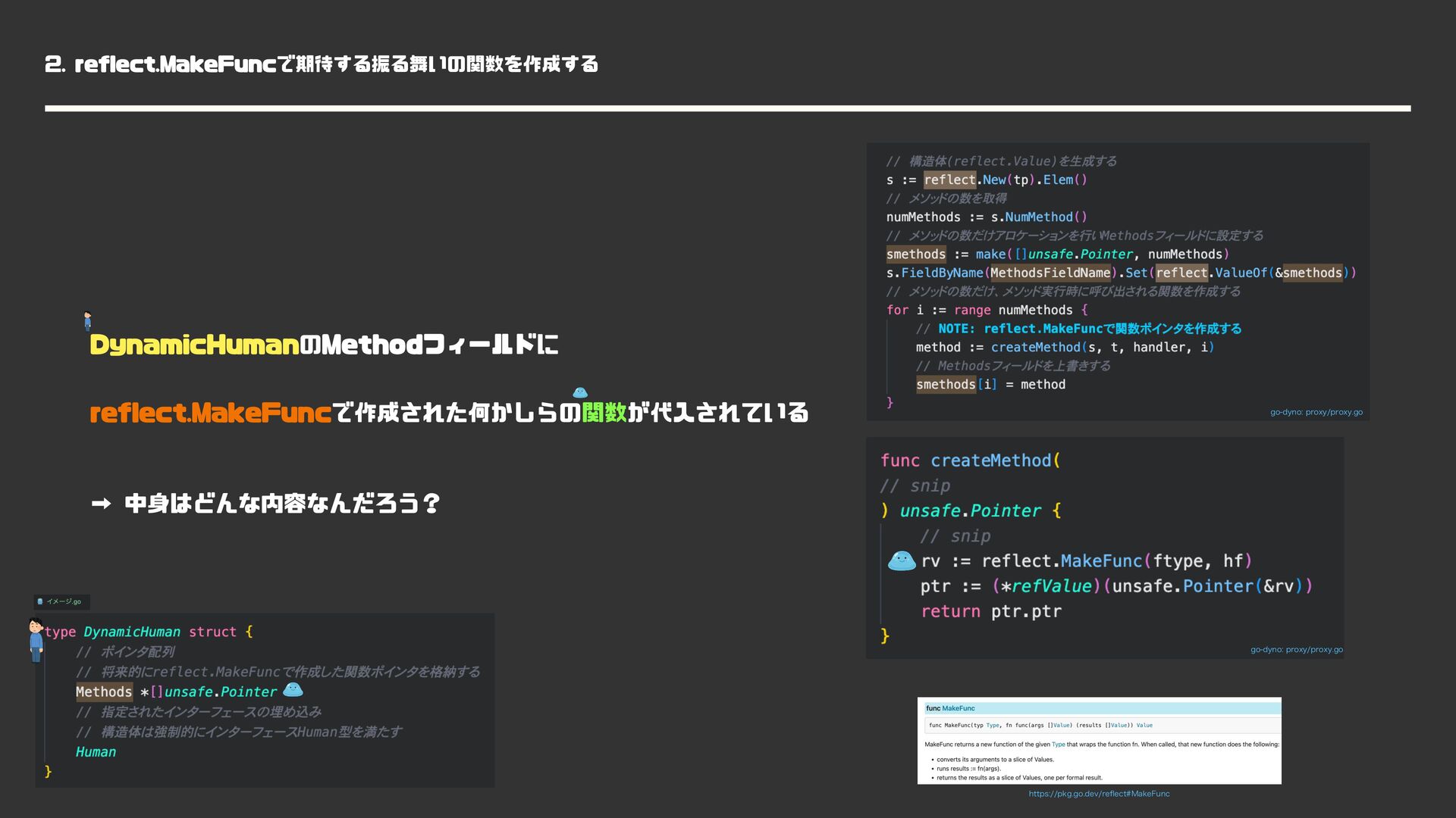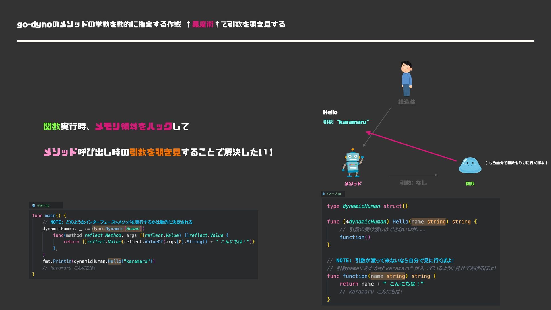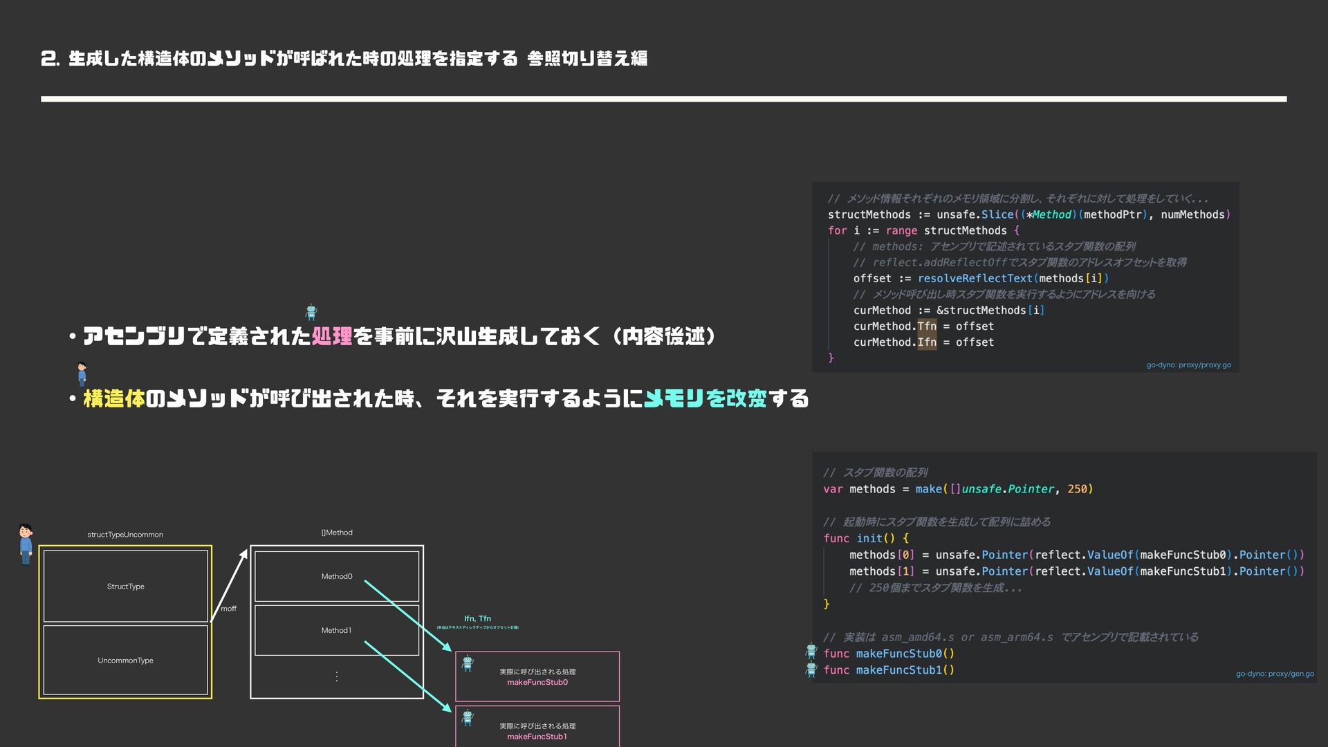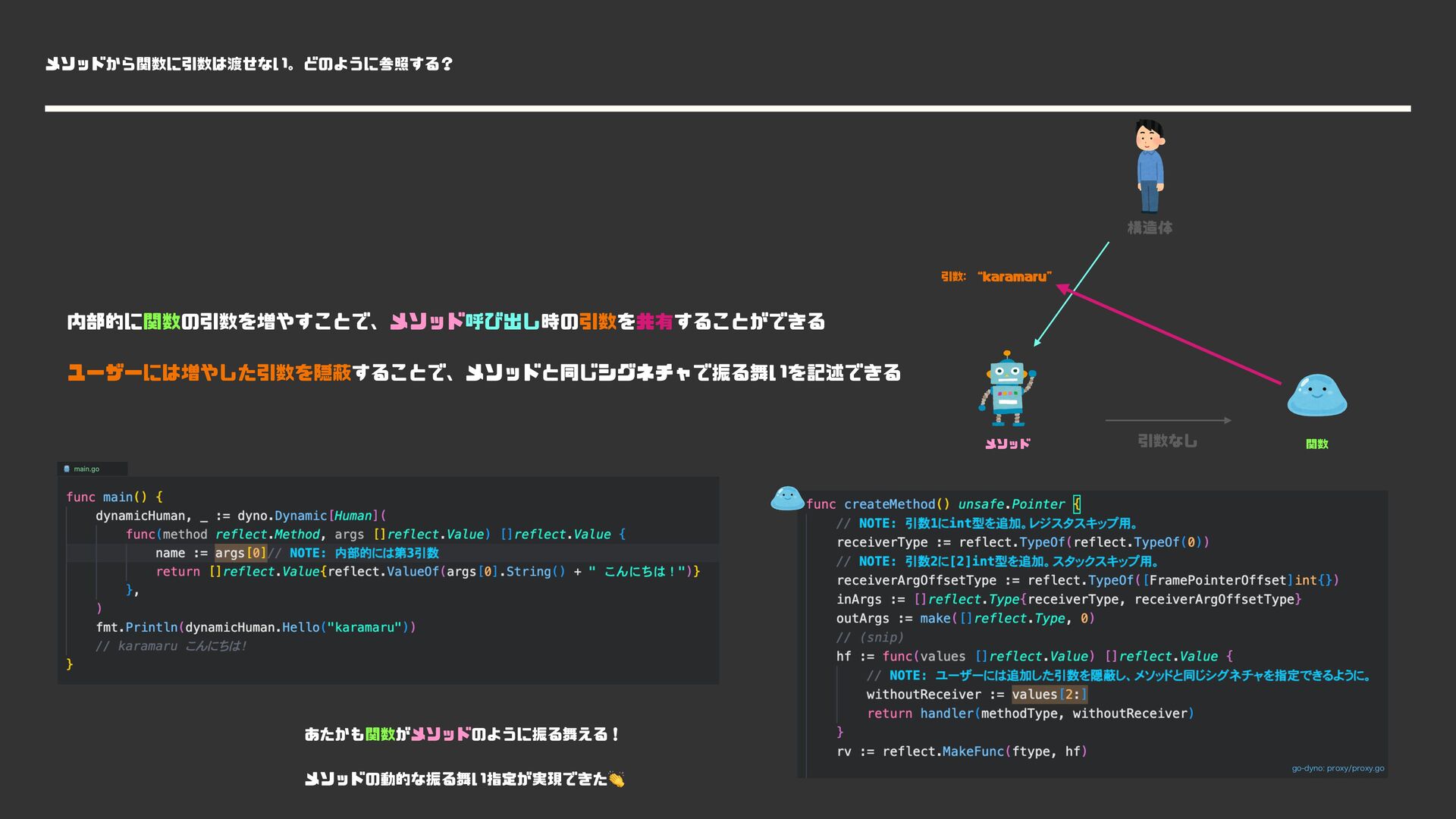 本セッションでは、go-dynoがどのようにしてインターフェースの型情報から、それを満たす構造体を動的に生成しているのか、メソッドの中身を自由に定義することができるのかを深く掘り下げます。