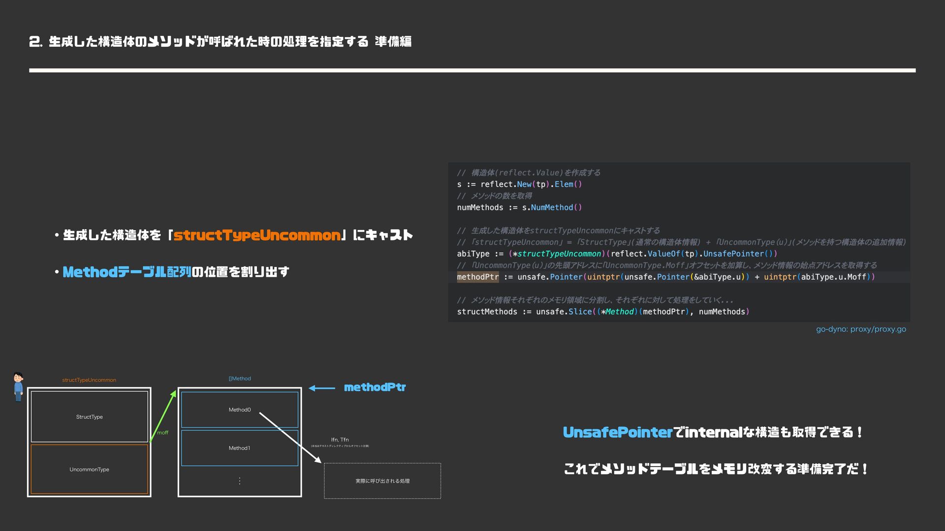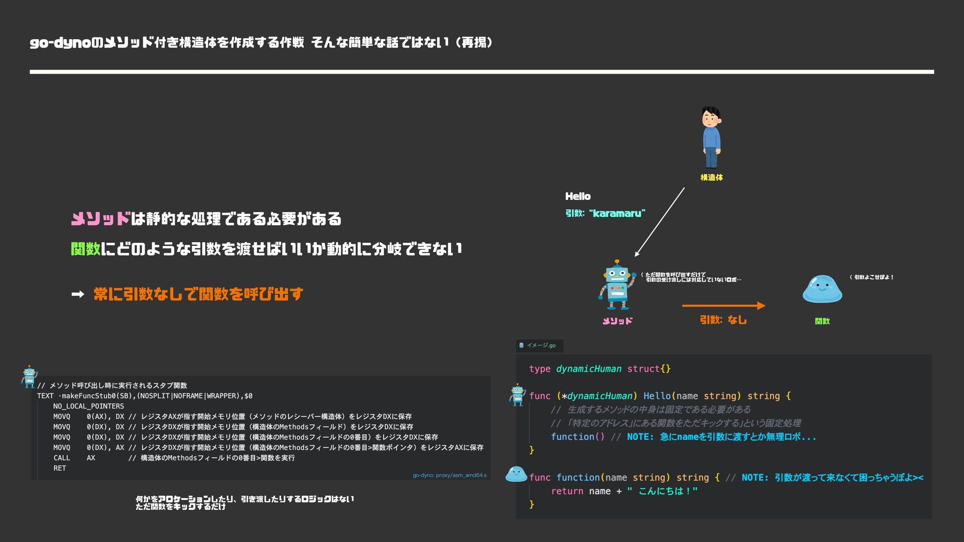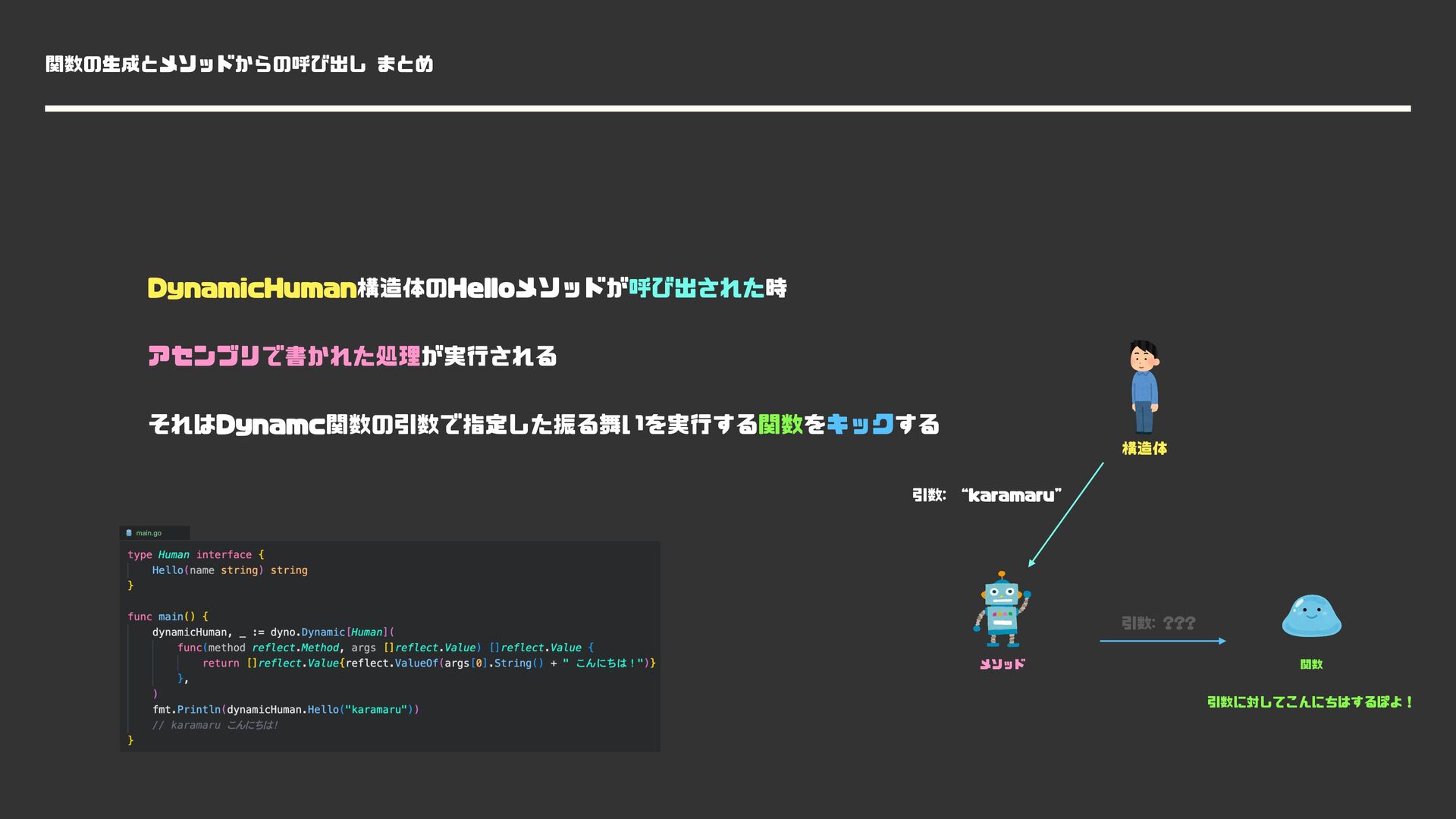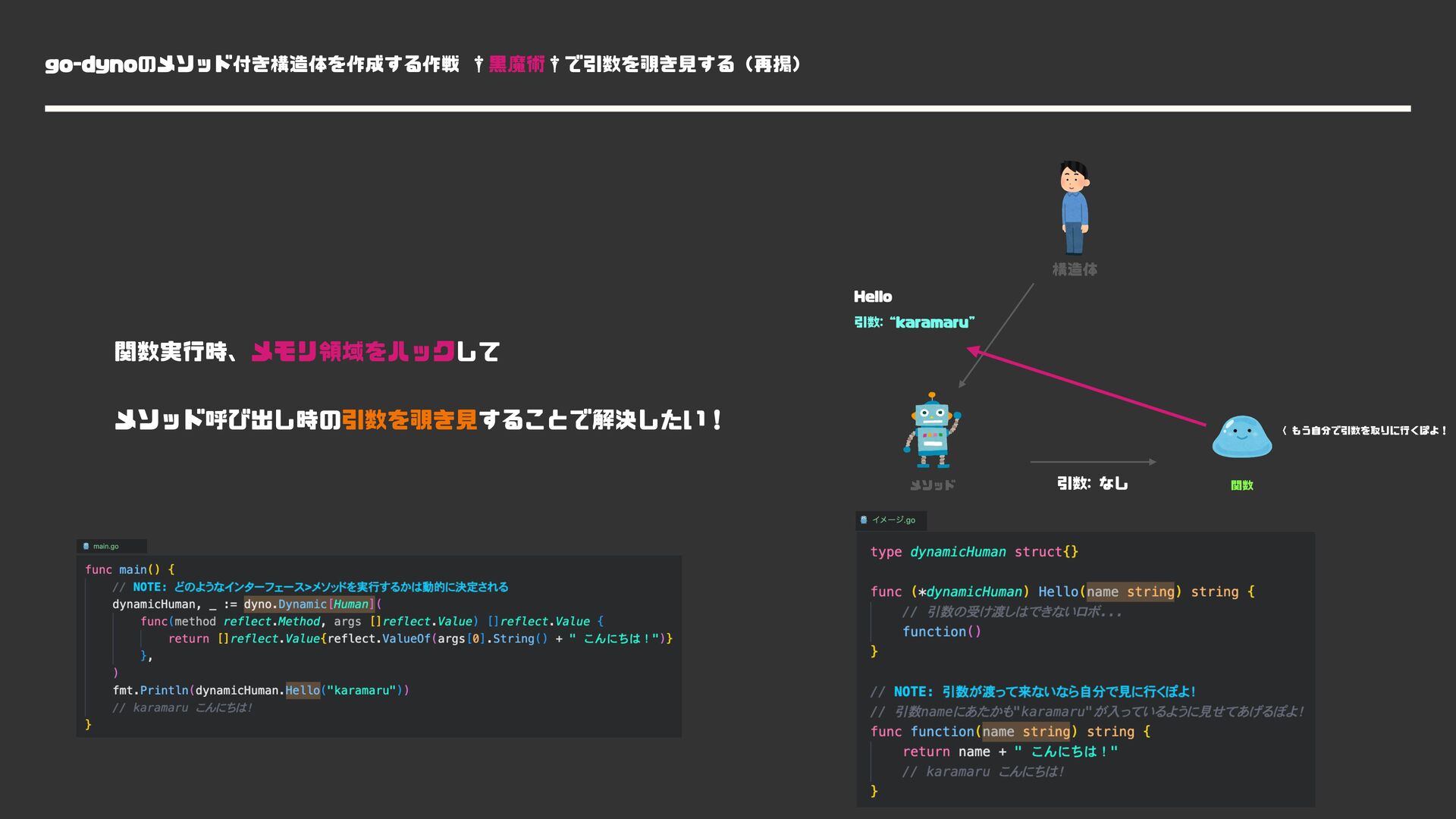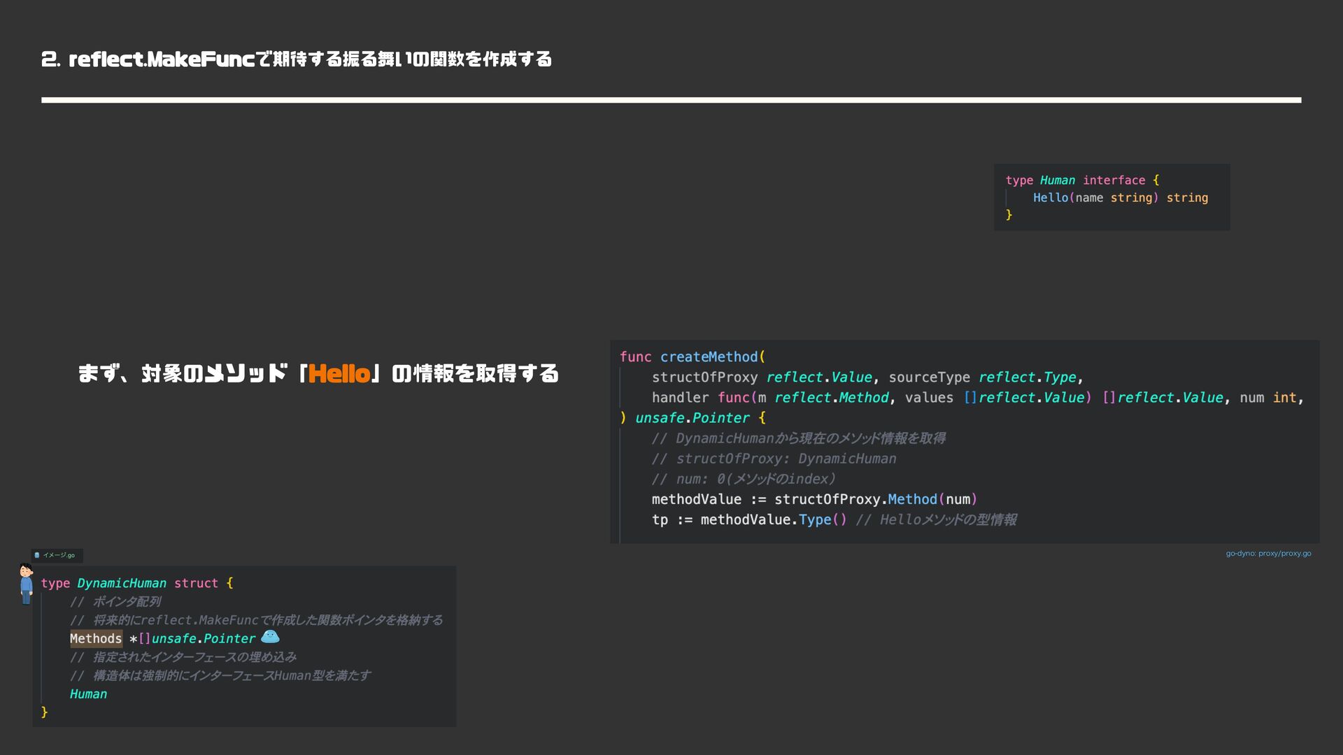 本セッションでは、go-dynoがどのようにしてインターフェースの型情報から、それを満たす構造体を動的に生成しているのか、メソッドの中身を自由に定義することができるのかを深く掘り下げます。