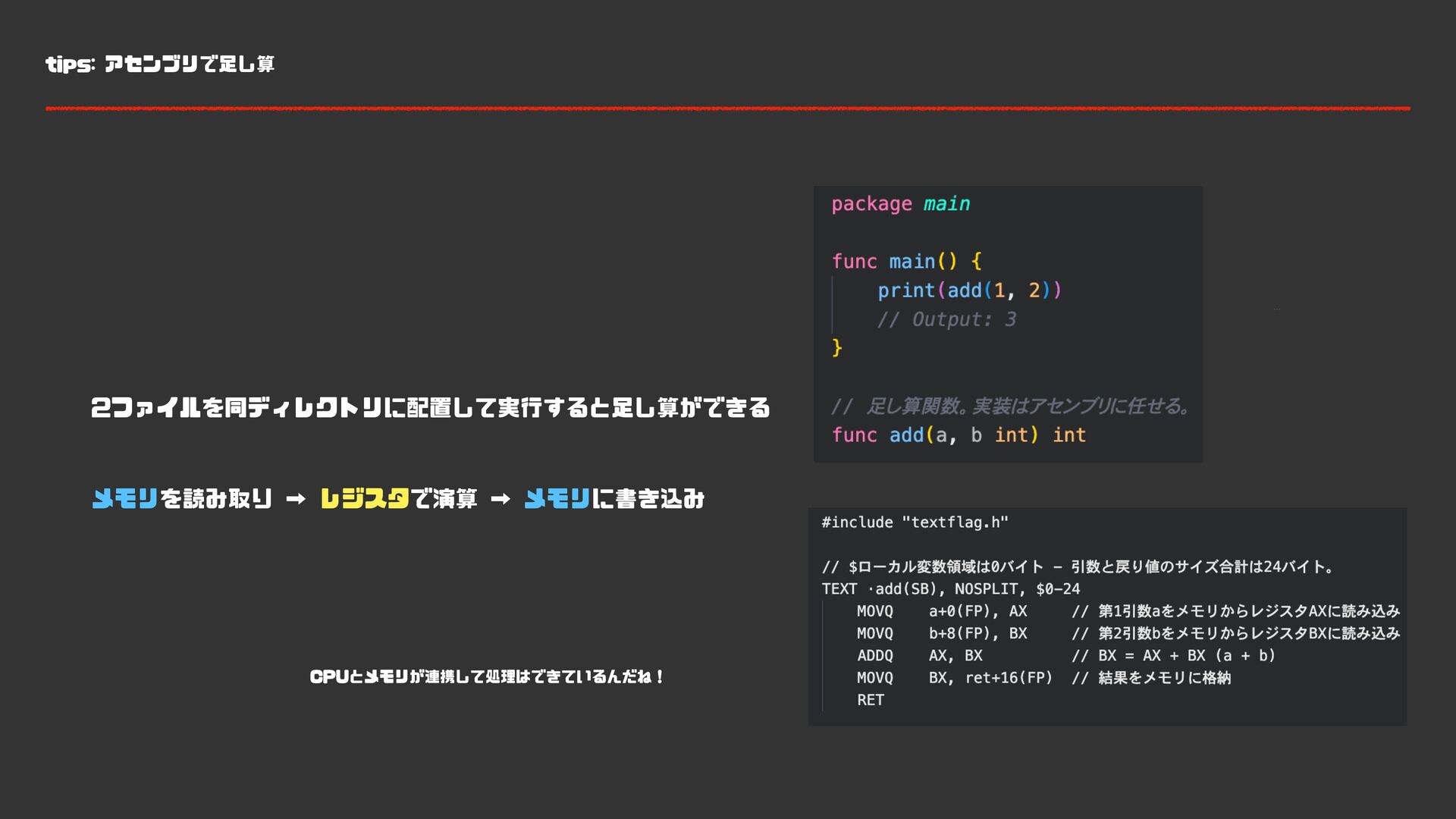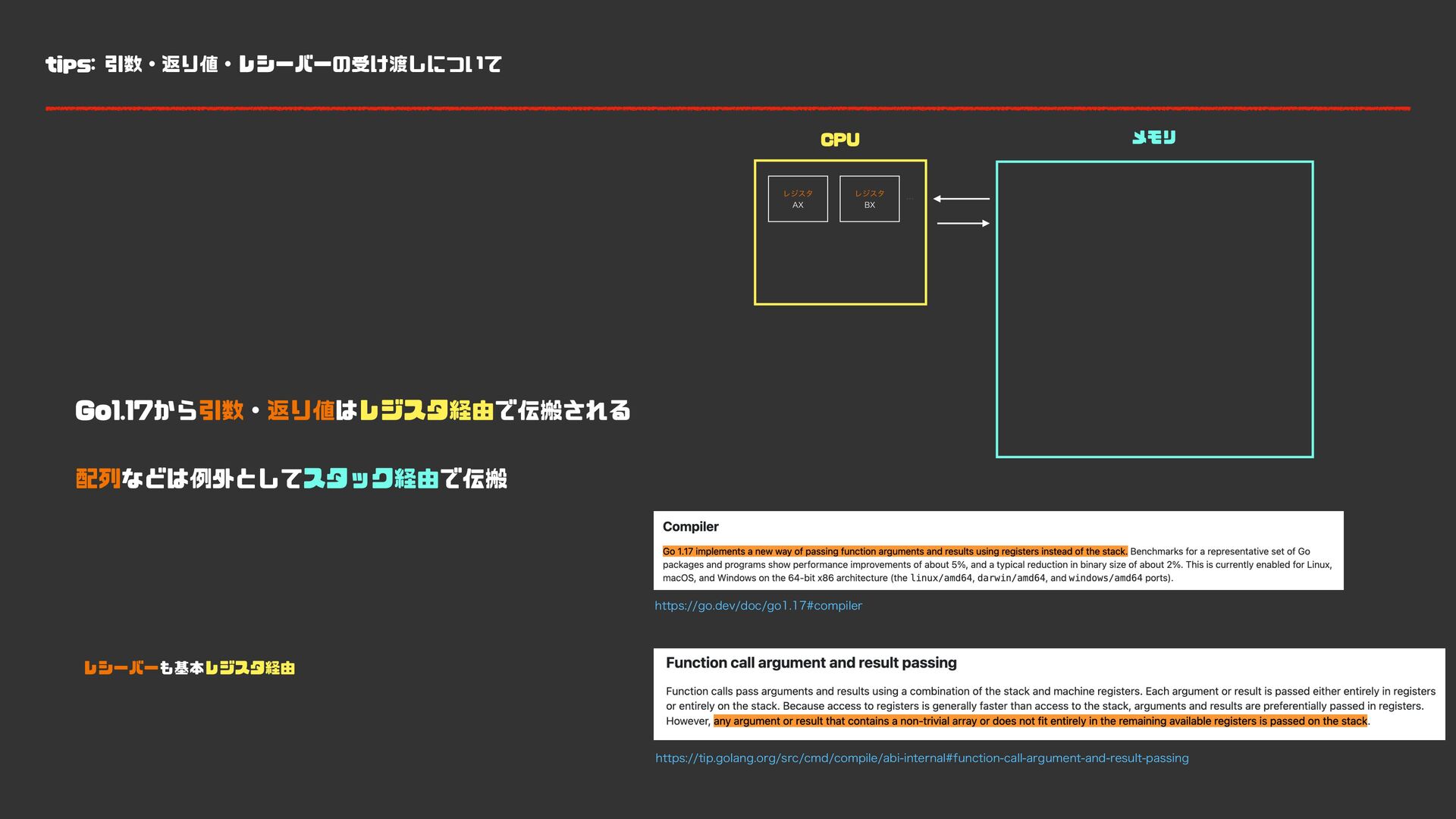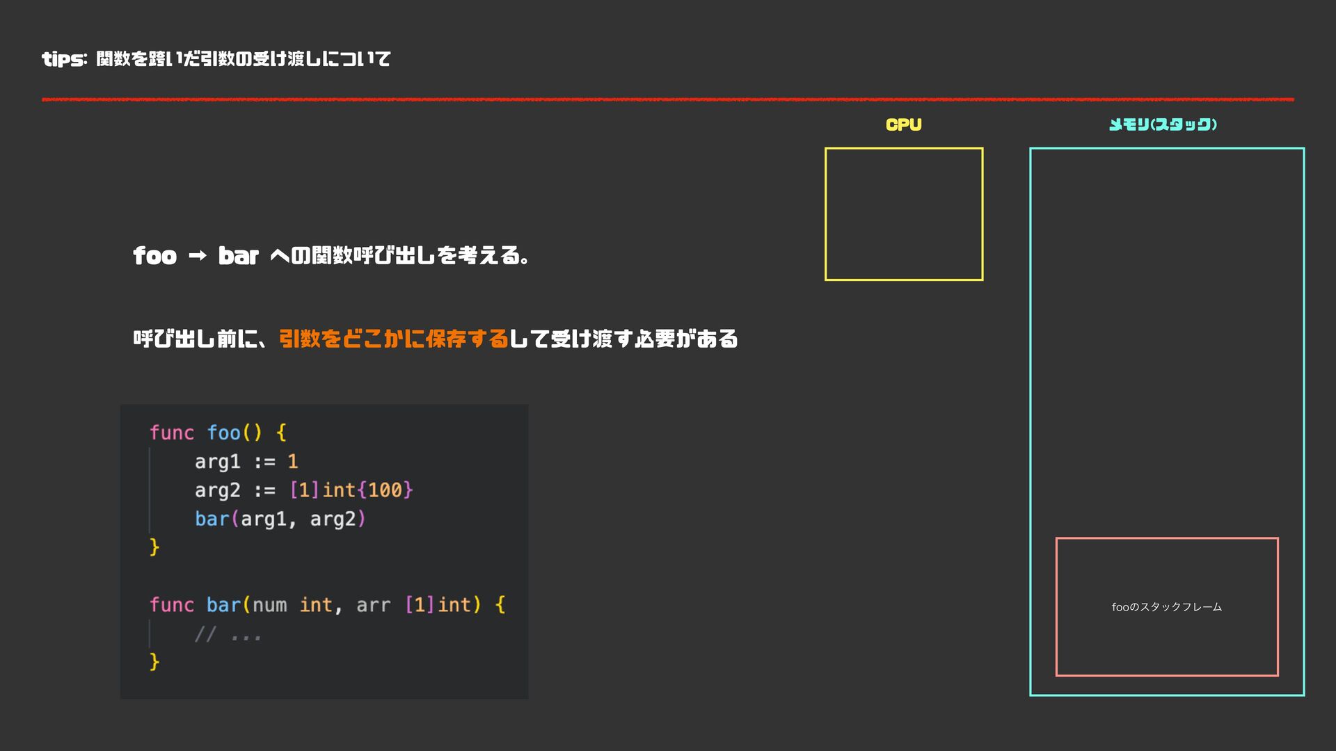 IFBQ ϥΠϑαΠΫϧ͕ಈతͳσʔλΛׂΓ౰ͯΔྖҬ ($͕૟আ͢Δͱ͜Ζ Ծ૝ϝϞϦۭؒ Ϩδελ "9 Ϩδελ #9 ʜ ʜ ௿ҐΞυϨε ߴҐΞυϨε ۭ͖ྖҬ ؔ਺ͷݺͼग़࣌͠ɺελοΫʹελοΫϑϨʔϜ͕ੵ·ΕΔɻ ελοΫϑϨʔϜͷج४఺ΛϑϨʔϜϙΠϯλʢ'1ʣͱ͍͏ɻ MPDBMWBSJBCMFϩʔΧϧม਺ HPTSDSVOUJNFTUBDLHP ελοΫϑϨʔϜ '1 'SBNF1PJOUFS 41 4UBDL1PJOUFS BSHTGSPNDBMMFSҾ਺ SFUVSOBEESFTTؔ਺ऴྃ࣌ͷδϟϯϓઌ DBMMFS`T#1ؔ਺ऴྃ࣌ 41΍'1ΛͲ͜ʹ໭ͤ͞Δ͔