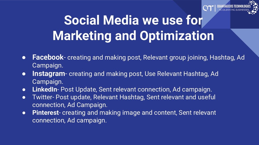creating and making post, Relevant group joining, Hashtag, Ad Campaign. • Instagram- creating and making post, Use Relevant Hashtag, Ad Campaign. • LinkedIn- Post Update, Sent relevant connection, Ad campaign. • Twitter- Post update, Relevant Hashtag, Sent relevant and useful connection, Ad Campaign. • Pinterest- creating and making image and content, Sent relevant connection, Ad campaign.