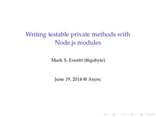 Make the module a reference to the constructor. module.exports = AsyncAttendee; // "private" methods are prefixed with _ . AsyncAttendee.prototype._sayHello = function () { return 'Hello ' + this.name + '!'; }; AsyncAttendee.prototype.hello = function () { console.log(this.sayHello()); };