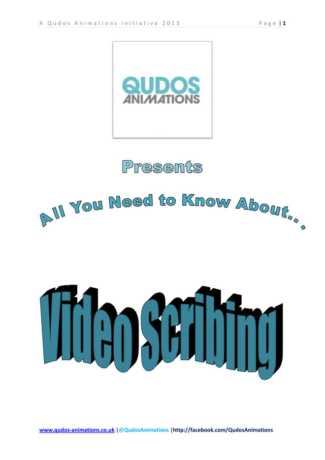 a t i o n s I n i t i a t i v e 2 0 1 3 P a g e | 2 www.qudos-animations.co.uk |@QudosAnimations |http://facebook.com/QudosAnimations TABLE OF CONTENTS What is Video Scribing What is Video Scribing used for? Examples of Great Video Scribing What Advantages do Businesses get by using Video Scribing? About Qudos Animations