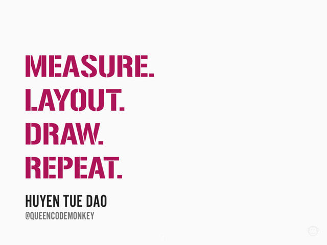 onMeasure() onLayout() onDraw() YES YES NO HAVE TO MEASURE EACH CHILD: child.measure() (ABSTRACT) HAVE TO LAYOUT EACH CHILD: child.layout() DOES NOT DRAW BY DEFAULT setWillNotDraw