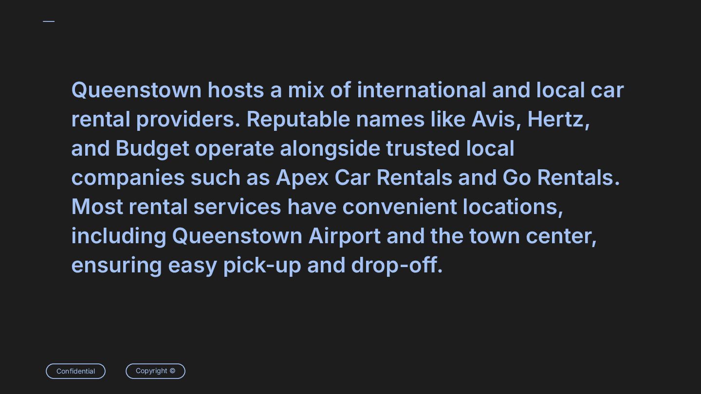 local car rental providers. Reputable names like Avis, Hertz, and Budget operate alongside trusted local companies such as Apex Car Rentals and Go Rentals. Most rental services have convenient locations, including Queenstown Airport and the town center, ensuring easy pick-up and drop-off.