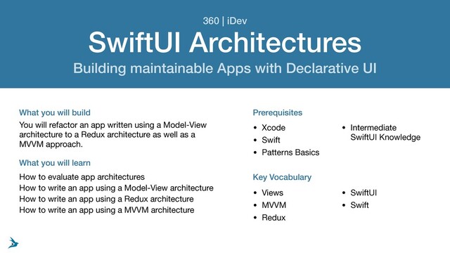 you will build What you will learn Prerequisites You will refactor an app written using a Model-View architecture to a Redux architecture as well as a MVVM approach. How to evaluate app architectures How to write an app using a Model-View architecture How to write an app using a Redux architecture How to write an app using a MVVM architecture • Xcode • Swift • Patterns Basics • Intermediate SwiftUI Knowledge Key Vocabulary • Views • MVVM • Redux • SwiftUI • Swift 360 | iDev