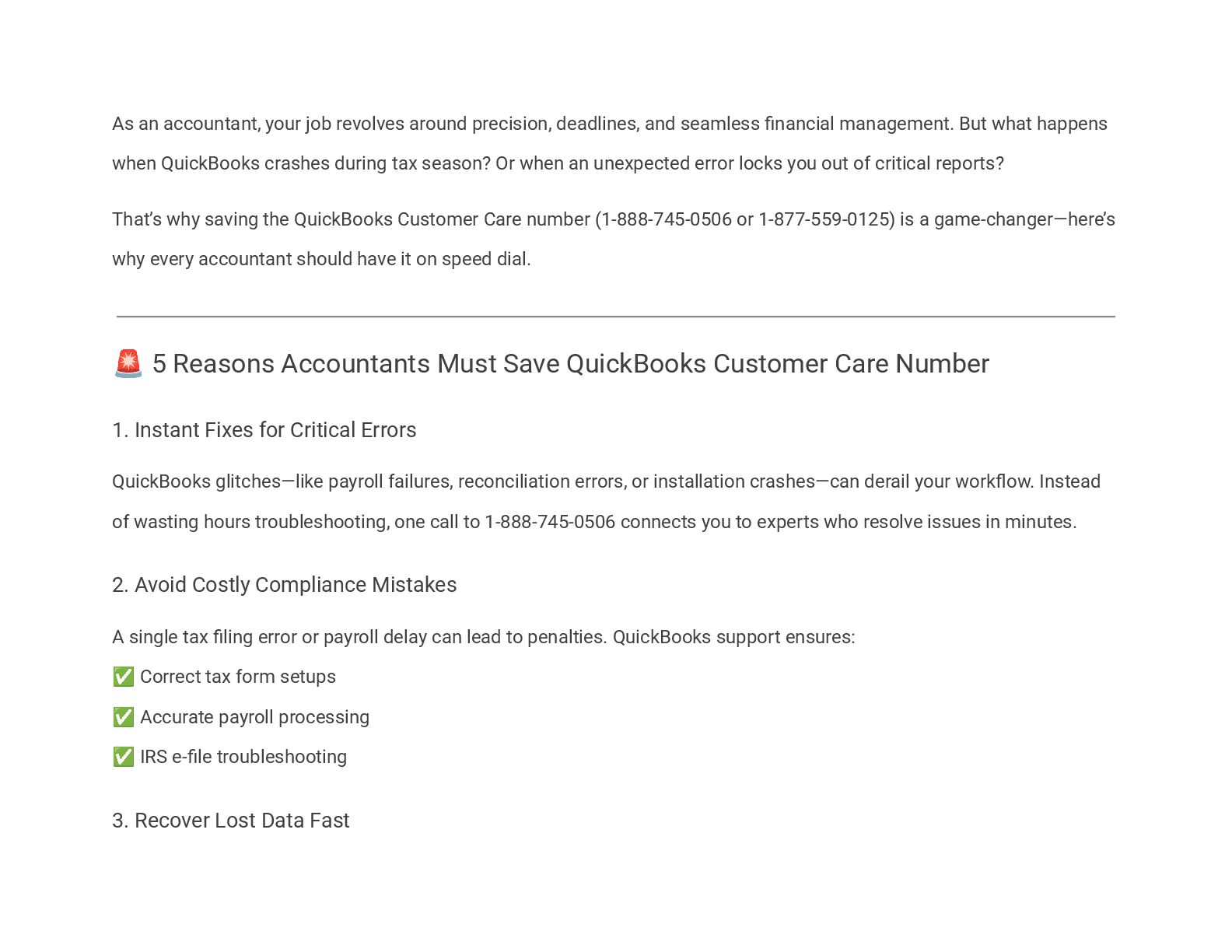 seamless financial management. But what happens when QuickBooks crashes during tax season? Or when an unexpected error locks you out of critical reports? That’s why saving the QuickBooks Customer Care number (1-888-745-0506 or 1-877-559-0125) is a game-changer—here’s why every accountant should have it on speed dial. 🚨 5 Reasons Accountants Must Save QuickBooks Customer Care Number 1. Instant Fixes for Critical Errors QuickBooks glitches—like payroll failures, reconciliation errors, or installation crashes—can derail your workflow. Instead of wasting hours troubleshooting, one call to 1-888-745-0506 connects you to experts who resolve issues in minutes. 2. Avoid Costly Compliance Mistakes A single tax filing error or payroll delay can lead to penalties. QuickBooks support ensures:​ ✅ Correct tax form setups​ ✅ Accurate payroll processing​ ✅ IRS e-file troubleshooting 3. Recover Lost Data Fast