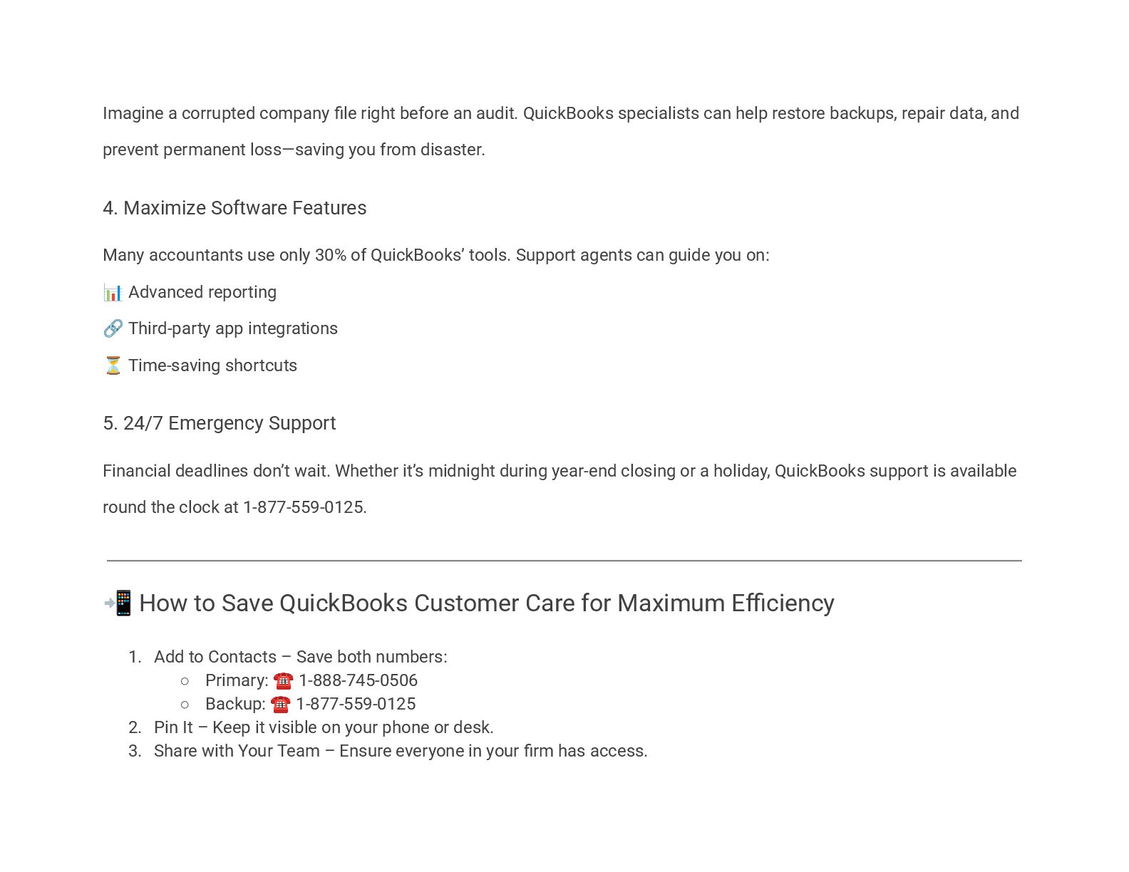 specialists can help restore backups, repair data, and prevent permanent loss—saving you from disaster. 4. Maximize Software Features Many accountants use only 30% of QuickBooks’ tools. Support agents can guide you on:​ 📊 Advanced reporting​ 🔗 Third-party app integrations​ ⏳ Time-saving shortcuts 5. 24/7 Emergency Support Financial deadlines don’t wait. Whether it’s midnight during year-end closing or a holiday, QuickBooks support is available round the clock at 1-877-559-0125. 📲 How to Save QuickBooks Customer Care for Maximum Efficiency 1.​ Add to Contacts – Save both numbers: ◦​ Primary: ☎️ 1-888-745-0506 ◦​ Backup: ☎️ 1-877-559-0125 2.​ Pin It – Keep it visible on your phone or desk. 3.​ Share with Your Team – Ensure everyone in your firm has access.