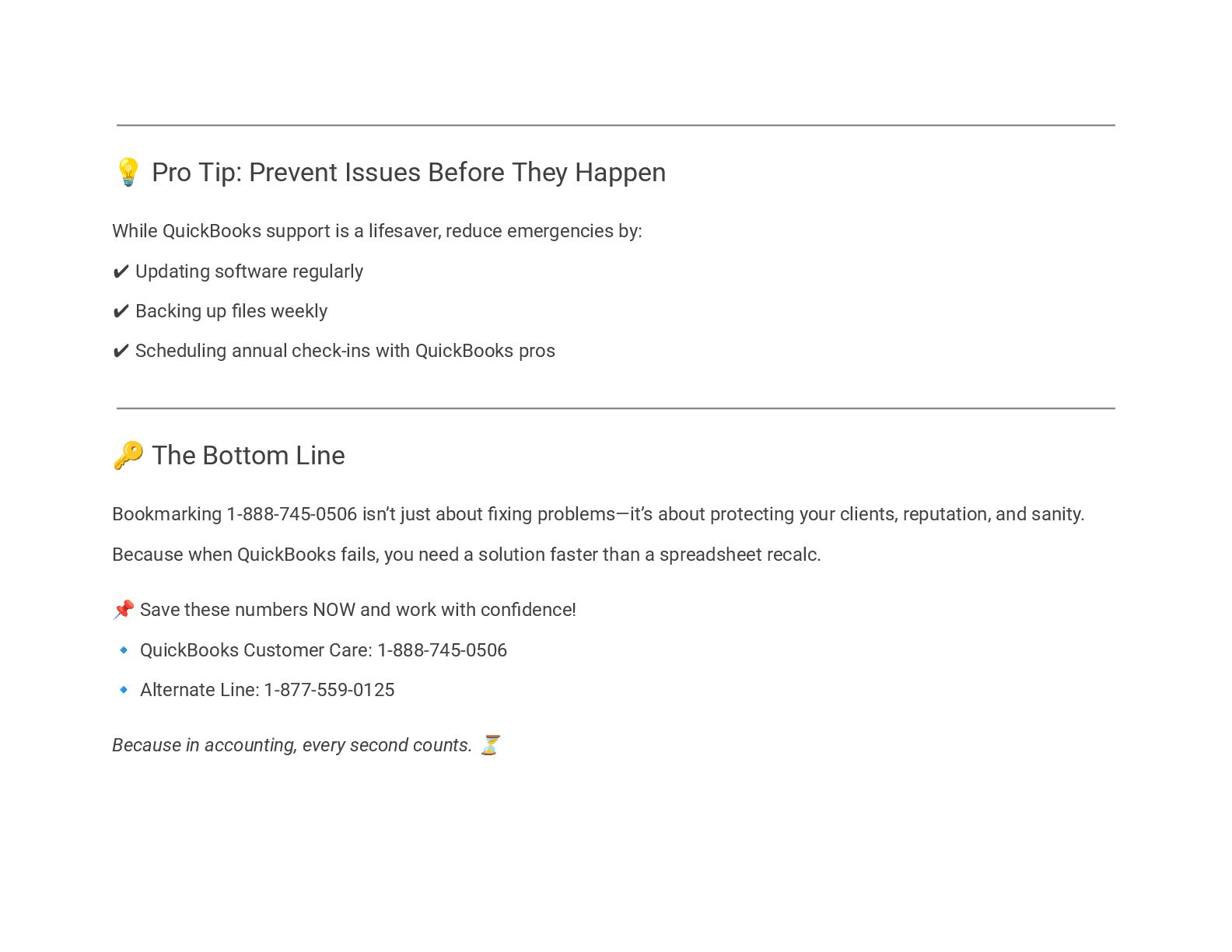support is a lifesaver, reduce emergencies by:​ ✔ Updating software regularly​ ✔ Backing up files weekly​ ✔ Scheduling annual check-ins with QuickBooks pros 🔑 The Bottom Line Bookmarking 1-888-745-0506 isn’t just about fixing problems—it’s about protecting your clients, reputation, and sanity. Because when QuickBooks fails, you need a solution faster than a spreadsheet recalc. 📌 Save these numbers NOW and work with confidence!​ 🔹 QuickBooks Customer Care: 1-888-745-0506​ 🔹 Alternate Line: 1-877-559-0125 Because in accounting, every second counts. ⏳