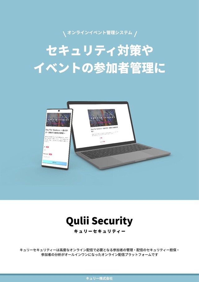 行う必要があり事前登録頂いた参加者の内誰が参加したかを把握するのは難しくなります。 本システムでは参加者のメールアドレスを登録するだけで、参加者にIDとパスワードを自動発行してイベン トやセミナーの参加時に本システムでログインして頂くことで参加者のリストを作成しセミナー終了時に即 時分析レポートをご確認頂くことができます。YouTube Liveなどの参加者率や参加者の傾向を図ることが出 来なかったツールでも本システムを組み合わせてご活用頂くことで次回以降のセミナーで効果的な集客を行 うことが可能となります。 詳細な分析レポートの発行 本システムをご利用頂くことでどの参加者が何時にイベントやセミナーに参加したのか、どの参加者が欠席 したのかなどを明記した詳細分析レポートを発行させて頂きます。合計参加者数や正確なイベントの参加人 数・参加率なども記載させていただいておりますので今後の分析にご活用頂けます。 通常の参加方法 本システムを使用した方法 参加者 イベント 事前に共有した 全員共通のURLから参加 誰が参加したのか分からない 参加者 イベント 本システム 事前に全員に発行された IDとパスワードでログイン 誰が何時に参加したのか分かる Security Qulii お名前 お名前 参加者リストを自動作成