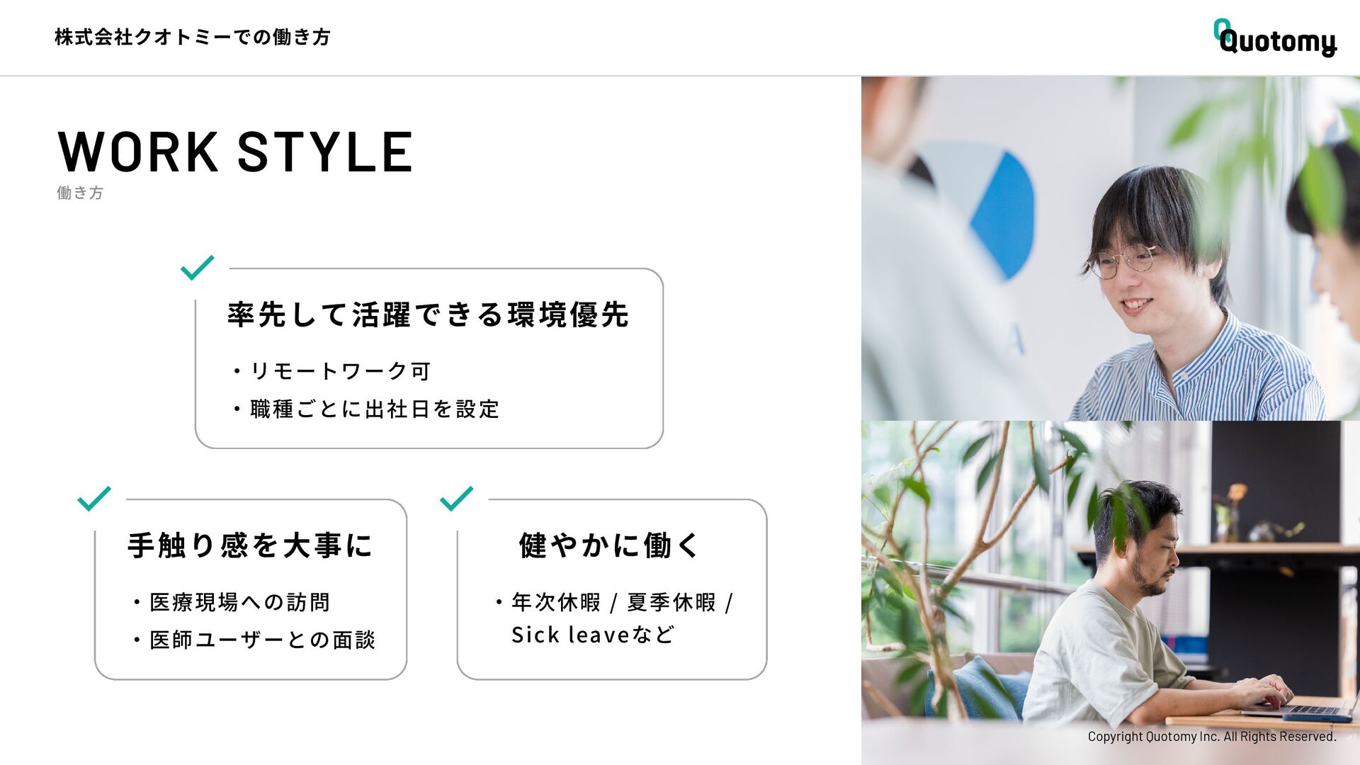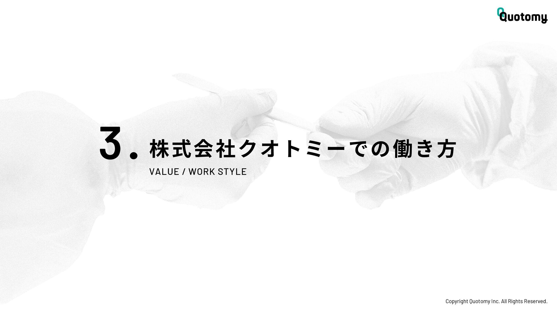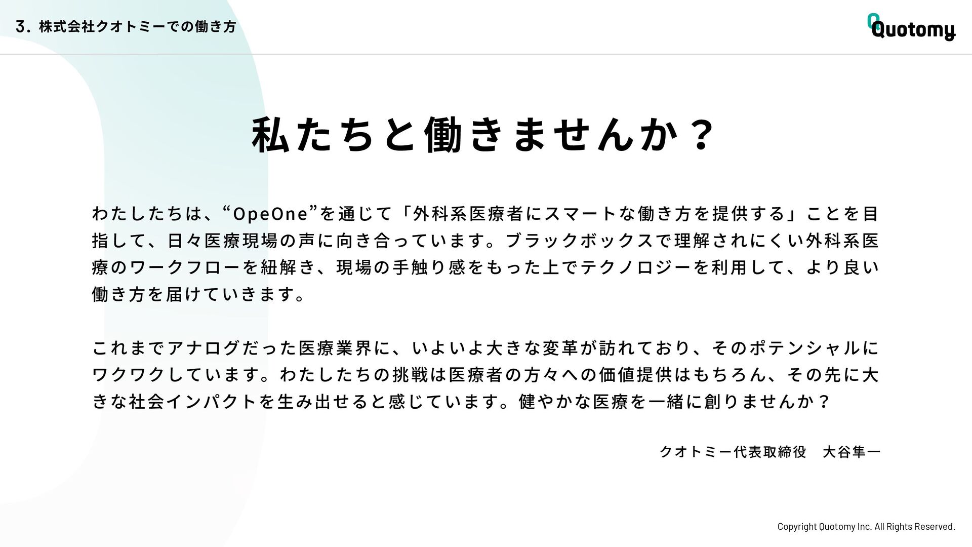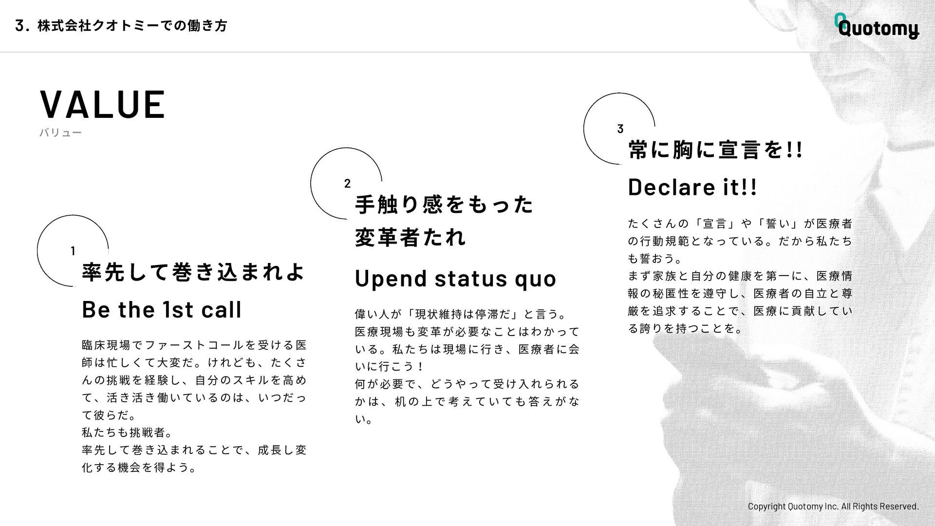 、 机 の 上 で 考 え て い て も 答 え が な い。 VALUE Copyright Quotomy Inc. All Rights Reserved. 株式会社クオトミーでの働き方 3. バリュー 率先して巻き込まれよ Be the 1st call 臨床現場でファーストコールを受ける医 師は忙しくて大変だ。けれども、たくさ んの挑戦を経験し、自分のスキルを高め て、活き活き働いているのは、いつだっ て彼らだ。 私たちも挑戦者。 率先して巻き込まれることで、成長し変 化する機会を得よう。 手触り感をもった 変革者たれ Upend status quo 常に胸に宣言を!! Declare it!! たくさんの「宣言」や「誓い」が医療者 の行動規範となっている。だから私たち も誓おう。 まず家族と自分の健康を第一に、医療情 報の秘匿性を遵守し、医療者の自立と尊 厳を追求することで、医療に貢献してい る誇りを持つことを。