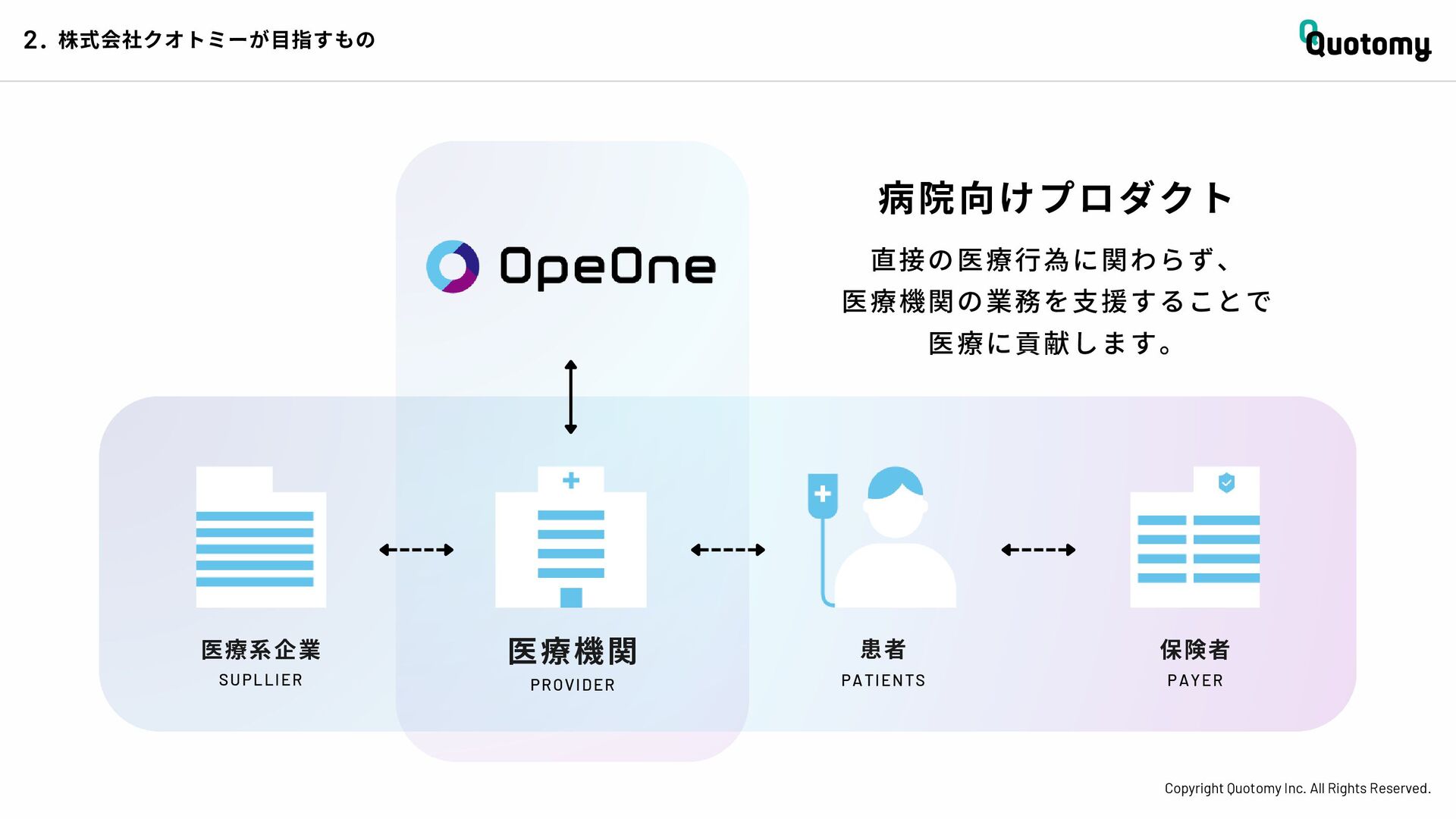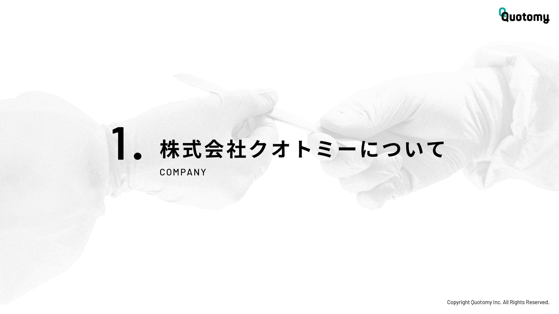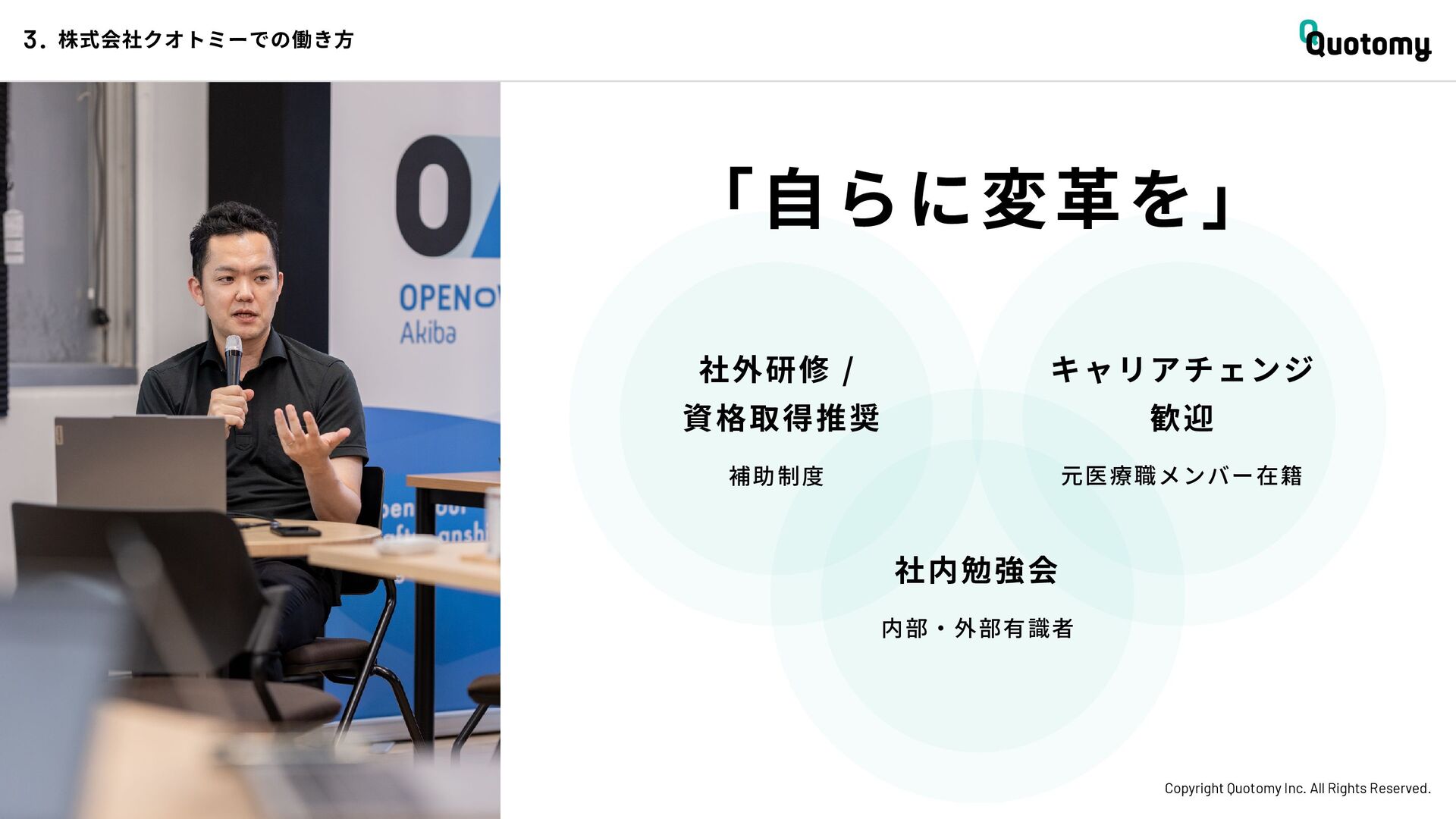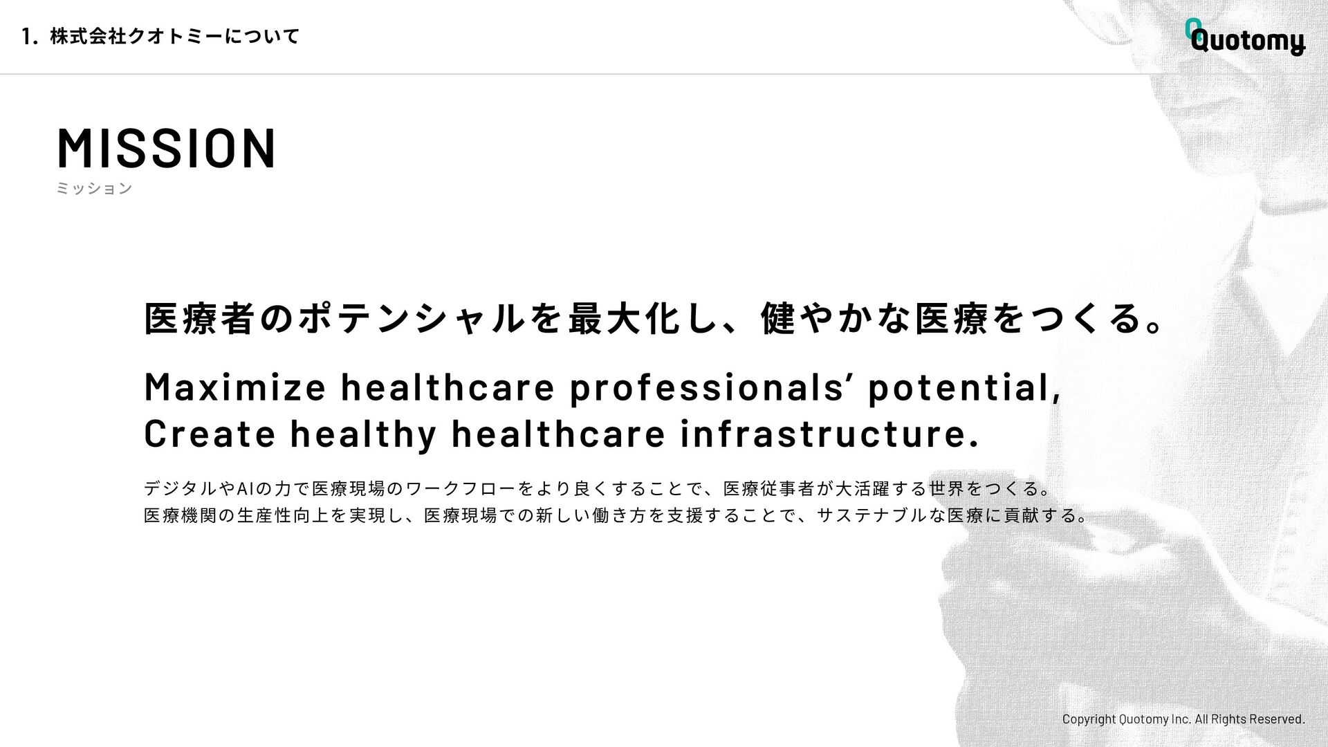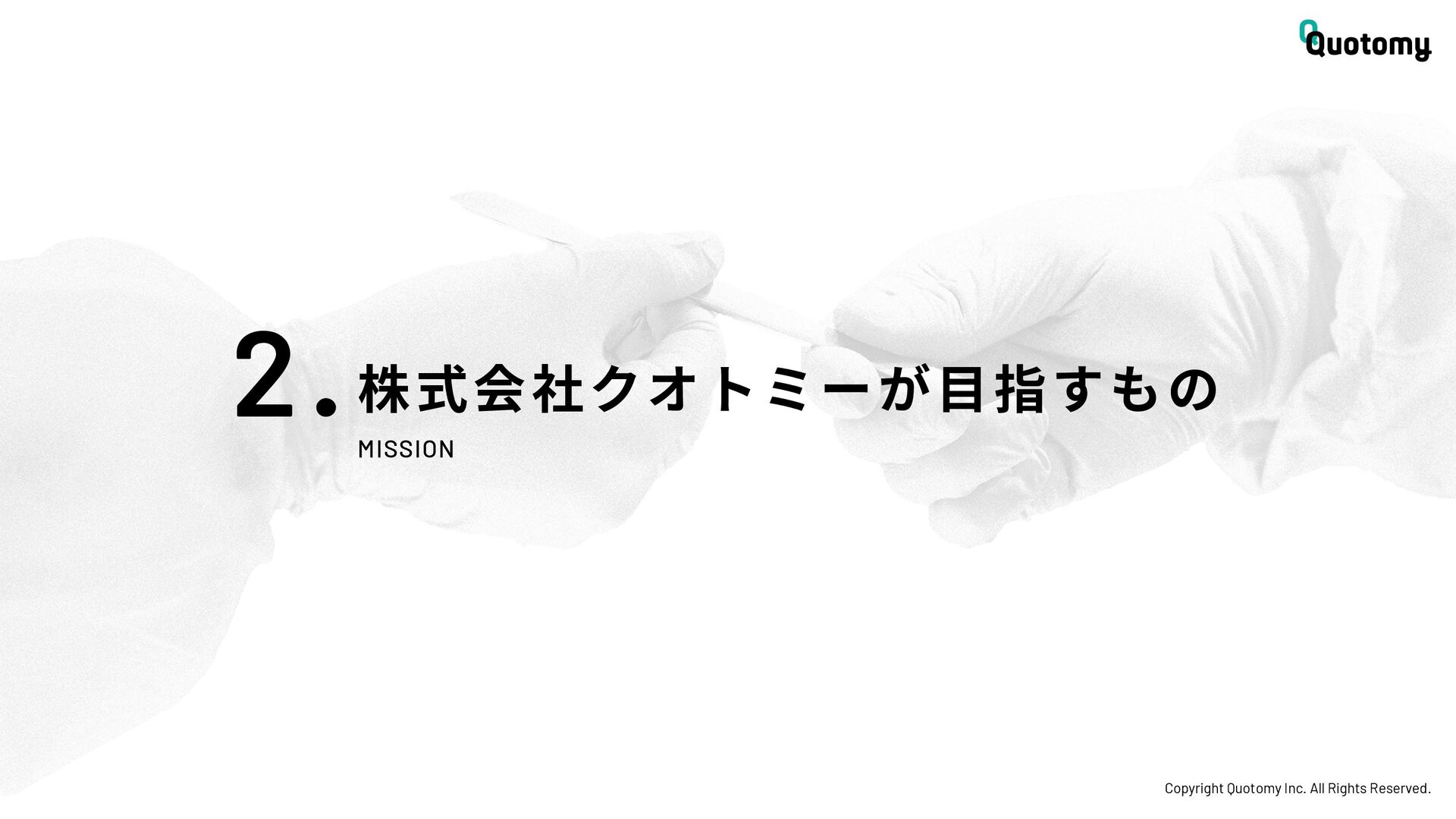 、 机 の 上 で 考 え て い て も 答 え が な い。 VALUE Copyright Quotomy Inc. All Rights Reserved. 株式会社クオトミーでの働き方 3. バリュー 率先して巻き込まれよ Be the 1st call 臨床現場でファーストコールを受ける医 師は忙しくて大変だ。けれども、たくさ んの挑戦を経験し、自分のスキルを高め て、活き活き働いているのは、いつだっ て彼らだ。 私たちも挑戦者。 率先して巻き込まれることで、成長し変 化する機会を得よう。 手触り感をもった 変革者たれ Upend status quo 常に胸に宣言を!! Declare it!! たくさんの「宣言」や「誓い」が医療者 の行動規範となっている。だから私たち も誓おう。 まず家族と自分の健康を第一に、医療情 報の秘匿性を遵守し、医療者の自立と尊 厳を追求することで、医療に貢献してい る誇りを持つことを。