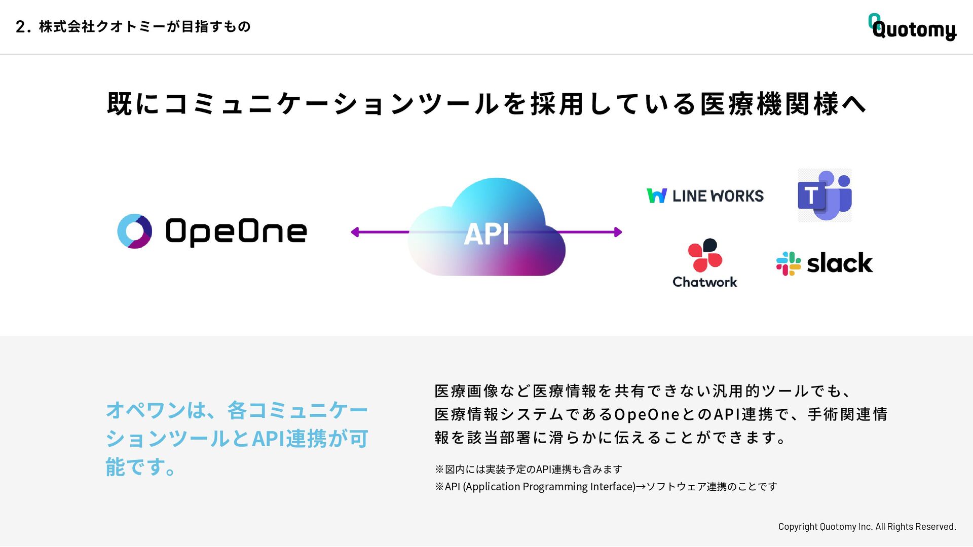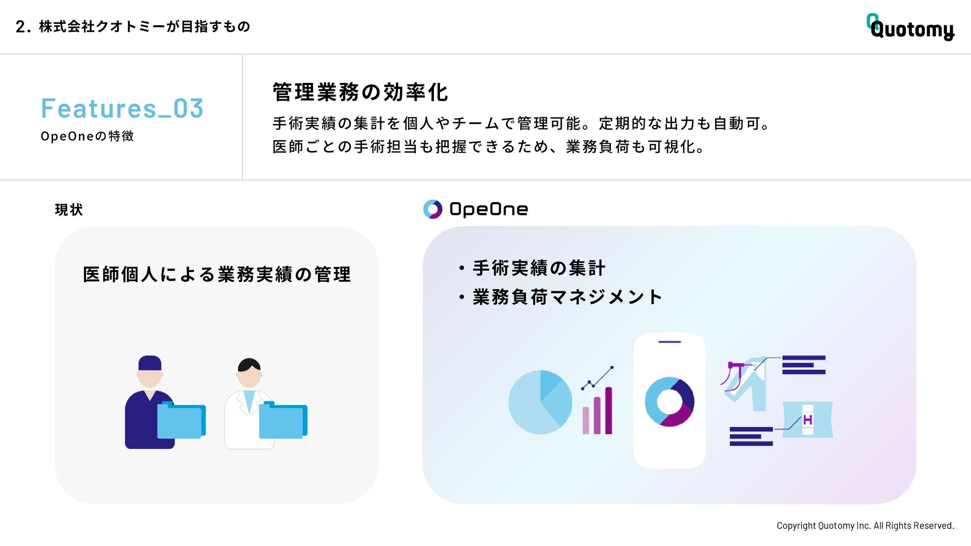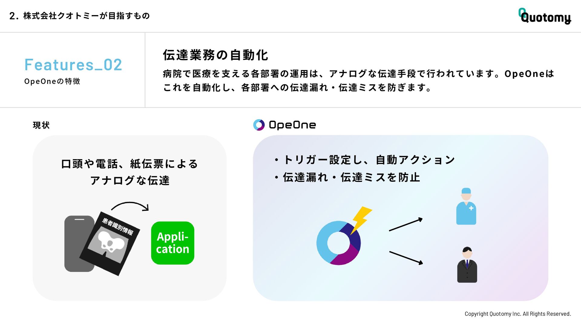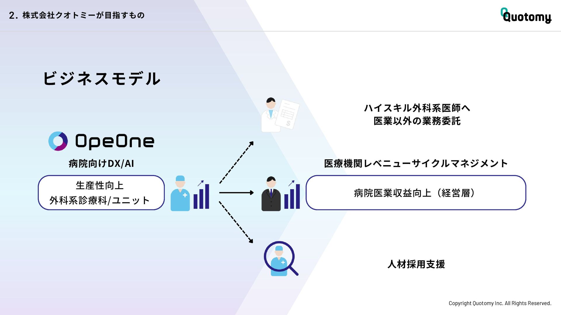 、 机 の 上 で 考 え て い て も 答 え が な い。 VALUE Copyright Quotomy Inc. All Rights Reserved. 株式会社クオトミーでの働き方 3. バリュー 率先して巻き込まれよ Be the 1st call 臨床現場でファーストコールを受ける医 師は忙しくて大変だ。けれども、たくさ んの挑戦を経験し、自分のスキルを高め て、活き活き働いているのは、いつだっ て彼らだ。 私たちも挑戦者。 率先して巻き込まれることで、成長し変 化する機会を得よう。 手触り感をもった 変革者たれ Upend status quo 常に胸に宣言を!! Declare it!! たくさんの「宣言」や「誓い」が医療者 の行動規範となっている。だから私たち も誓おう。 まず家族と自分の健康を第一に、医療情 報の秘匿性を遵守し、医療者の自立と尊 厳を追求することで、医療に貢献してい る誇りを持つことを。