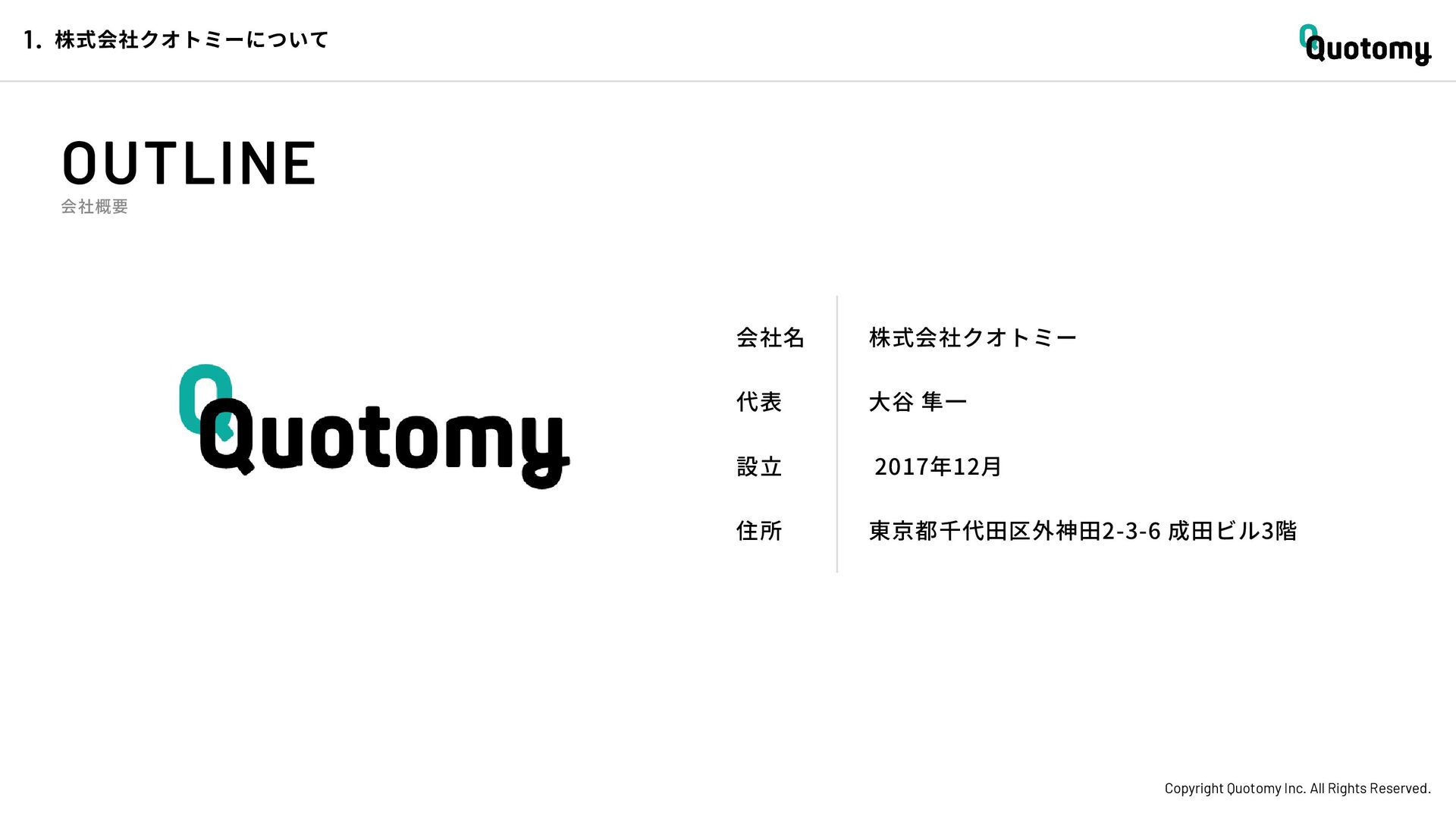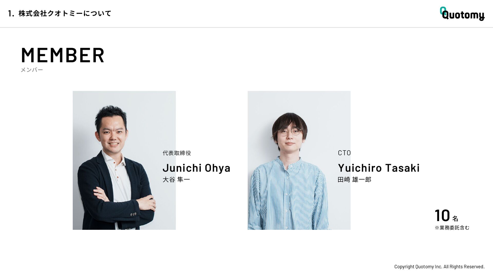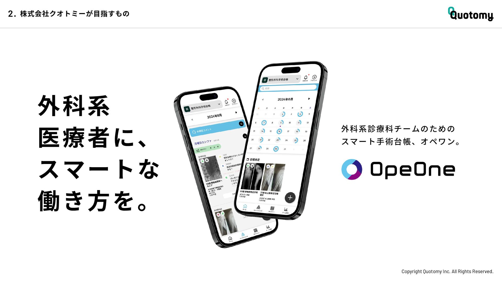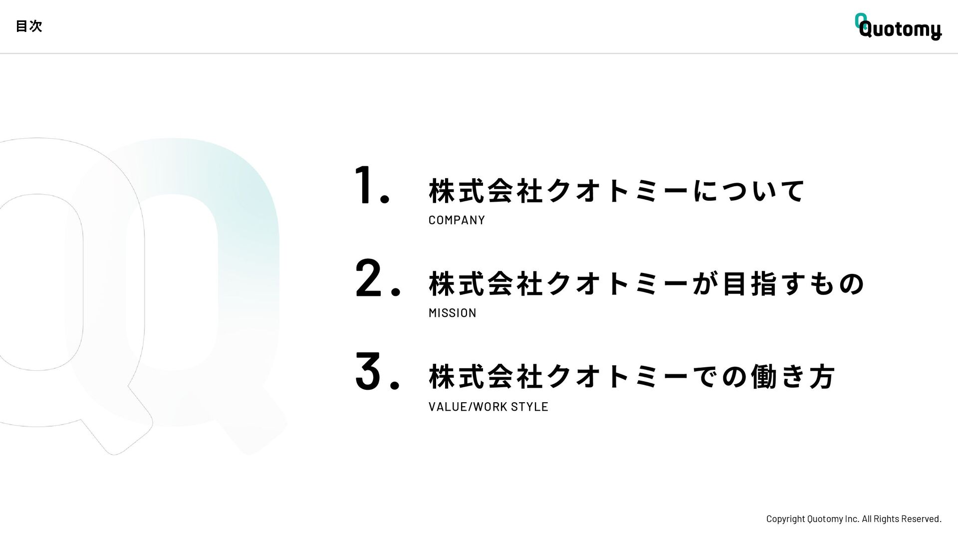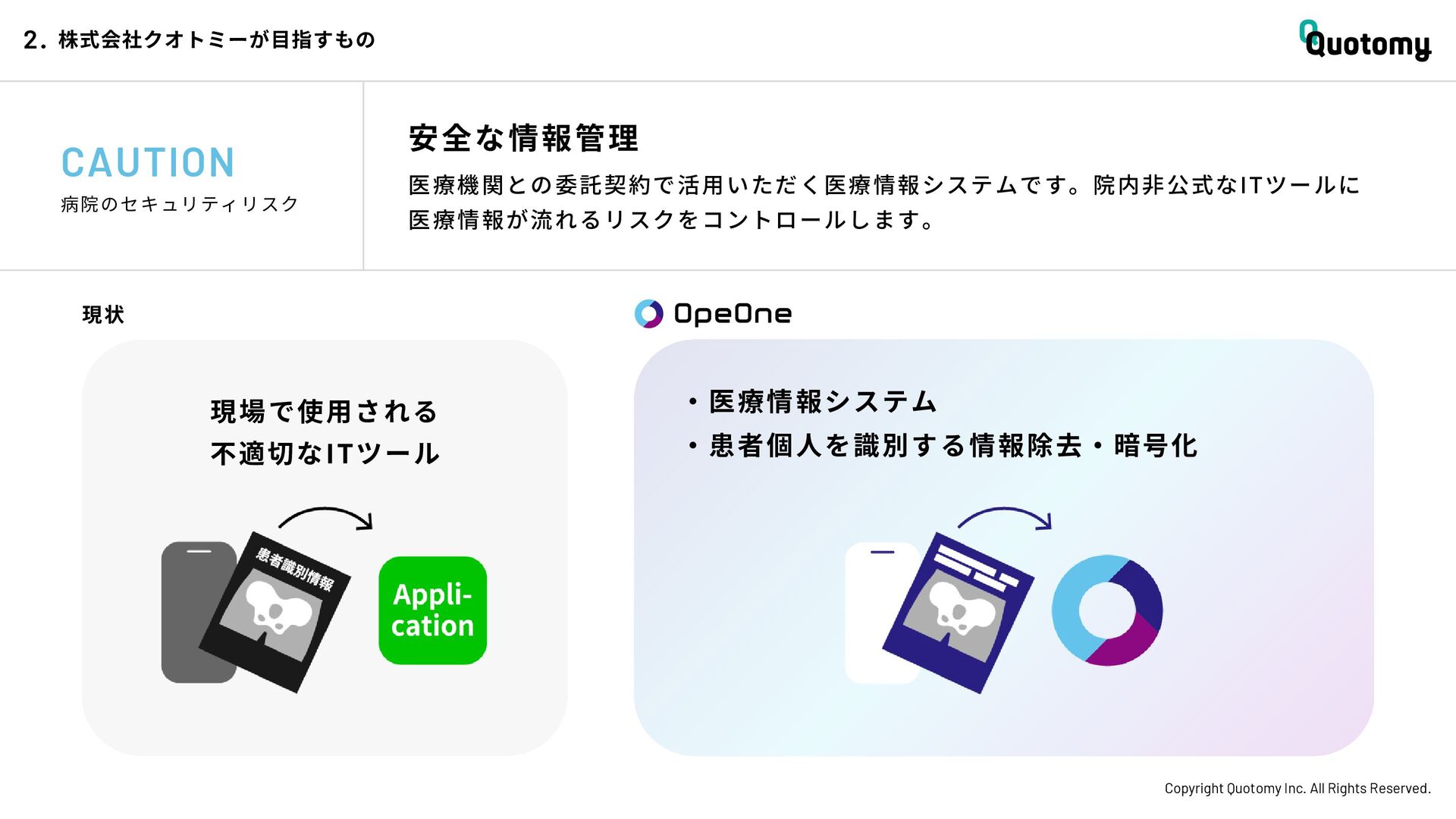 、 机 の 上 で 考 え て い て も 答 え が な い。 VALUE Copyright Quotomy Inc. All Rights Reserved. 株式会社クオトミーでの働き方 3. バリュー 率先して巻き込まれよ Be the 1st call 臨床現場でファーストコールを受ける医 師は忙しくて大変だ。けれども、たくさ んの挑戦を経験し、自分のスキルを高め て、活き活き働いているのは、いつだっ て彼らだ。 私たちも挑戦者。 率先して巻き込まれることで、成長し変 化する機会を得よう。 手触り感をもった 変革者たれ Upend status quo 常に胸に宣言を!! Declare it!! たくさんの「宣言」や「誓い」が医療者 の行動規範となっている。だから私たち も誓おう。 まず家族と自分の健康を第一に、医療情 報の秘匿性を遵守し、医療者の自立と尊 厳を追求することで、医療に貢献してい る誇りを持つことを。