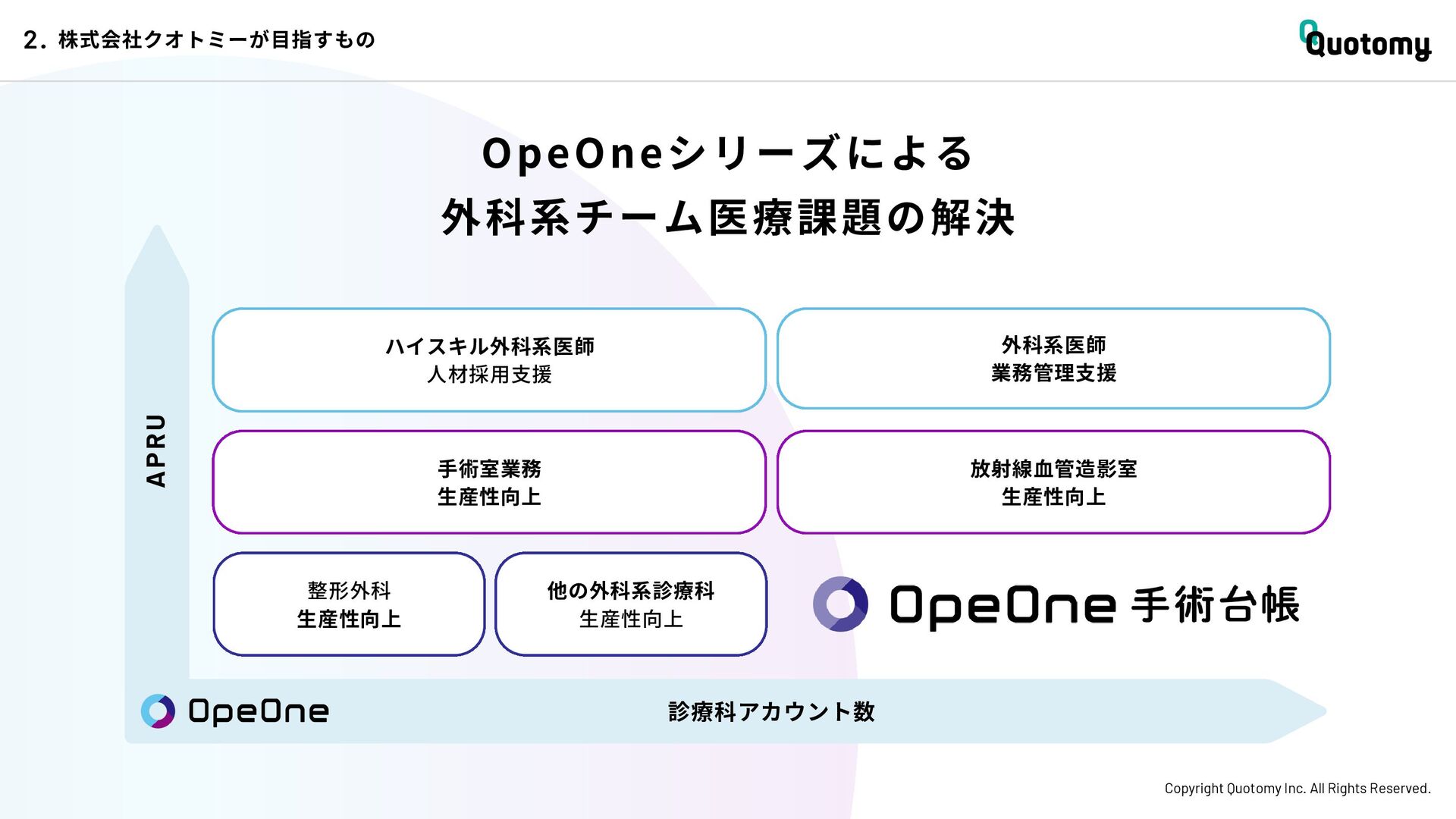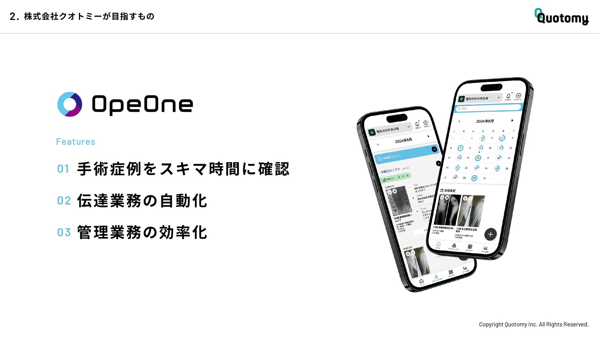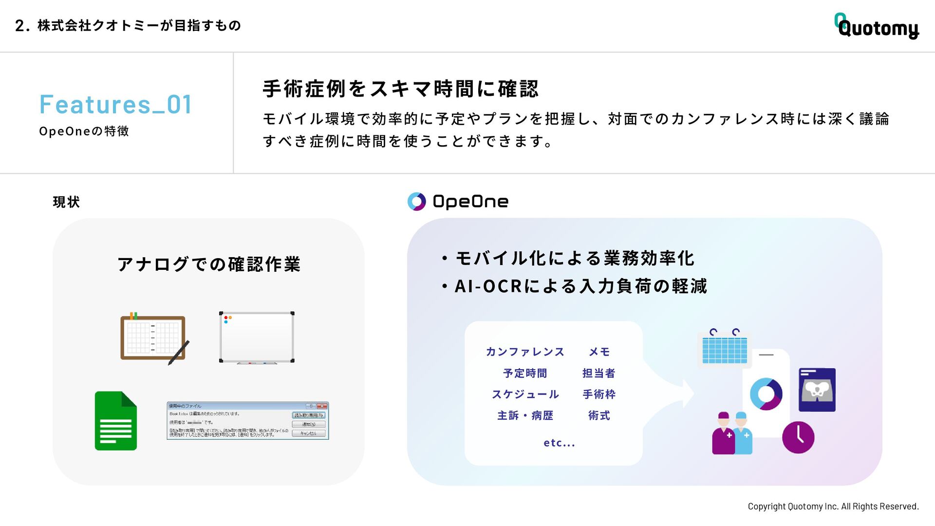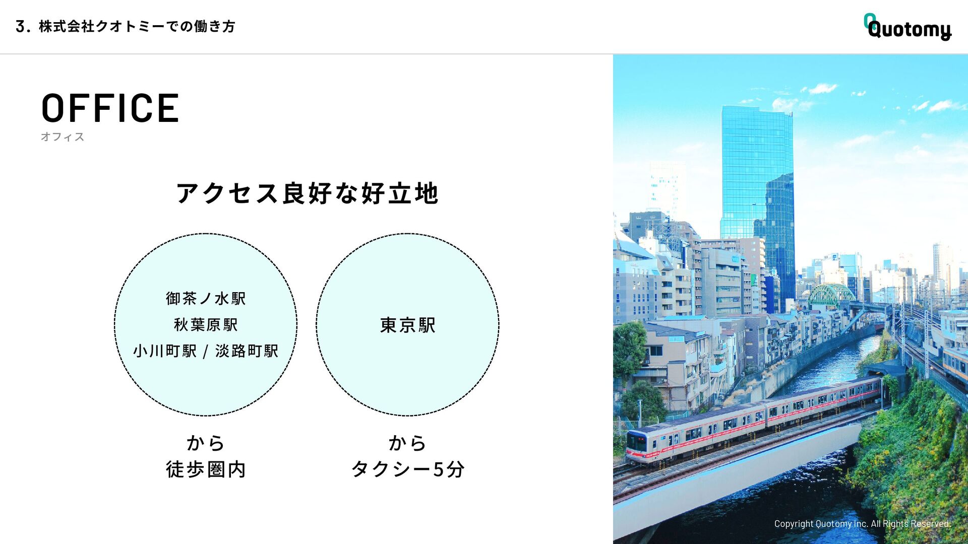 、 机 の 上 で 考 え て い て も 答 え が な い。 VALUE Copyright Quotomy Inc. All Rights Reserved. 株式会社クオトミーでの働き方 3. バリュー 率先して巻き込まれよ Be the 1st call 臨床現場でファーストコールを受ける医 師は忙しくて大変だ。けれども、たくさ んの挑戦を経験し、自分のスキルを高め て、活き活き働いているのは、いつだっ て彼らだ。 私たちも挑戦者。 率先して巻き込まれることで、成長し変 化する機会を得よう。 手触り感をもった 変革者たれ Upend status quo 常に胸に宣言を!! Declare it!! たくさんの「宣言」や「誓い」が医療者 の行動規範となっている。だから私たち も誓おう。 まず家族と自分の健康を第一に、医療情 報の秘匿性を遵守し、医療者の自立と尊 厳を追求することで、医療に貢献してい る誇りを持つことを。