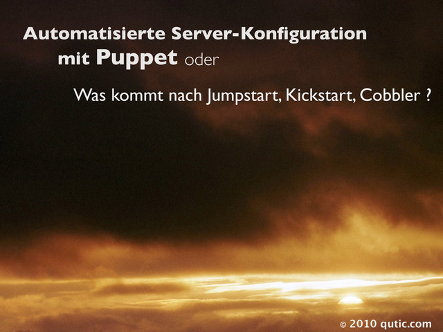 Mount, etc. ‣ Classes & Defines : Zusammenfassung von Resources ‣ Modules : Portierbare Classes, Defines (Apache-Module) ‣ Nodes : Hosts, die Classes, Defines und Resourcen includieren ‣ Variables : frei definierbare Variablen für IP, UID, PWD, etc. ‣ Templates : Konfigurationsdateien mit Variablen