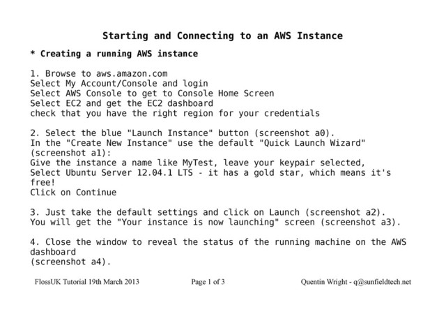 running AWS instance 1. Browse to aws.amazon.com Select My Account/Console and login Select AWS Console to get to Console Home Screen Select EC2 and get the EC2 dashboard check that you have the right region for your credentials 2. Select the blue "Launch Instance" button (screenshot a0). In the "Create New Instance" use the default "Quick Launch Wizard" (screenshot a1): Give the instance a name like MyTest, leave your keypair selected, Select Ubuntu Server 12.04.1 LTS - it has a gold star, which means it's free! Click on Continue 3. Just take the default settings and click on Launch (screenshot a2). You will get the "Your instance is now launching" screen (screenshot a3). 4. Close the window to reveal the status of the running machine on the AWS dashboard (screenshot a4). FlossUK Tutorial 19th March 2013 Page 1 of 3 Quentin Wright - [email protected]