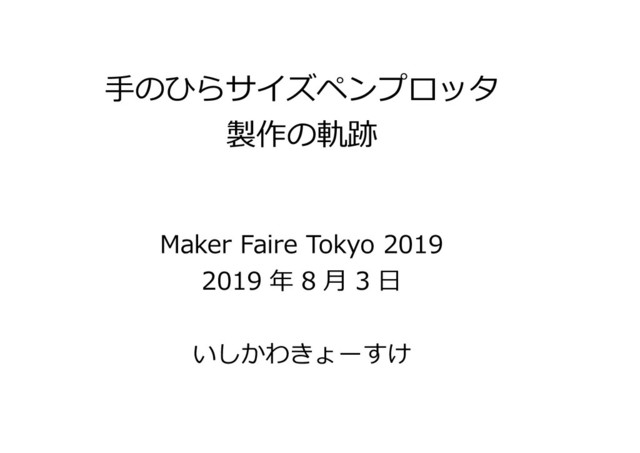 Maker Faire Tokyo 2019 でのプレゼンテーションで使用したスライドです。5年前から作り続けている手のひらサイズペンプロッタの概要と軌跡、ペンプロッタを作るモチベーションについて紹介しています。
