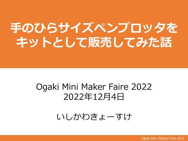 Ogaki Mini Maker Faire 2022 本プレゼンテーションについて ・趣味の活動の延長でメカトロハードウェアのキット販売に 踏み切った経緯や、販売を始めてから感じたこと話します ・同人ハードウェアに興味のある方や、 趣味の延長で何か販売してみようかなと
