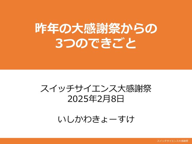 スイッチサイエンス大感謝祭 昨年の大感謝祭からの 3つのできごと スイッチサイエンス大感謝祭 2025年2月8日 いしかわきょーすけ
