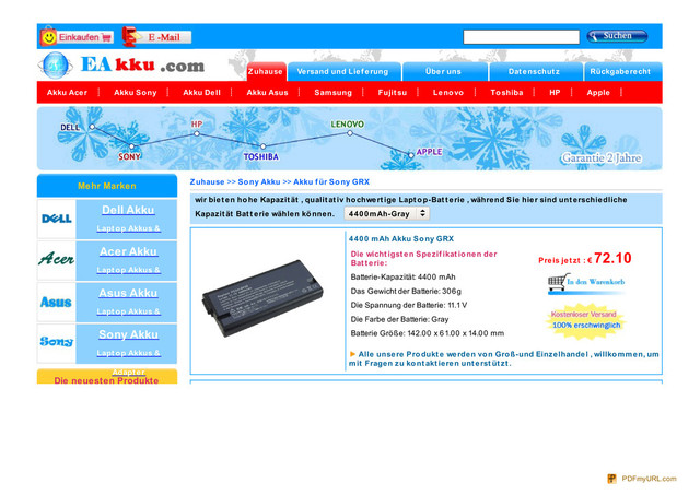 : Jetzt auf Lager Garantie : 2 Jahre Modell : Sony Die Farbe des Produkts : schwarz Produkt Status : neue Produkte Preis jet zt : € 30.28 Willkommen in unserem Online-Shop , sind alle unsere Produkt e direkt ab Werk Verkauf , 100% nagelneu . + = Packung Preis:91.80 € Beschreibung Kompat ible Produkt e Bet rof f ene Modelle Kaufen 4400mAh Sony GRX Batterien und Adapter mehr sparen . Hochleistungs Li-Ion Qualitäts Akku Mit diesem starken Li-Ionen-Akku ersteigern Sie ein Qualitätsprodukt. Dieser Akku ist absolut kompat ibel zu dem Original Sony GRX Akku. Die Akkus sind nach höchsten Qualitätsstandards hergestellt, zeichen sich durch Langlebigkeit aus und sind in der Verwendung wie die Original Akkus. Genauso wie der Original Akku besitzen diese Akkus alle elektronischen Sicherheitsmechanismen. Technische Daten: - Hochleistungs Li-Ion Sony GRX Bat t erie -aus hochwertigen Qualitätszellen -kein Originalprodukt, 100% kompatibel zum Original Akku - kann mit jedem Standard oder Kompatibel Akkus fur Sony GRX netzteil aufgeladen werden Laptop Akku Sony GRX 4400 mAh-11.1v Preis jetzt : € 72.10 Notebook-Akku Sony VGP-BPS26 4400mAh-10.8V Preis jetzt : € 64.94 Batterien für Dell XPS M1710 5200mAh-11.1v Preis jetzt : € 52.00 DELL Vostro V131 Laptop Batterie 44Wh -14.8V Preis jetzt : € 119.59 DELL Akku Vostro 3700 5200mAh-11.1v Preis jetzt : € 49.60 Batterie Dell Studio 1745 5200mAh-11.1v Preis jetzt : € 54.99 DELL Akku Latitude E6530 97Wh-10.8V Preis jetzt : € 89.69 Laptop Akku für ASUS X75V 56Wh-10.8V Preis jetzt : € 62.72 Die neuesten Produkte PDFmyURL.com
