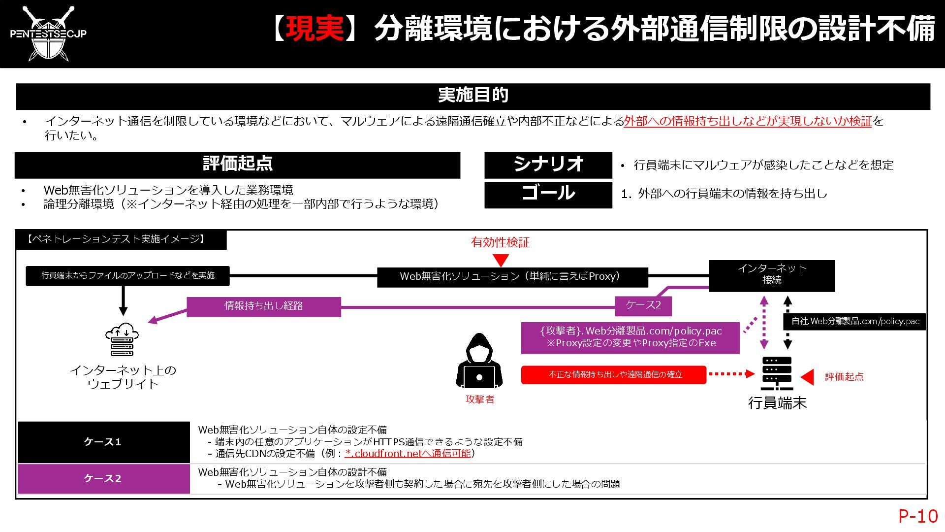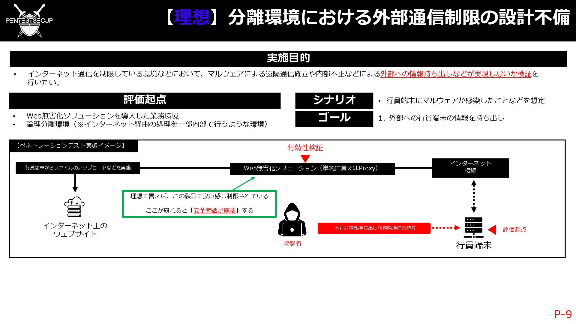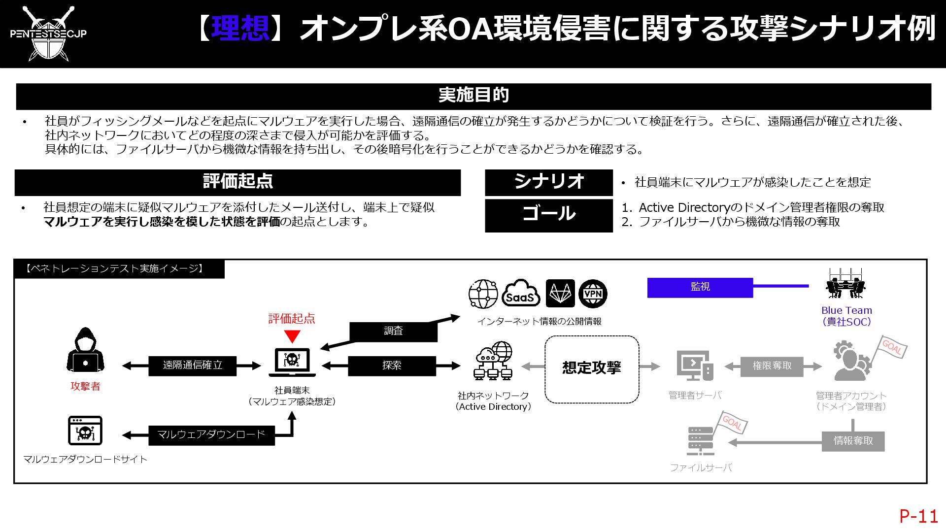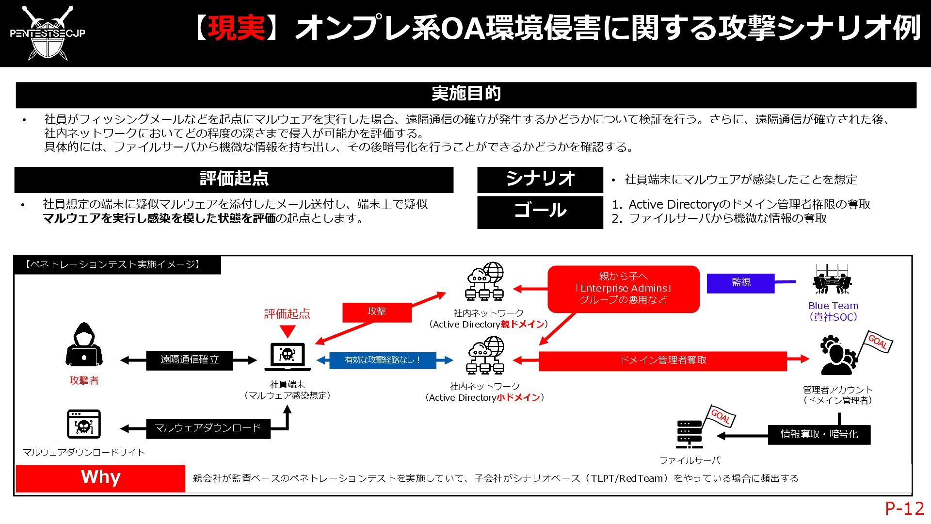 社員想定の端末に疑似マルウェアを添付したメール送付し、端末上で疑似 マルウェアを実行し感染を模した状態を評価の起点とします。 シナリオ • 社員端末にマルウェアが感染したことを想定 ゴール 1. Active Directoryのドメイン管理者権限の奪取 2. ファイルサーバから機微な情報の奪取 社員端末 (マルウェア感染想定) マルウェアダウンロードサイト 評価起点 マルウェアダウンロード 社内ネットワーク (Active Directory小ドメイン) 有効な攻撃経路なし! ドメイン管理者奪取 管理者アカウント (ドメイン管理者) ファイルサーバ 情報奪取・暗号化 攻撃 社内ネットワーク (Active Directory親ドメイン) 親から子へ 「Enterprise Admins」 グループの悪用など 【ペネトレーションテスト実施イメージ】 実施目的 • 社員がフィッシングメールなどを起点にマルウェアを実行した場合、遠隔通信の確立が発生するかどうかについて検証を行う。さらに、遠隔通信が確立された後、 社内ネットワークにおいてどの程度の深さまで侵入が可能かを評価する。 具体的には、ファイルサーバから機微な情報を持ち出し、その後暗号化を行うことができるかどうかを確認する。 Why 親会社が監査ベースのペネトレーションテストを実施していて、子会社がシナリオベース(TLPT/RedTeam)をやっている場合に頻出する