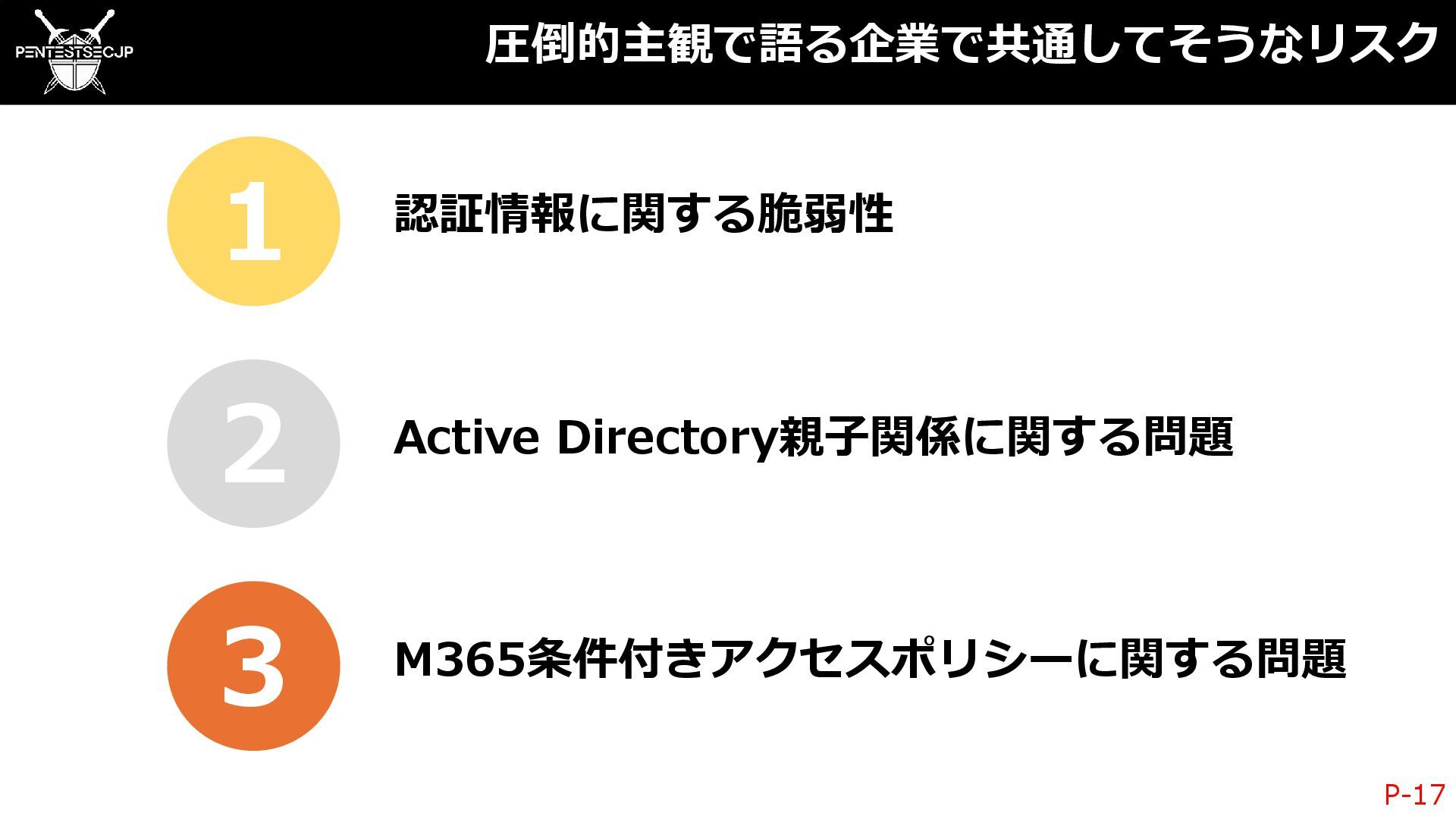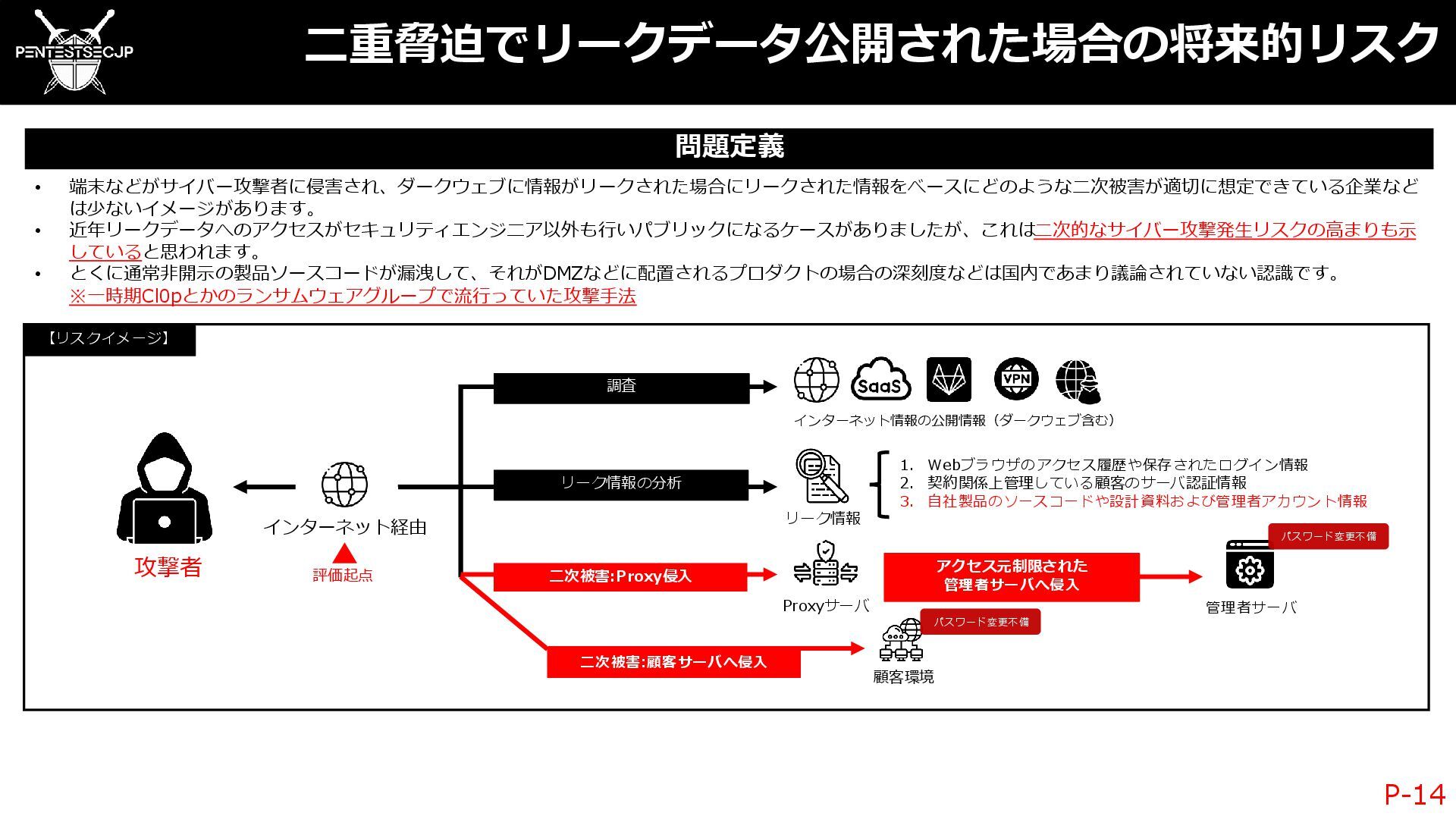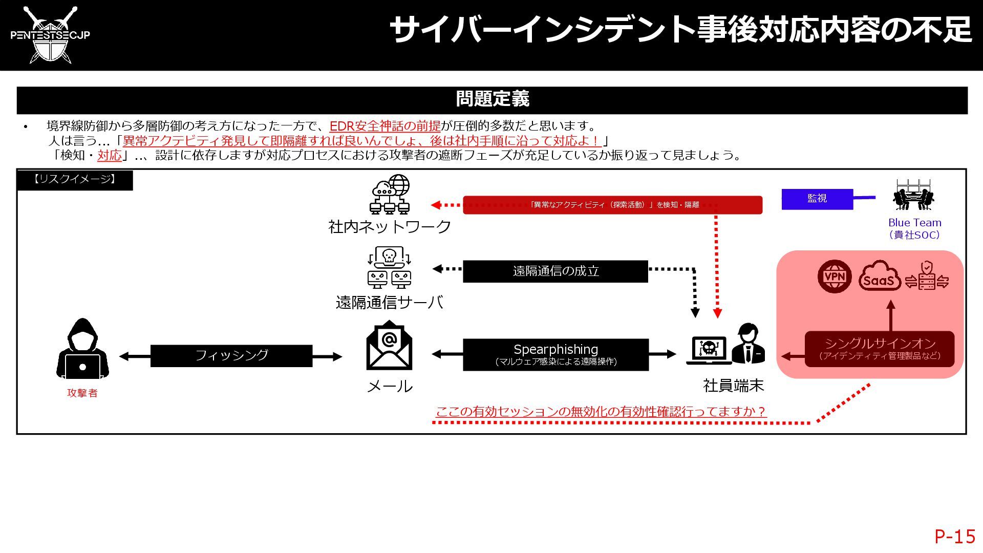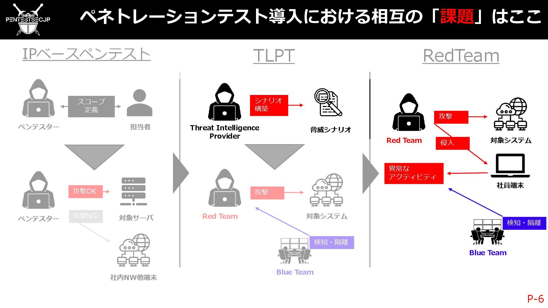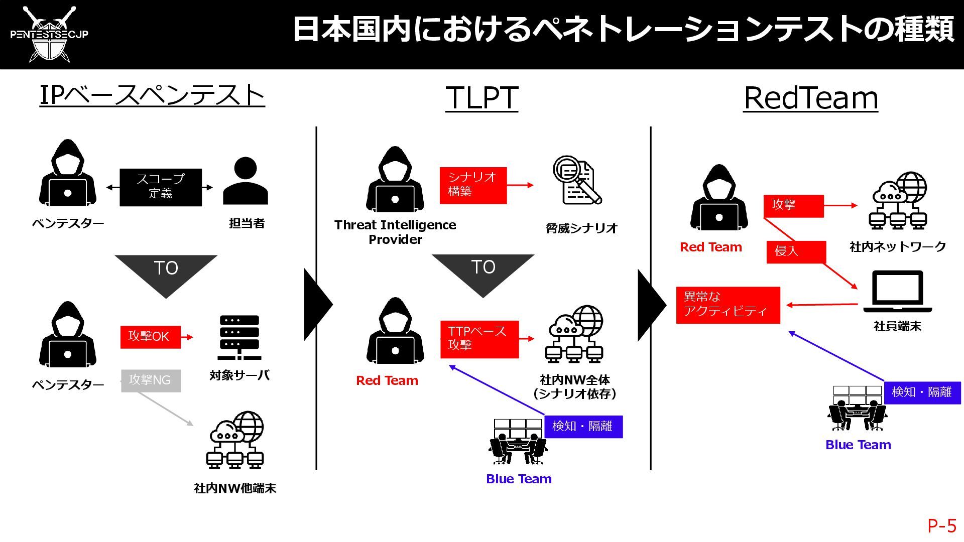 社員想定の端末に疑似マルウェアを添付したメール送付し、端末上で疑似 マルウェアを実行し感染を模した状態を評価の起点とします。 シナリオ • 社員端末にマルウェアが感染したことを想定 ゴール 1. Active Directoryのドメイン管理者権限の奪取 2. ファイルサーバから機微な情報の奪取 社員端末 (マルウェア感染想定) マルウェアダウンロードサイト 評価起点 マルウェアダウンロード 社内ネットワーク (Active Directory小ドメイン) 有効な攻撃経路なし! ドメイン管理者奪取 管理者アカウント (ドメイン管理者) ファイルサーバ 情報奪取・暗号化 攻撃 社内ネットワーク (Active Directory親ドメイン) 親から子へ 「Enterprise Admins」 グループの悪用など 【ペネトレーションテスト実施イメージ】 実施目的 • 社員がフィッシングメールなどを起点にマルウェアを実行した場合、遠隔通信の確立が発生するかどうかについて検証を行う。さらに、遠隔通信が確立された後、 社内ネットワークにおいてどの程度の深さまで侵入が可能かを評価する。 具体的には、ファイルサーバから機微な情報を持ち出し、その後暗号化を行うことができるかどうかを確認する。 Why 親会社が監査ベースのペネトレーションテストを実施していて、子会社がシナリオベース(TLPT/RedTeam)をやっている場合に頻出する