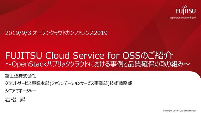 Service for OSSのOpenStack基盤の設計・開発責任者 富士通研究所入社、OS・仮想化・クラウドの研究に従事した後、2016年より現所属で クラウド基盤開発の指揮を執る。 オープンソースとは開発者として10数年の関わり • OpenStack, Xen, Linux, QEMU, cobbler, MidoNetなどにコントリビュート 最近の発表 • OpenStack Days Tokyo 2019 「FUJITSU Cloud Service for OSSにおけるOpenStack ユーザーストーリーズ」 • OpenStack Days Tokyo 2018 「FUJITSU Cloud Service for OSSを支えるコンテナとCI/CD技術」 • Ansible Night Tokyo 2017.12 「OpenStackをAnsibleで操る!」 • OpenStack Summit Sydney 2018 「Lift-and-Shift Enterprise Workloads to K5 Bare Metal Service」 Copyright 2019 FUJITSU LIMITED 1
