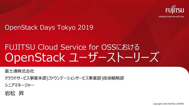 Service for OSSのOpenStack基盤の設計・開発責任者 富士通研究所にて、OS/仮想化/クラウドの研究開発に従事した後、現所属に異動 オープンソースとは開発者として10数年の関わり • OpenStack, Xen, Linux, QEMU, cobbler, MidoNetなどにコントリビュート 最近の発表 • OpenStack Days Tokyo 2018 「FUJITSU Cloud Service for OSSを支えるコンテナとCI/CD技術」 • Ansible Night Tokyo 2017.12 「OpenStackをAnsibleで操る!」 • OpenStack Summit Sydney 2018 「Lift-and-Shift Enterprise Workloads to K5 Bare Metal Service」 Copyright 2019 FUJITSU LIMITED 1