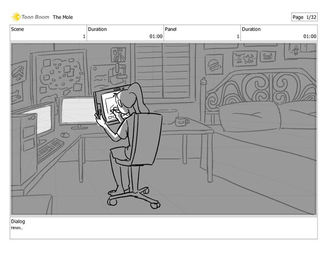 Scene 3 Duration 04:00 Panel 1 Duration 01:00 Dialog Hmm..