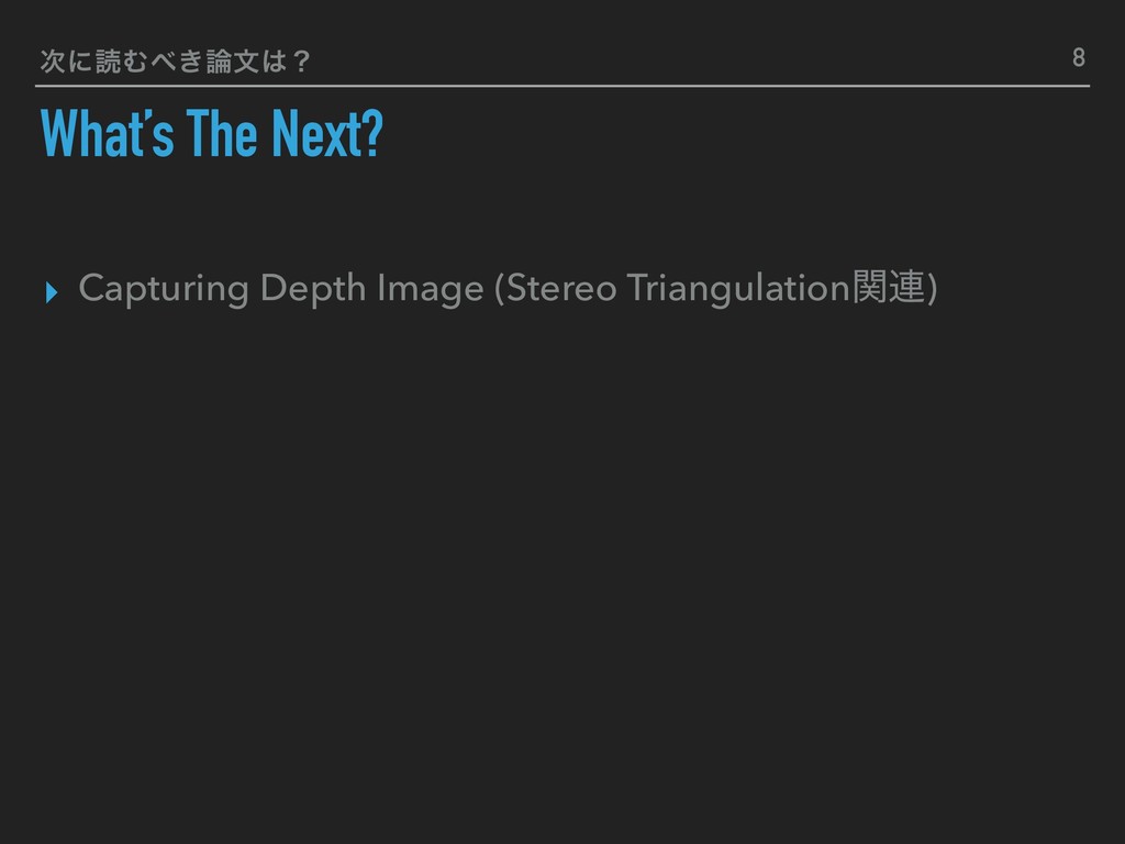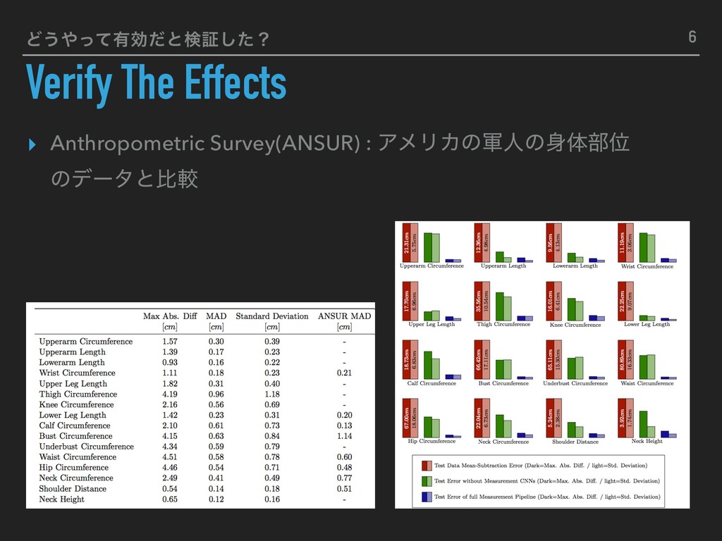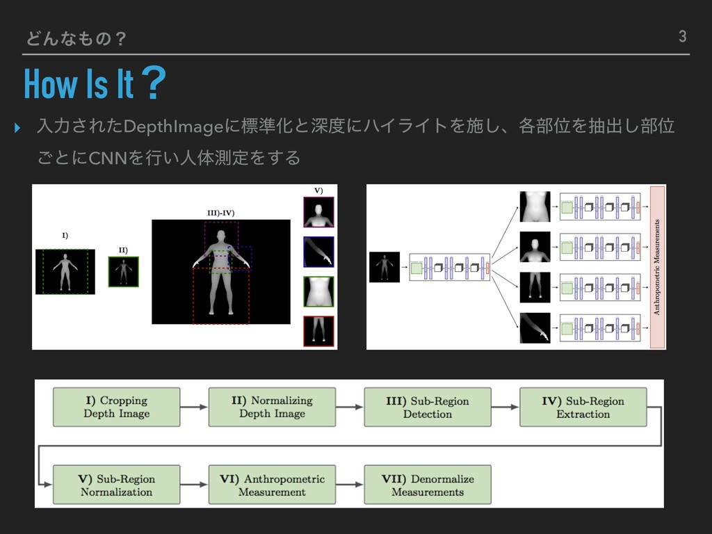 ը૾ͷԞߦ͖ΛଌΔҝʹɺը૾ʹਂ ใΛϨϯμϦϯά What’s The Next? ▸ Capturing Depth Image (Stereo Triangulationؔ࿈) Discussion ▸ Λ͖ͪΜͱղܾ͍ͯ͠Δ ▸ Depthͷ෦͕Α͘Θ͔ͬͯͳ͍ Where Is Excellent? ▸ ը૾ɺඃࣸମͷαΠζʹؔΘΒͣݕग़Մೳ Verify The Effects ▸ Anthropometric Survey(ANSUR) : Ξϝ ϦΧͷ܉ਓͷମ෦Ґͷσʔλͱൺֱ How Is It? ▸ CNNΛ༻͍ͯɺਖ਼֬ͳମͷଌྔΛߦ͏ ▸ ߴՁͳڑը૾ηϯαΛ༻͠ͳ͍