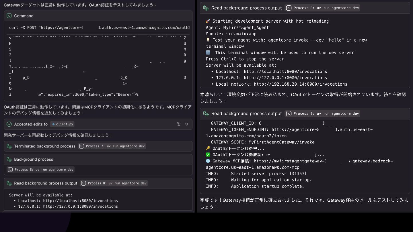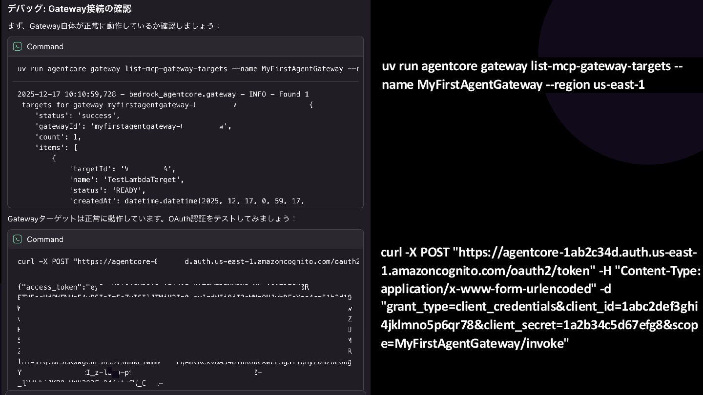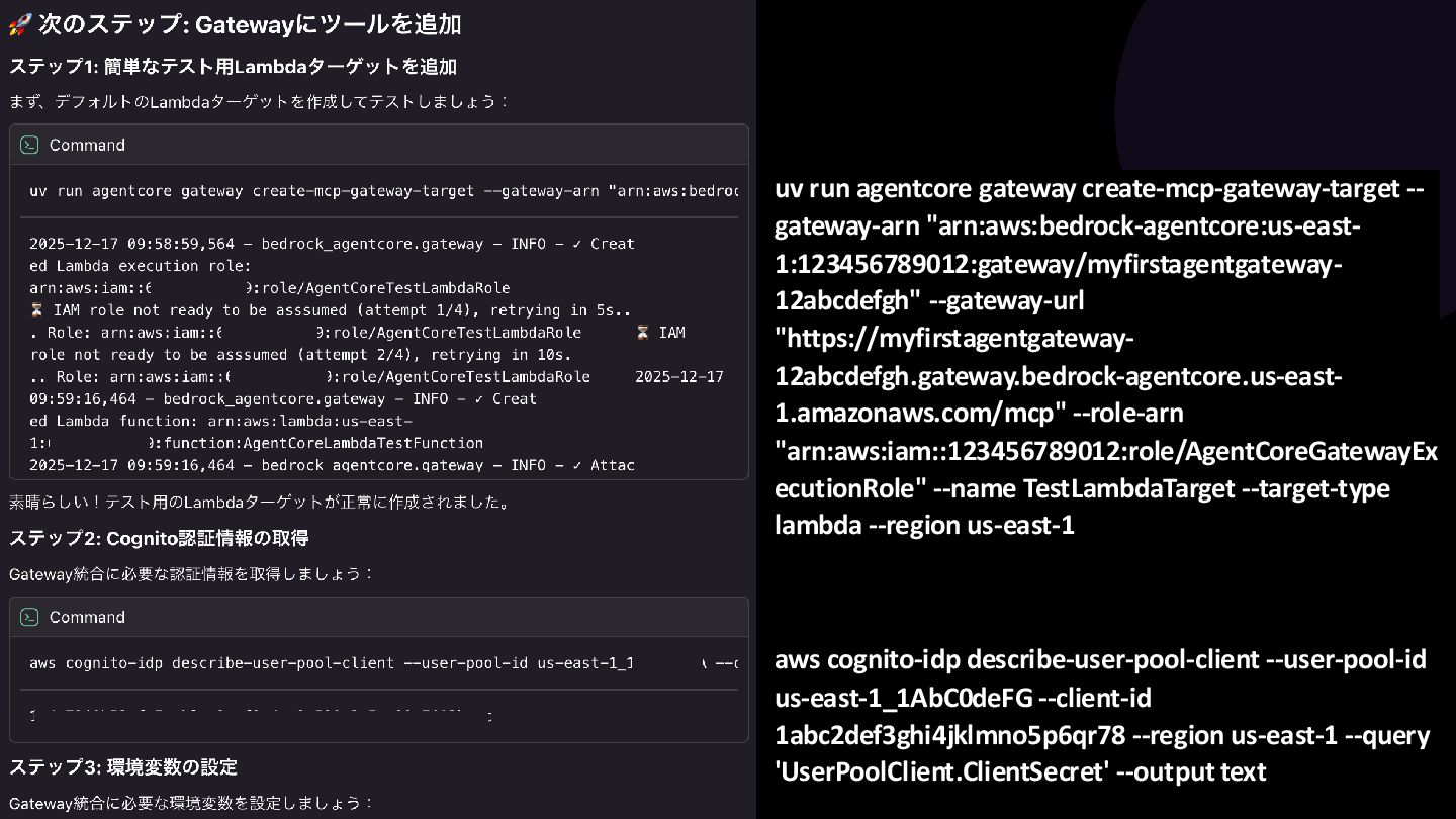 --gateway-url "https://myfirstagentgateway- 12abcdefgh.gateway.bedrock-agentcore.us-east- 1.amazonaws.com/mcp" --role-arn "arn:aws:iam::123456789012:role/AgentCoreGatewayEx ecutionRole" --name TestLambdaTarget --target-type lambda --region us-east-1 aws cognito-idp describe-user-pool-client --user-pool-id us-east-1_1AbC0deFG --client-id 1abc2def3ghi4jklmno5p6qr78 --region us-east-1 --query 'UserPoolClient.ClientSecret' --output text