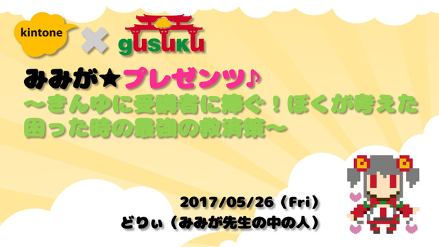 みみが先生の中の人が登壇した2017年5月26日(金)に開催されたkintone university 受講者懇親会 vol.3のLT資料です♪
