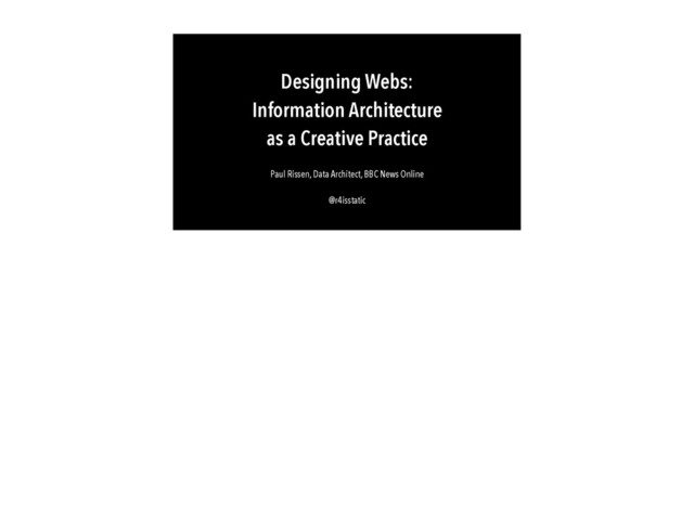text written or quoted therein, is a link to other words, thoughts and ideas." James Bridle @r4isstatic The hyperlink isn't necessarily something new - it's revealing to us that even our most traditional forms of literature and art have always been hyperlinked. We've just never had the medium to truly express this possibility. In case I haven't made myself clear, I believe that data is the natural form for the medium we all work in. And that when we're considering a creative approach to information architecture, the screens, the journeys, the personas are not the point. Designing, sculpting the data into the right, useful and/or delightful shapes - that is the key.