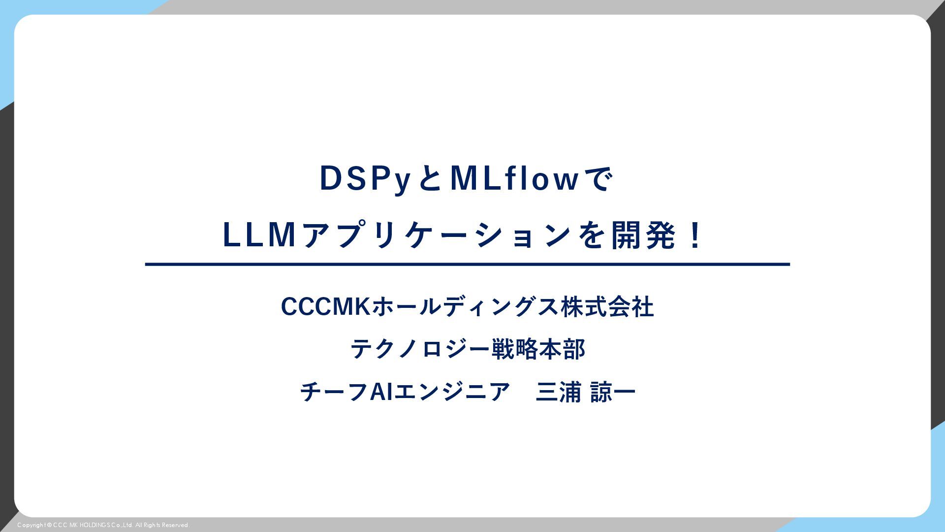 © CCC MK HOLDINGS Co.,Ltd. All Rights Reserved. DSPyとMLflowで LLMアプリケーションを開発! CCCMKホールディングス株式会社 テクノロジー戦略本部 チーフAIエンジニア 三浦 諒一