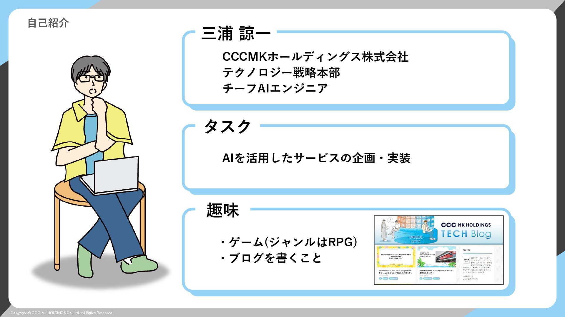 © CCC MK HOLDINGS Co.,Ltd. All Rights Reserved. v v v v v v 自己紹介 三浦 諒一 CCCMKホールディングス株式会社 テクノロジー戦略本部 チーフAIエンジニア タスク AIを活用したサービスの企画・実装 趣味 ・ゲーム(ジャンルはRPG) ・ブログを書くこと