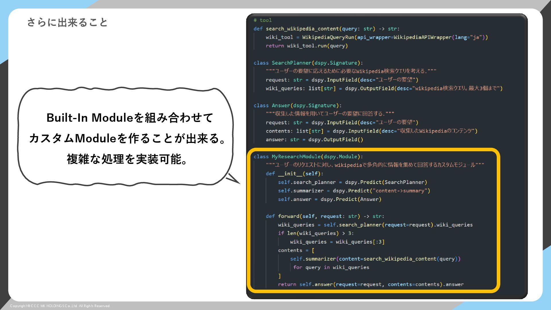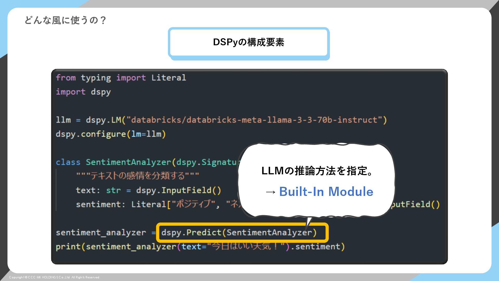 © CCC MK HOLDINGS Co.,Ltd. All Rights Reserved. どんな風に使うの? v DSPyの構成要素 LLMの推論方法を指定。 → Built-In Module