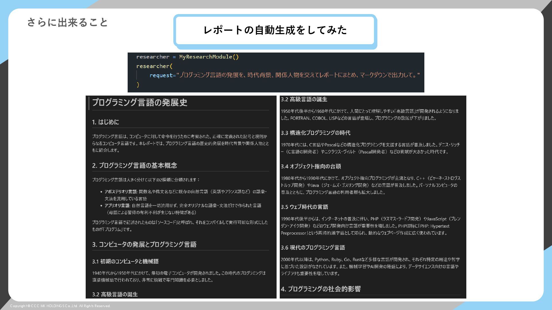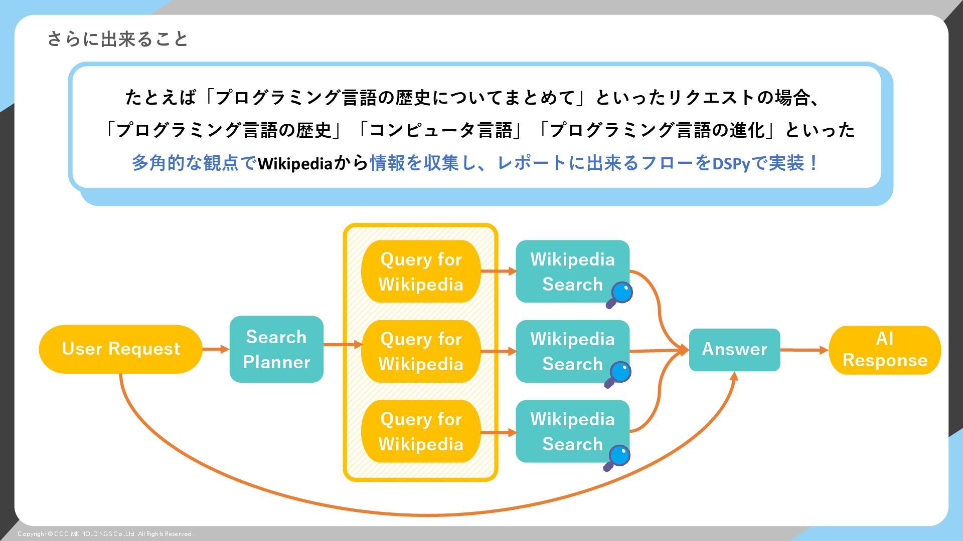 © CCC MK HOLDINGS Co.,Ltd. All Rights Reserved. さらに出来ること User Request Query for Wikipedia Query for Wikipedia Query for Wikipedia Search Planner Wikipedia Search Wikipedia Search Wikipedia Search Answer v たとえば「プログラミング言語の歴史についてまとめて」といったリクエストの場合、 「プログラミング言語の歴史」「コンピュータ言語」「プログラミング言語の進化」といった 多角的な観点でWikipediaから情報を収集し、レポートに出来るフローをDSPyで実装! AI Response