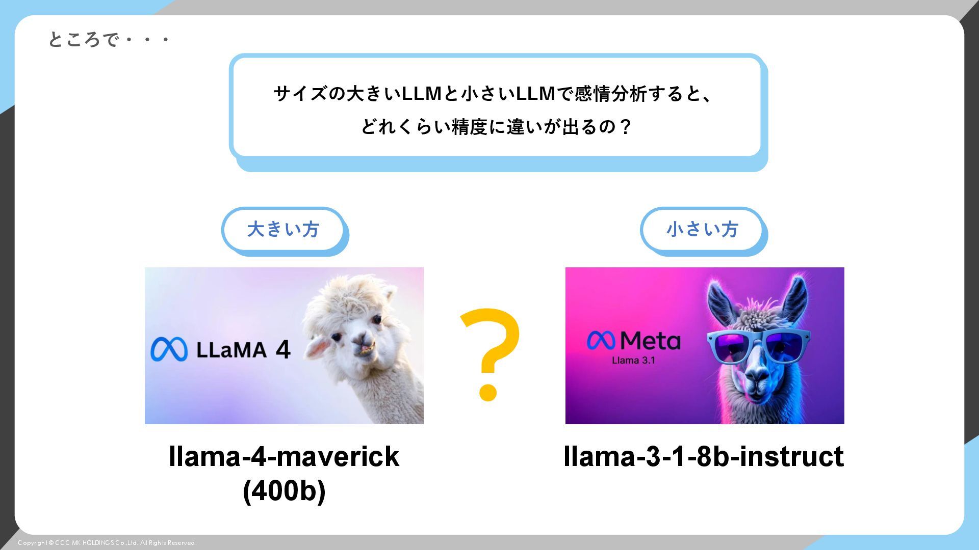 © CCC MK HOLDINGS Co.,Ltd. All Rights Reserved. ところで・・・ v サイズの大きいLLMと小さいLLMで感情分析すると、 どれくらい精度に違いが出るの? llama-4-maverick (400b) llama-3-1-8b-instruct 大きい方 小さい方