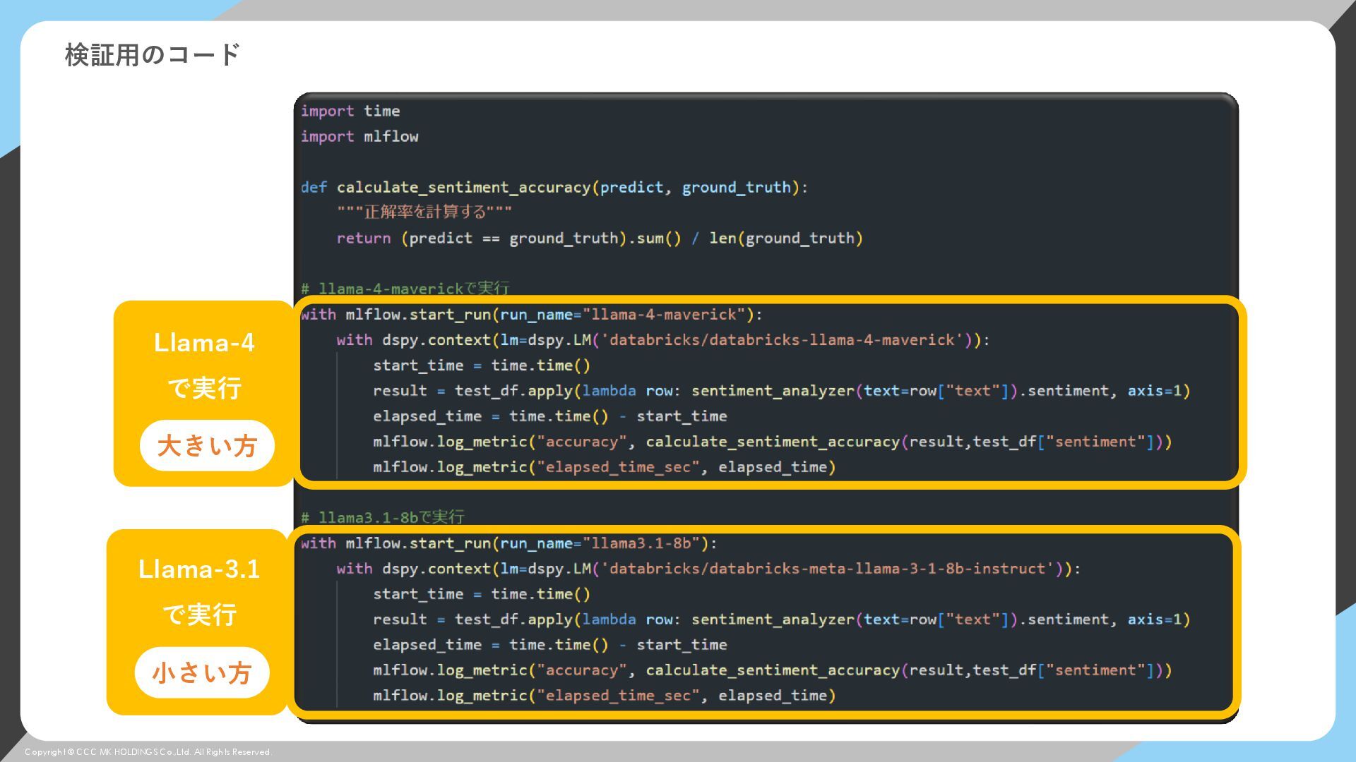 © CCC MK HOLDINGS Co.,Ltd. All Rights Reserved. 検証用のコード Llama-4 で実行 Llama-3.1 で実行 大きい方 小さい方